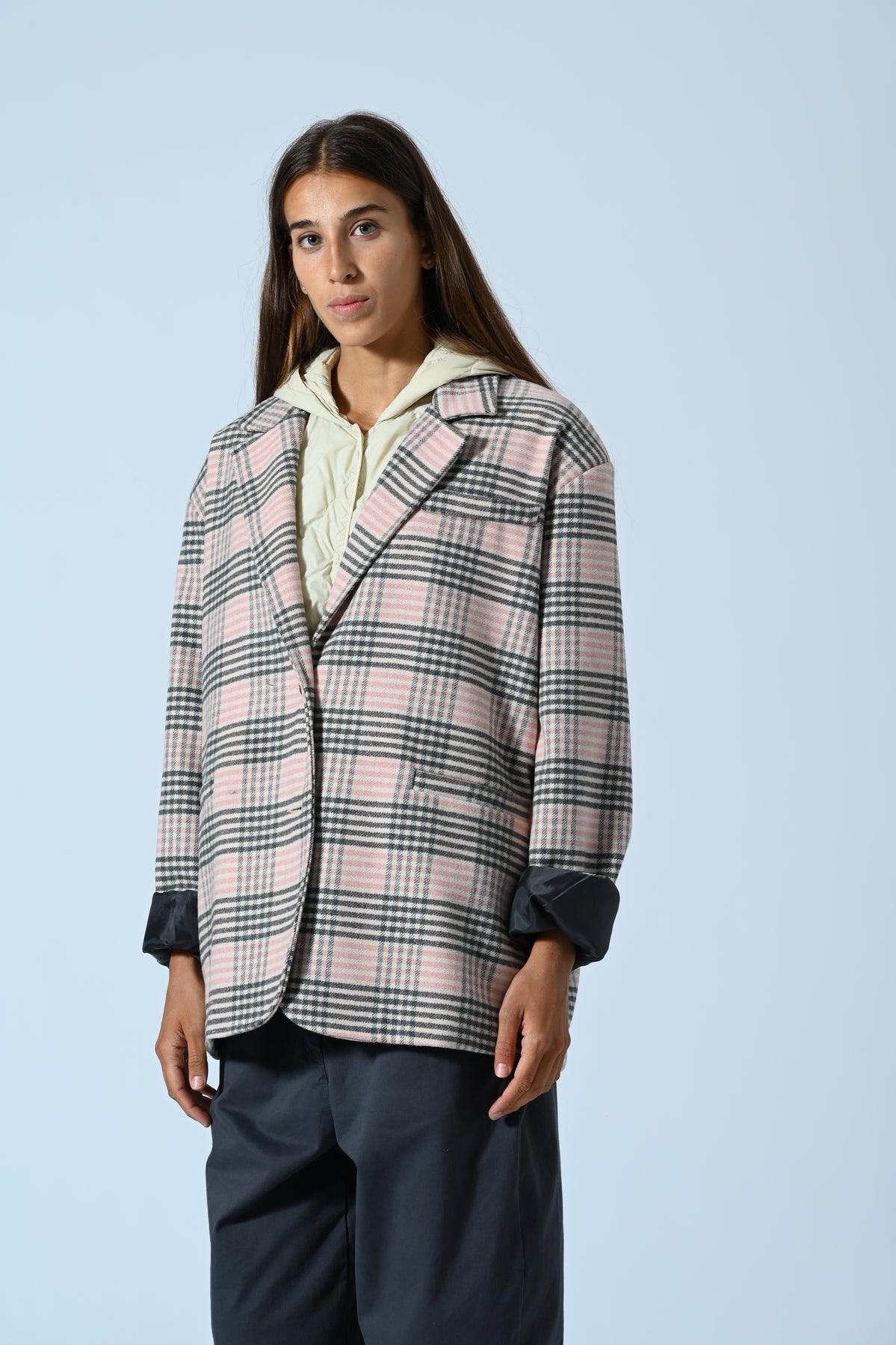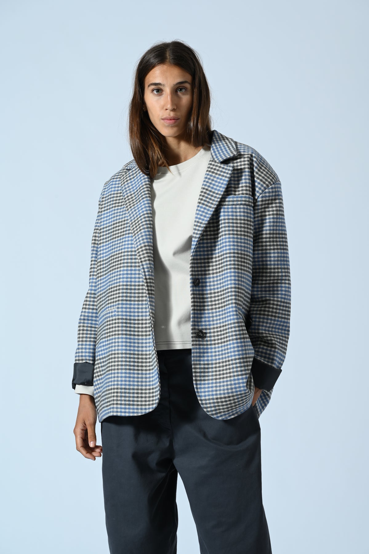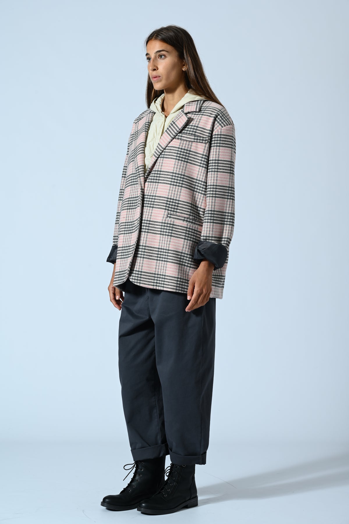 La giacca lunga in misto lana con fantasia check reinterpreta un grande classico in chiave moderna. Il fit over regala carattere e comfort, rendendola perfetta da indossare come capospalla leggero nelle mezze stagioni o da sovrapporre a look stratificati per l’inverno.