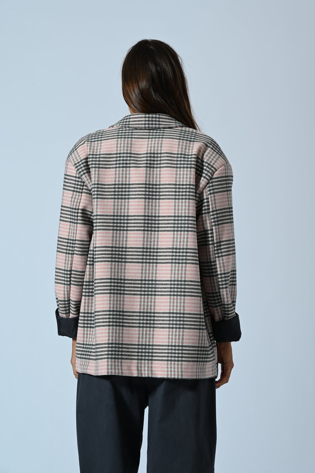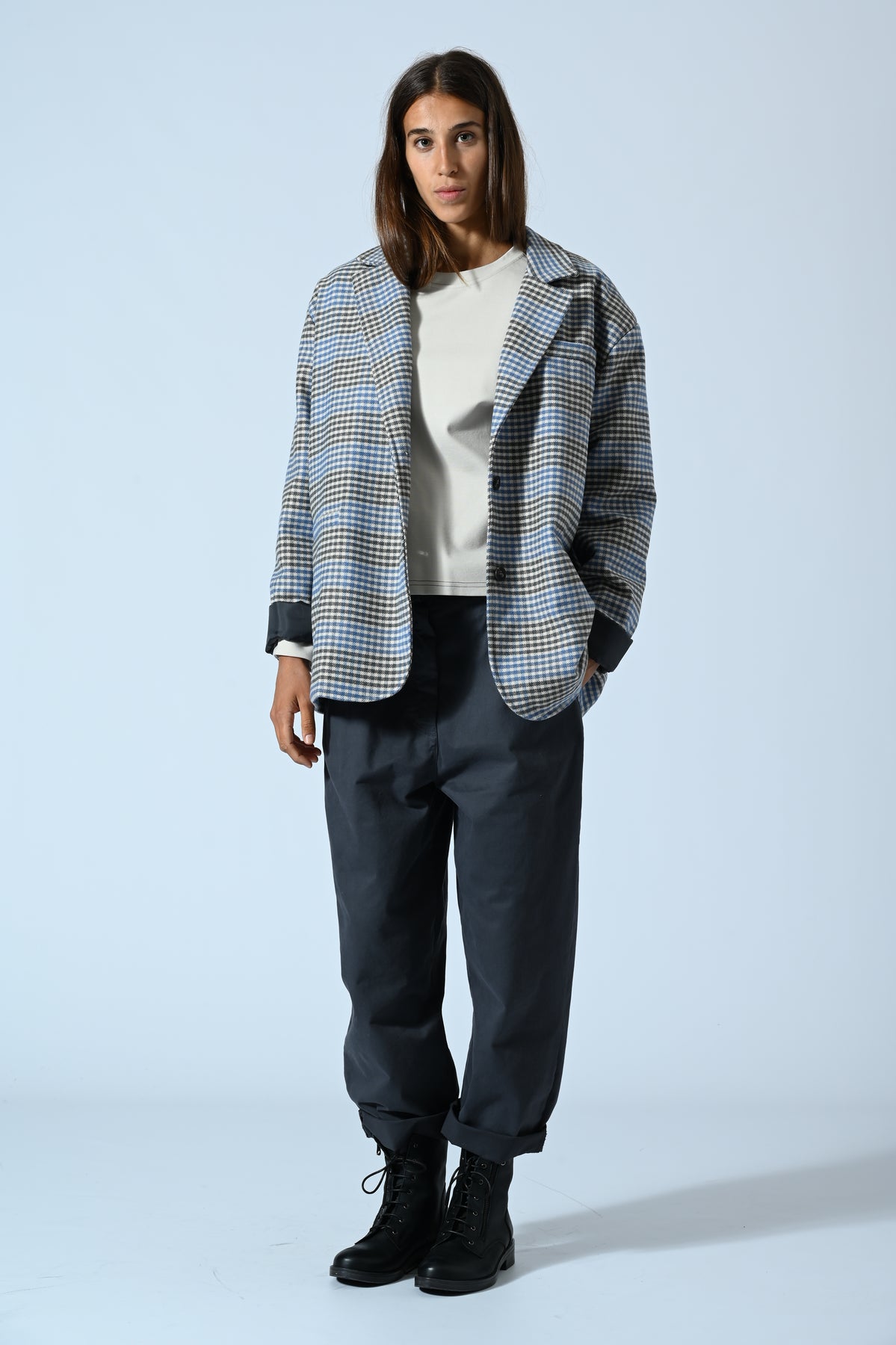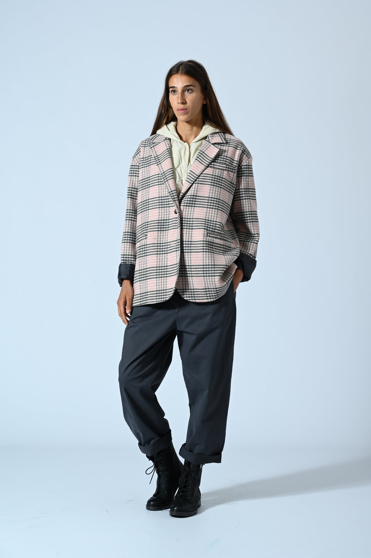 La giacca lunga in misto lana con fantasia check reinterpreta un grande classico in chiave moderna. Il fit over regala carattere e comfort, rendendola perfetta da indossare come capospalla leggero nelle mezze stagioni o da sovrapporre a look stratificati per l’inverno.