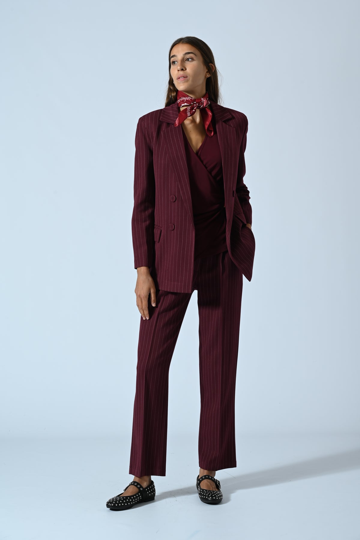 Il blazer a doppiopetto in tessuto gessato è l'emblema di un'eleganza senza tempo. La trama sottile dona un tocco raffinato, mentre il taglio doppio petto valorizza la silhouette con sicurezza e stile. Perfetto per un look professionale o sofisticato, questo capo versatile arricchisce ogni outfit con carattere e classe.