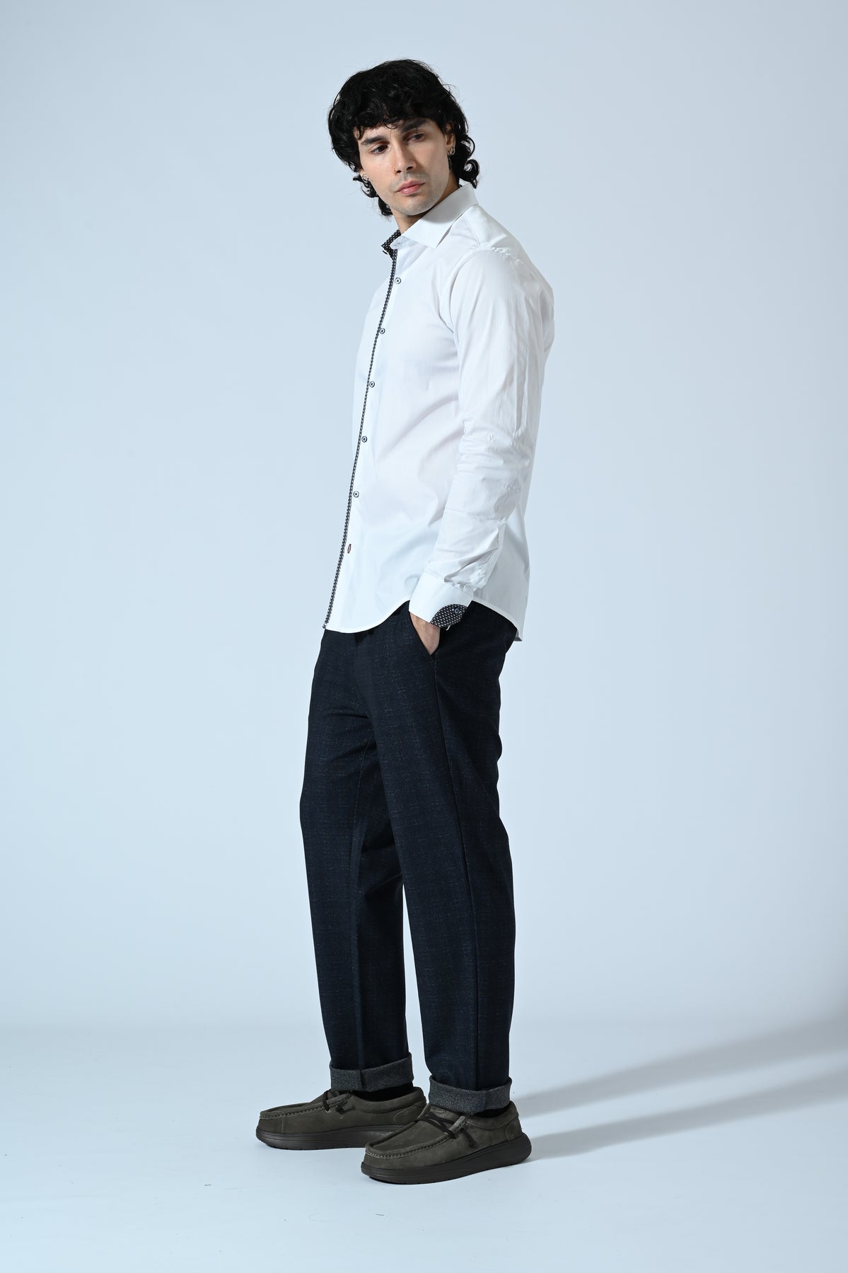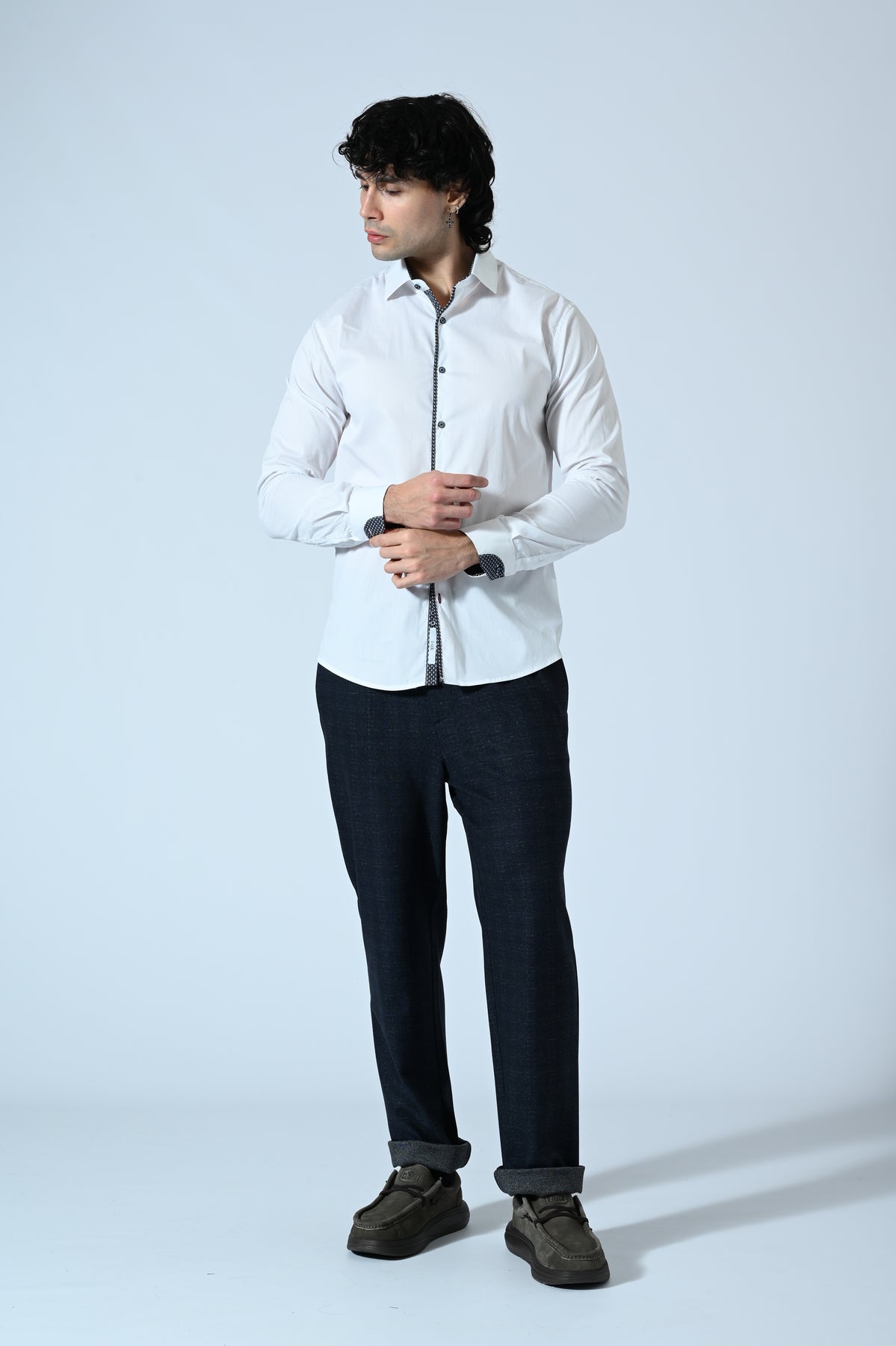 Camicia in cotone tinta unita, arricchita da inserti fantasia per un dettaglio moderno e distintivo. Linea versatile e confortevole, ideale per look smart-casual o casual-chic, perfetta da abbinare a pantaloni chino o jeans per outfit contemporanei.