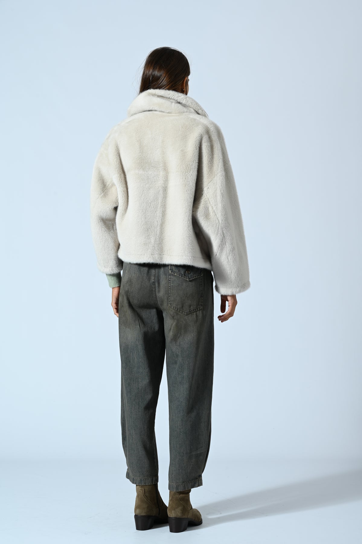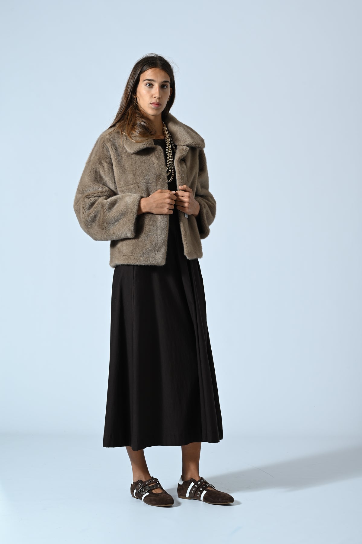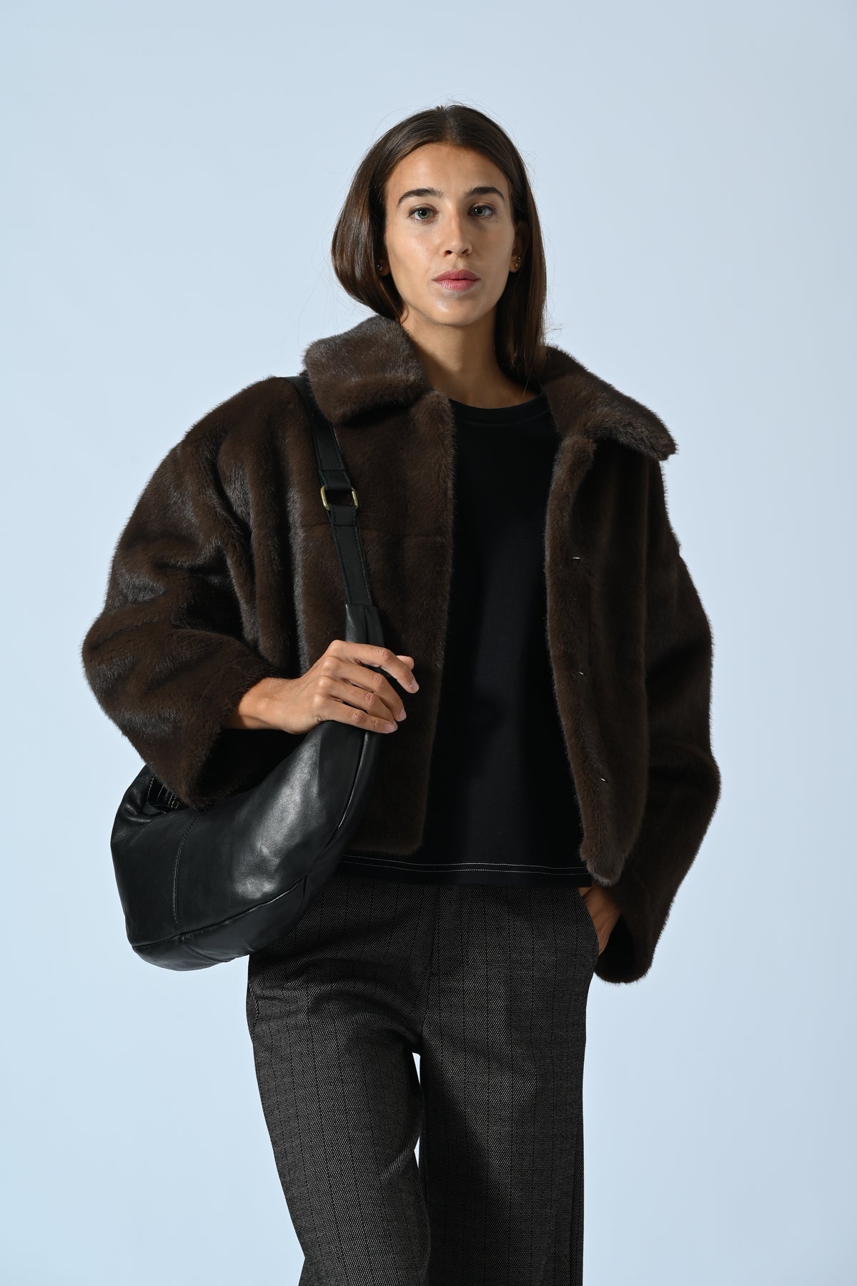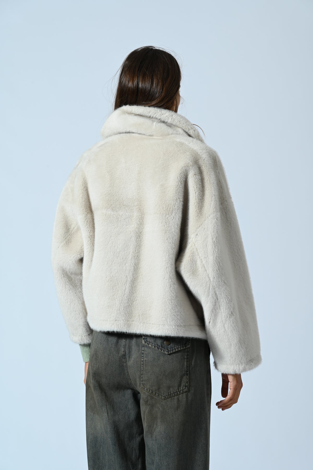 Ecopelliccia modello corto dal design contemporaneo e raffinato. Il rever ampio e ben strutturato definisce il carattere del capo, donandogli un’allure decisa e femminile. Morbida, calda e versatile, è ideale per completare look urban o più eleganti con un tocco di stile ricercato.