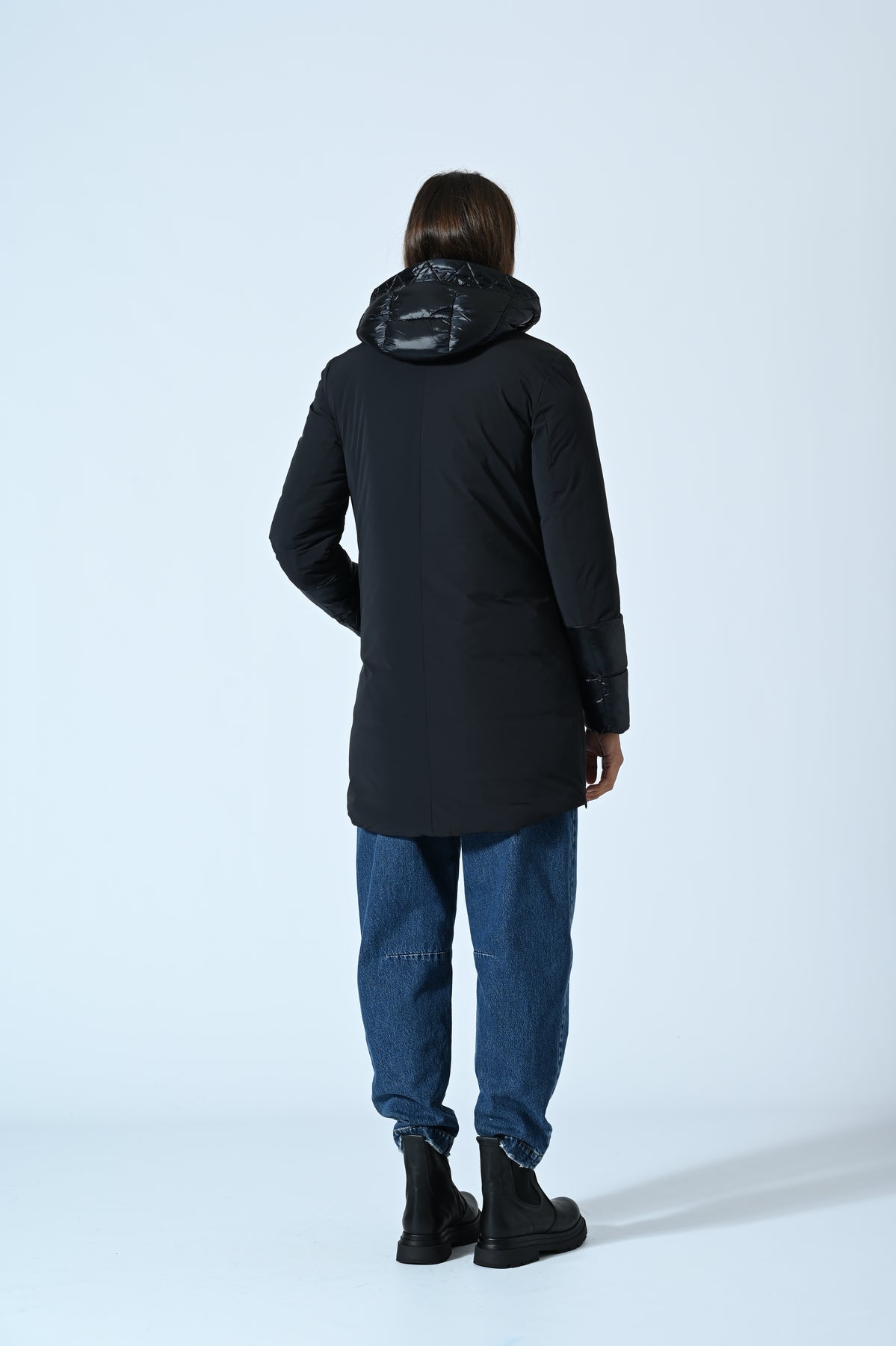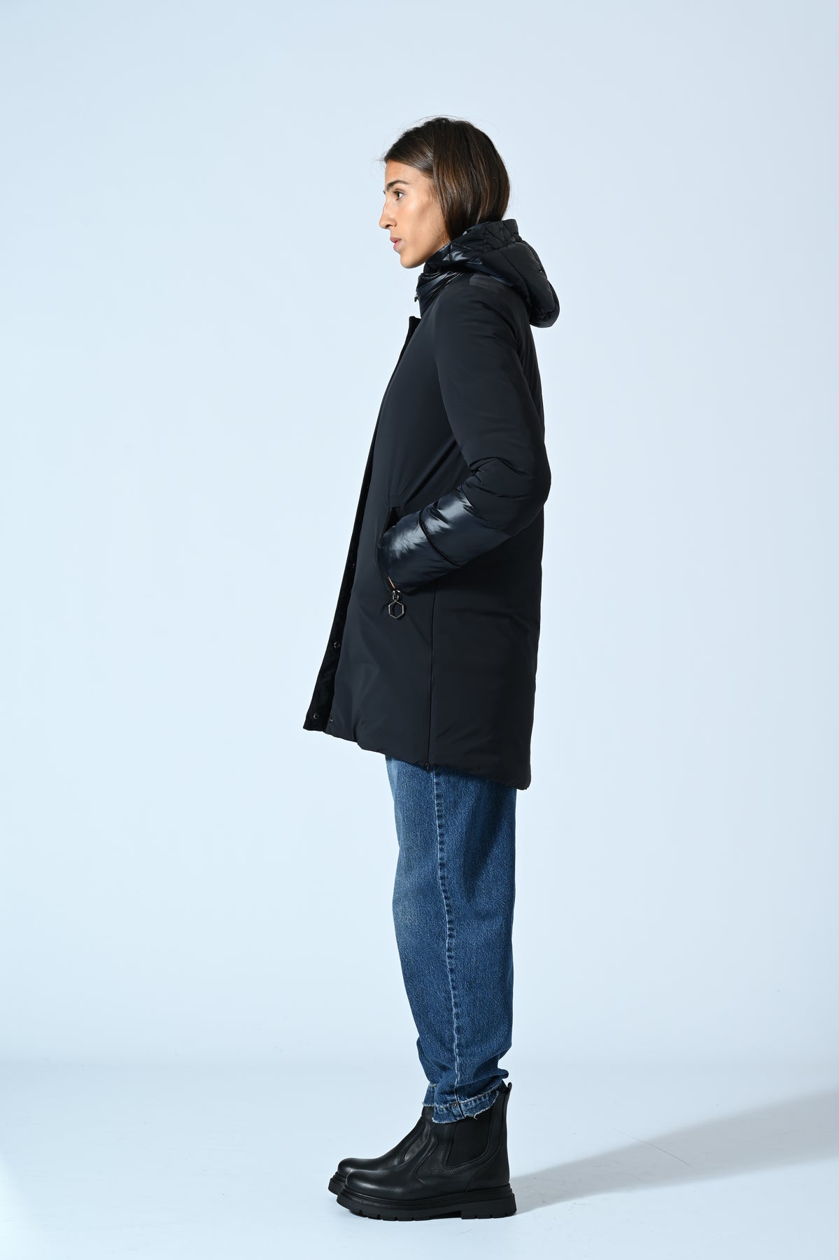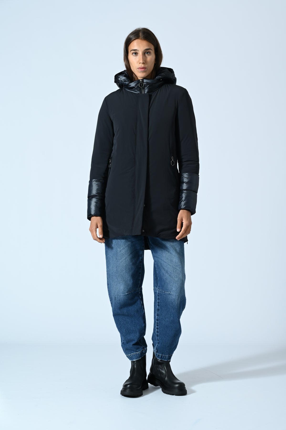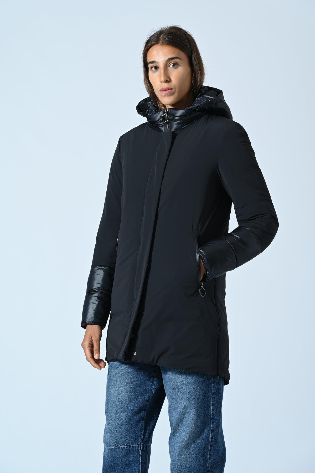 Ecopiumino lungo con cappuccio e doppio tessuto: panno sul corpo e nylon su cappuccio e polsi. Caldo, leggero e dallo stile contemporaneo, perfetto per look urbani invernali.