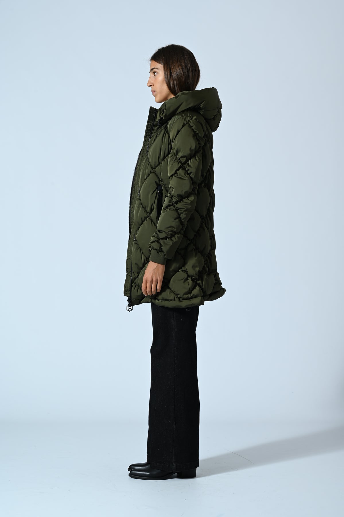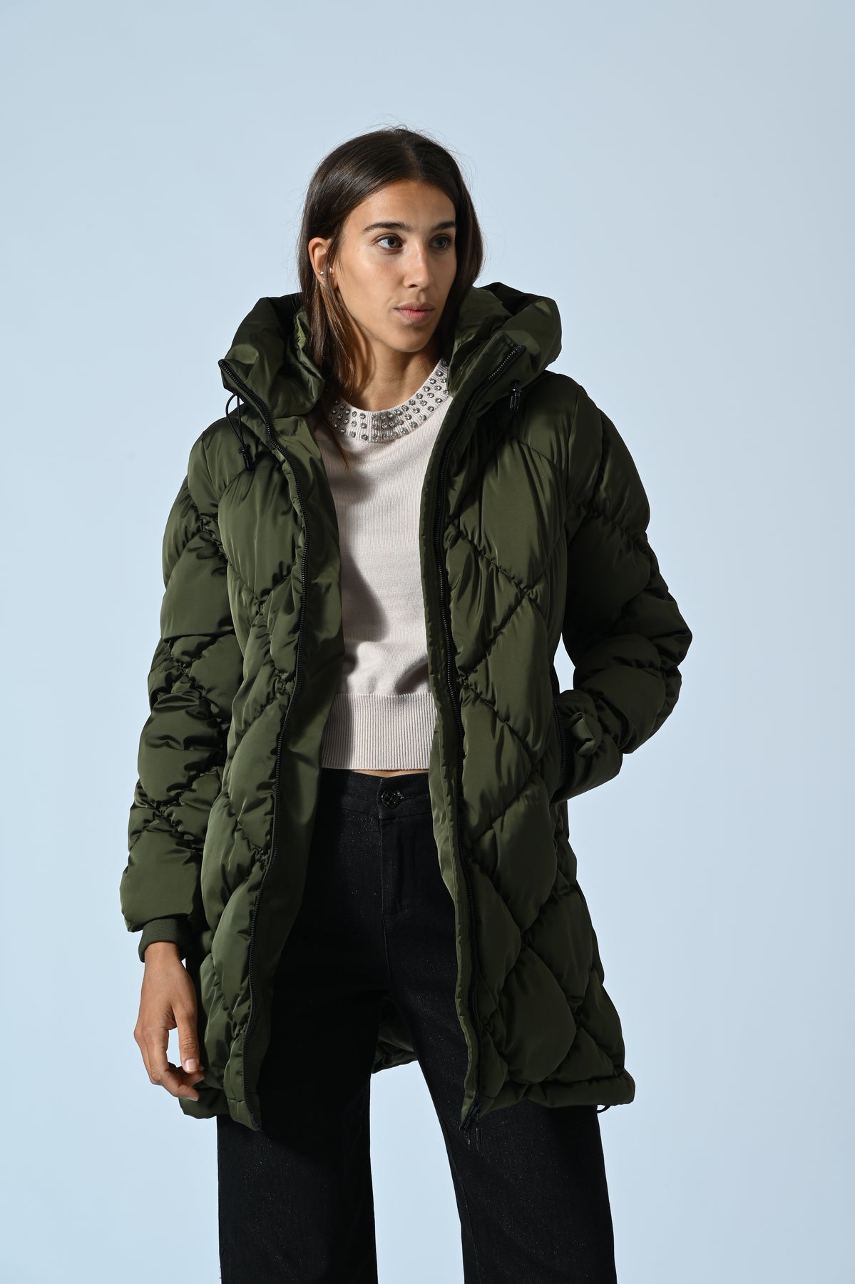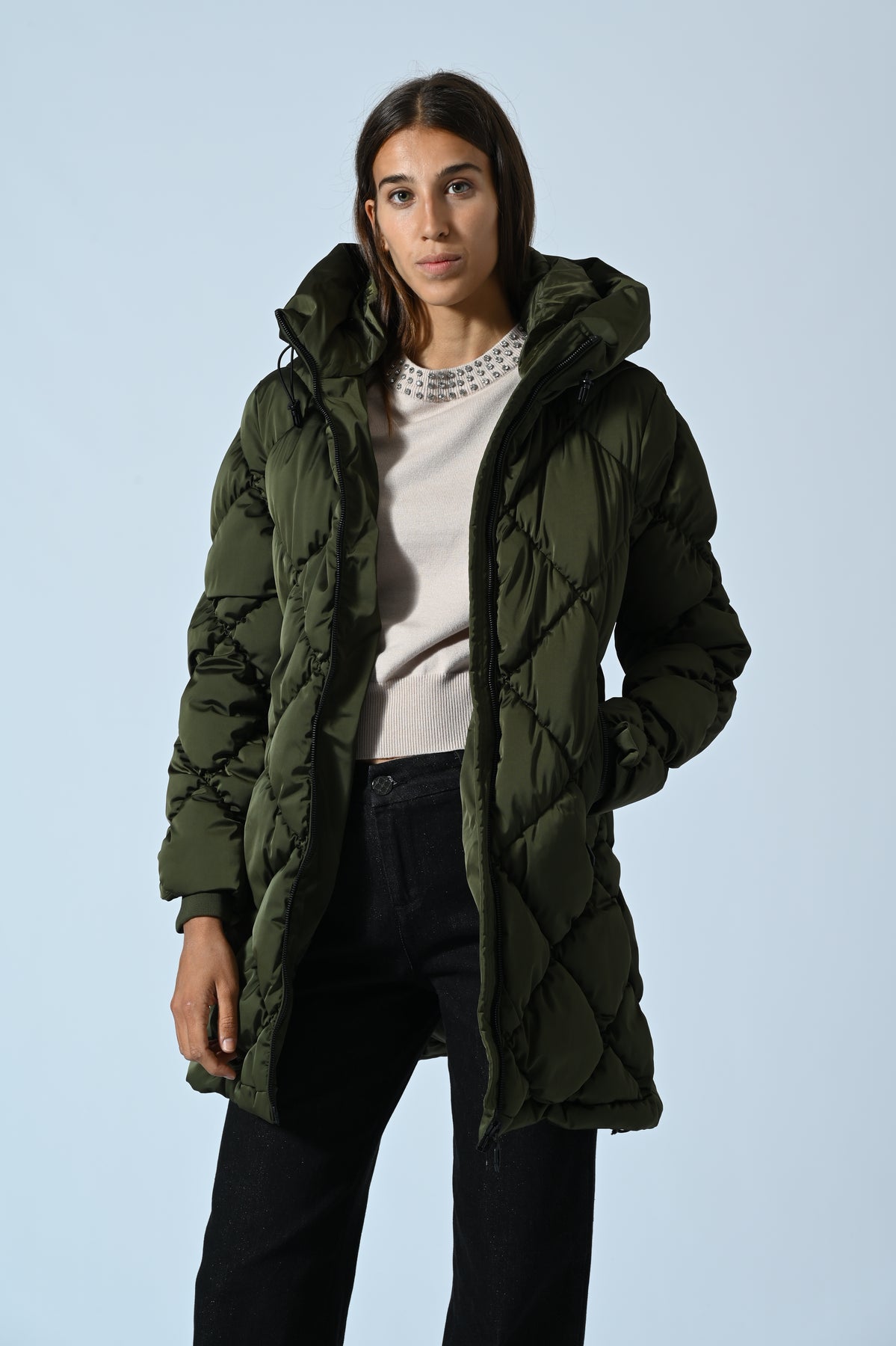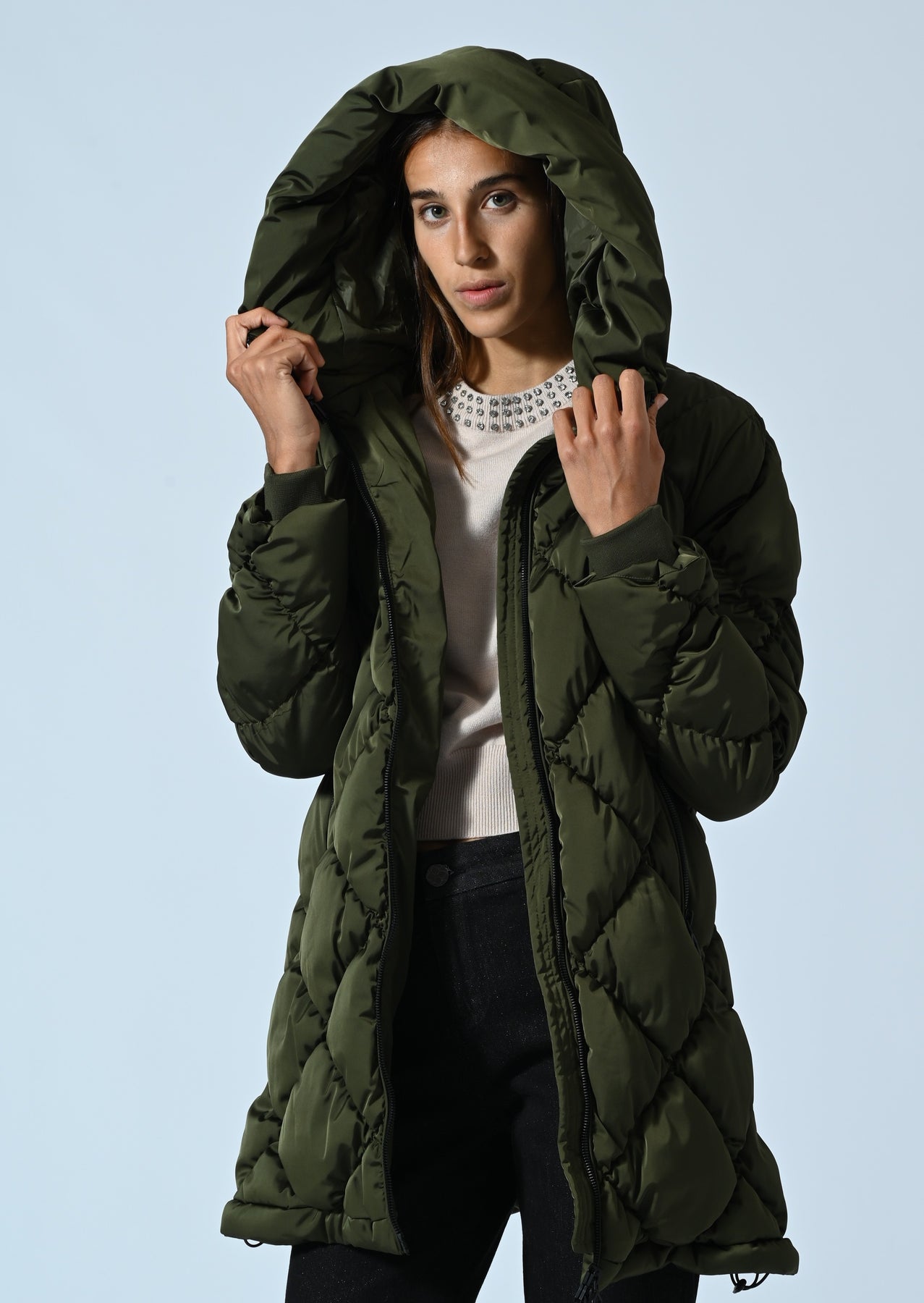 Ecopiumino lungo con cappuccio, trapuntatura a rombi: un capo versatile che unisce calore e stile. Ideale per affrontare l’inverno con un tocco urbano e contemporaneo.