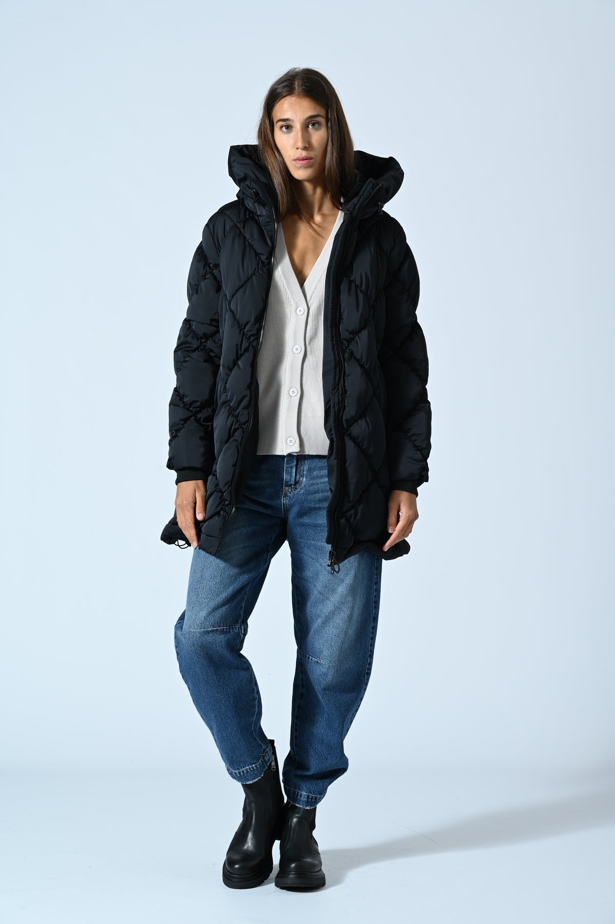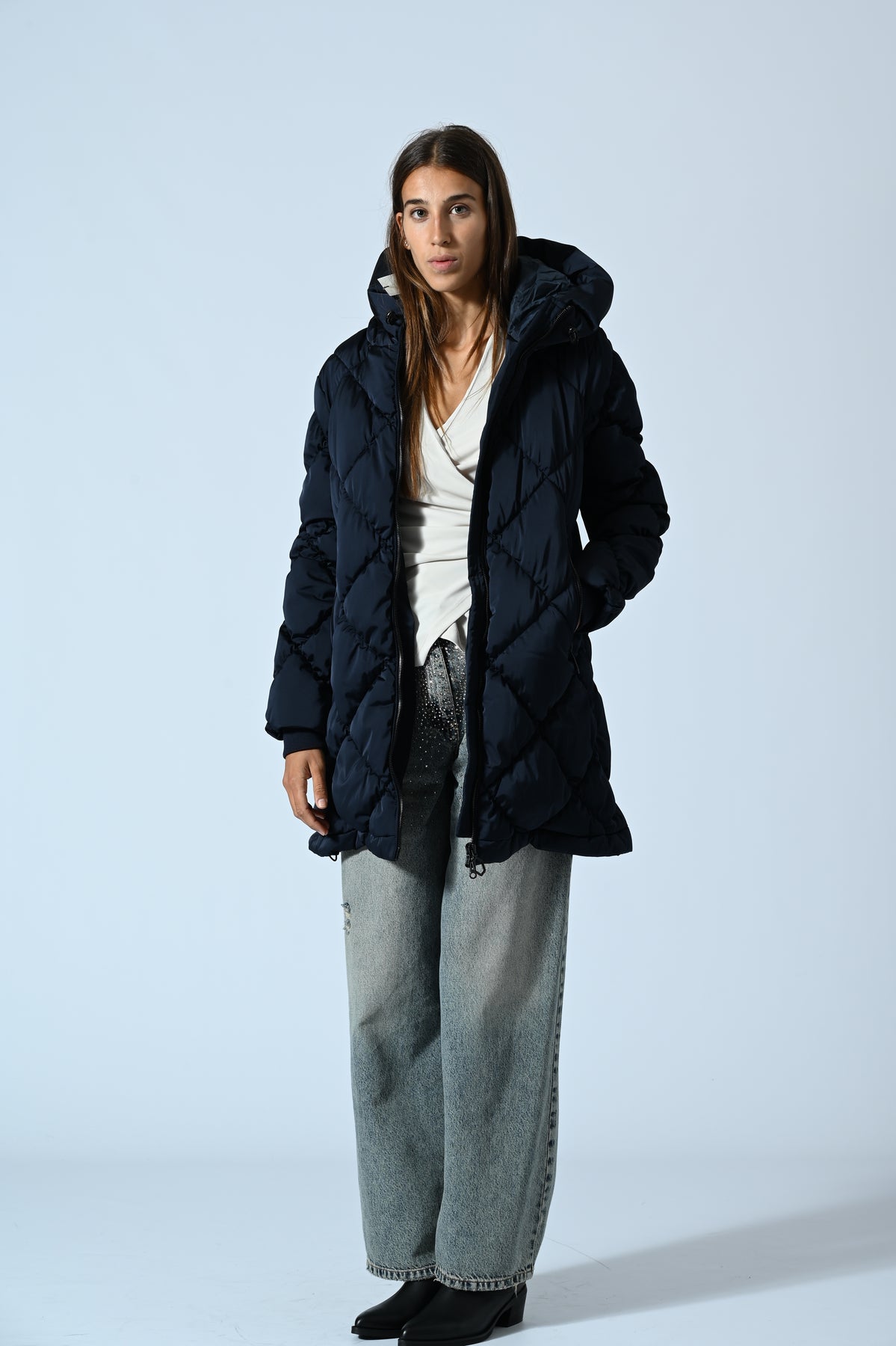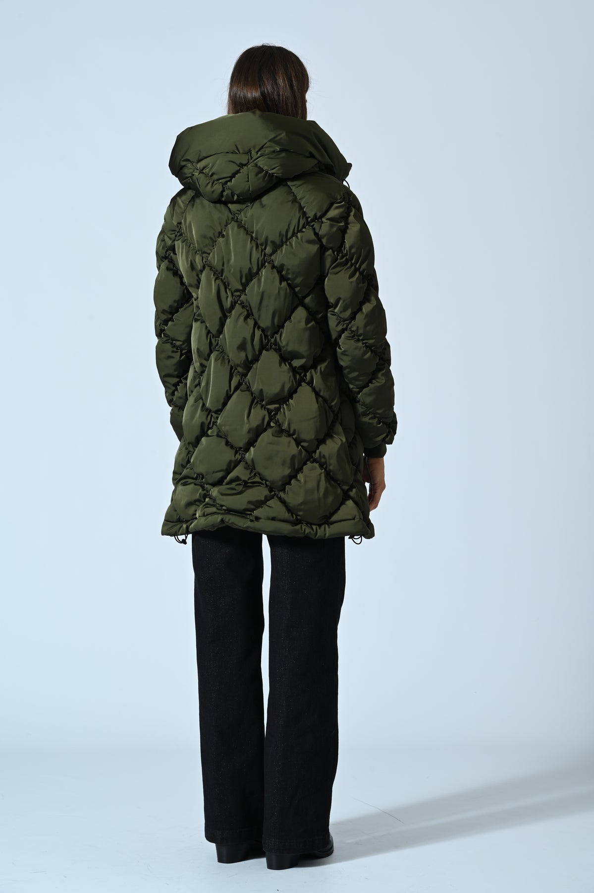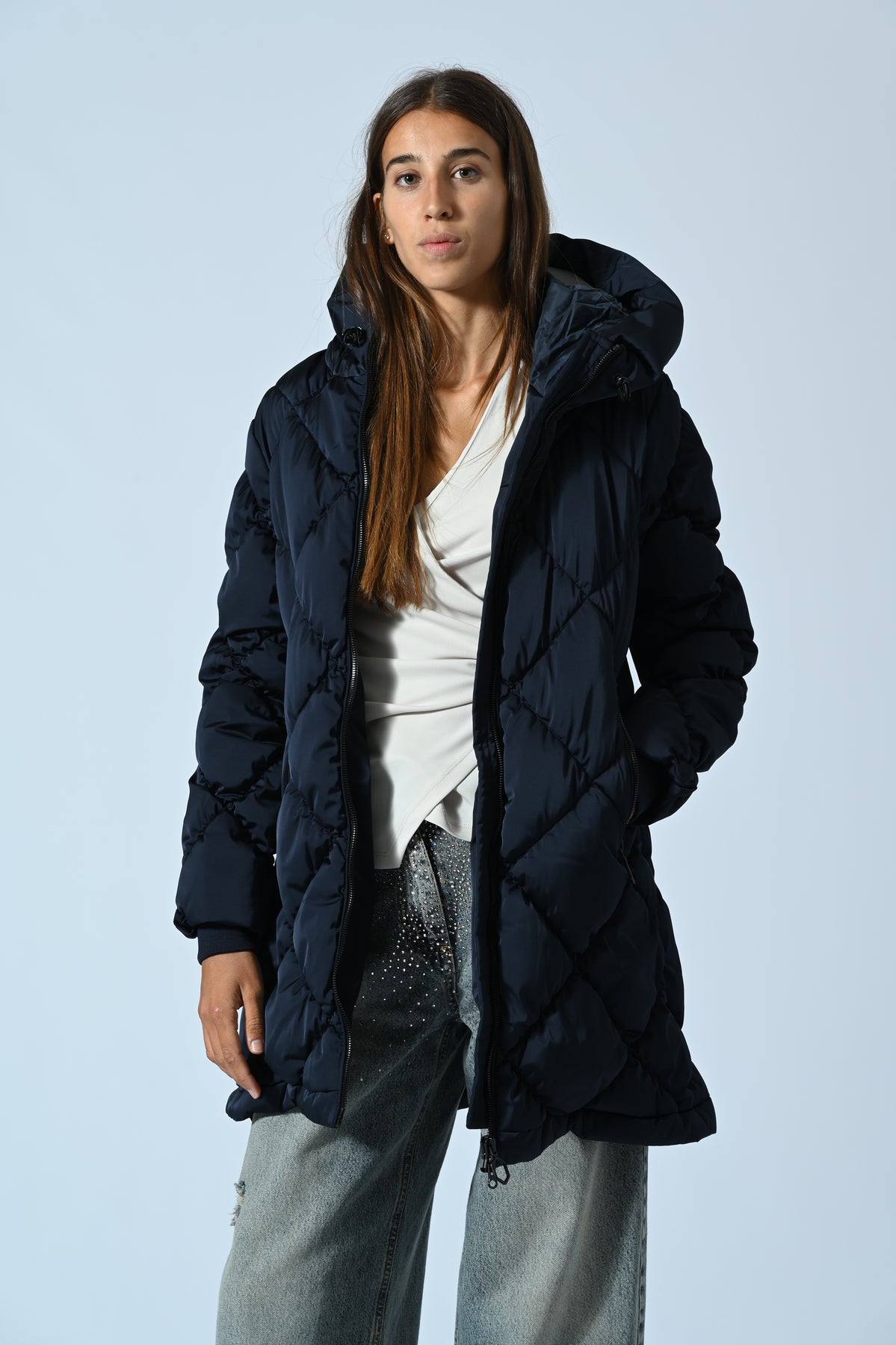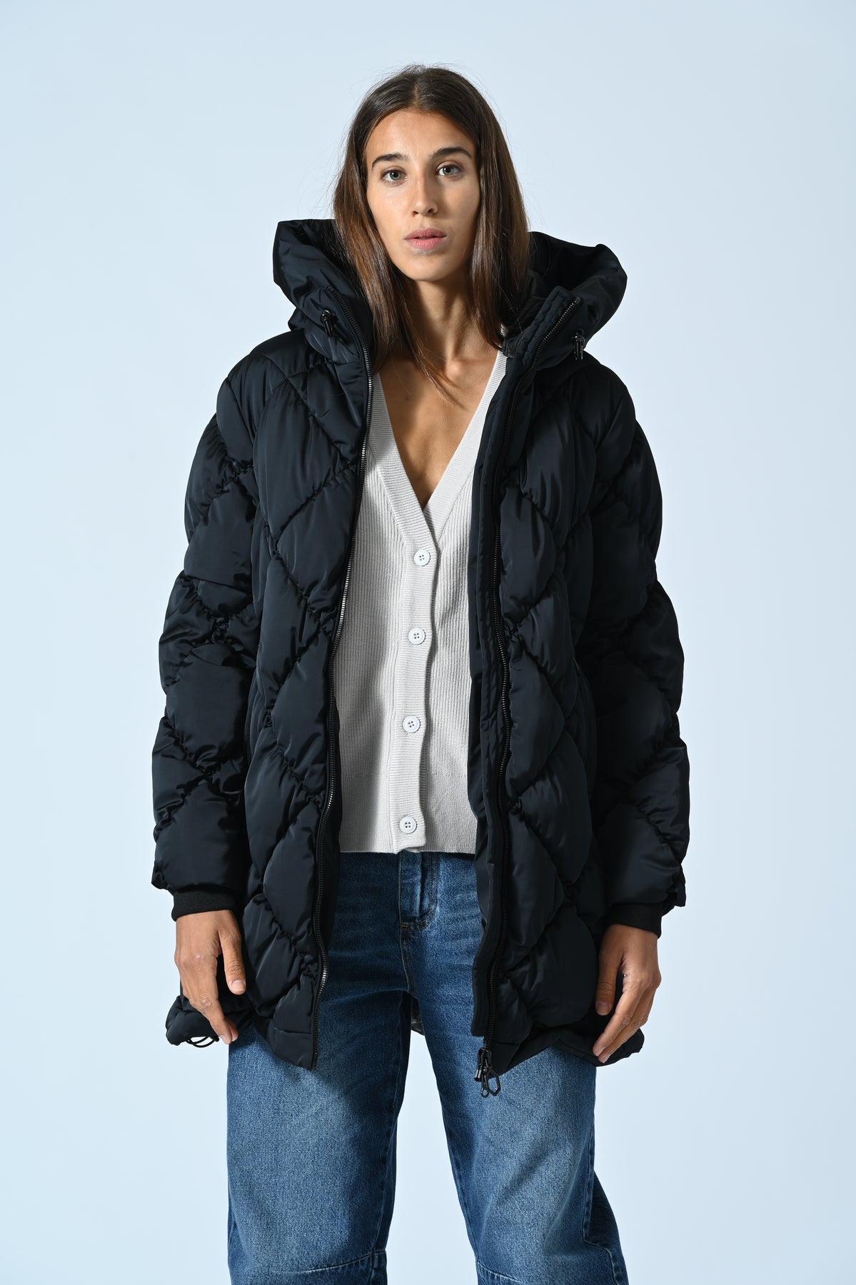 Ecopiumino lungo con cappuccio, trapuntatura a rombi: un capo versatile che unisce calore e stile. Ideale per affrontare l’inverno con un tocco urbano e contemporaneo.
