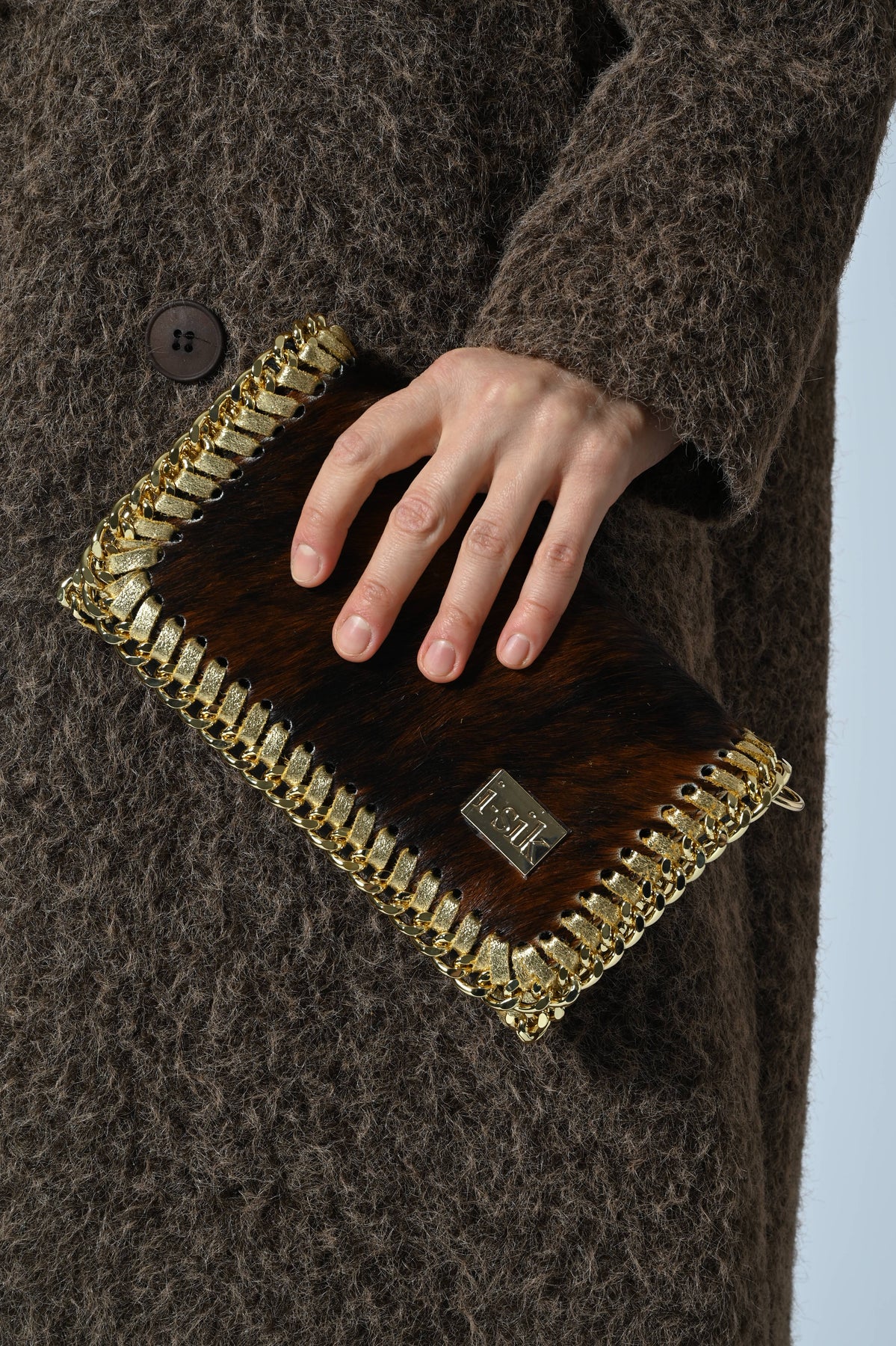 Pochette in cavallino, arricchita da catena sul bordo per un tocco chic e moderno. Compatta e versatile, perfetta per completare look da sera, eventi o outfit casual-eleganti con personalità.