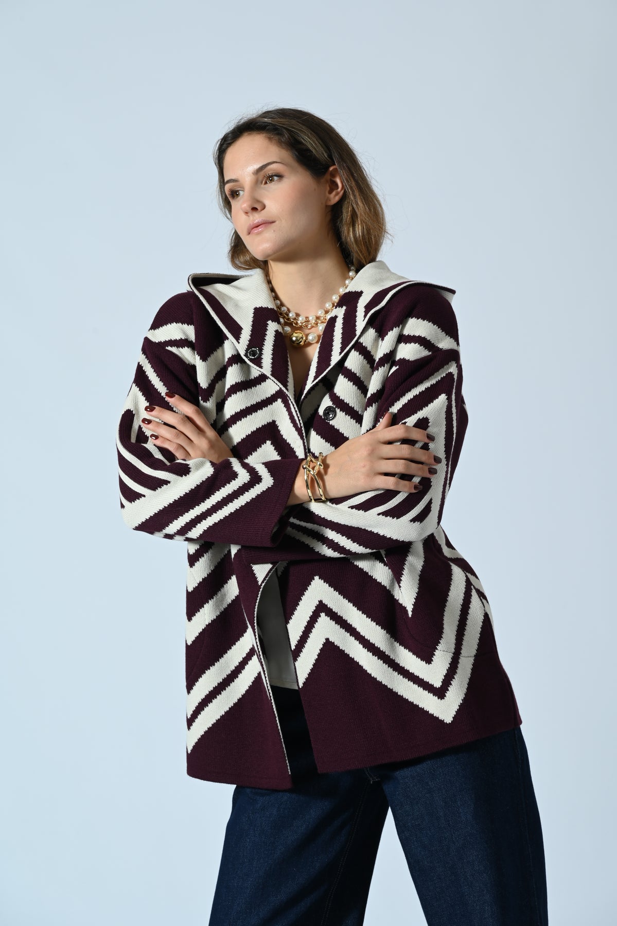 Cappotto in maglia misto lana con cappuccio, caratterizzato da una fantasia geometrica che dona carattere e personalità al capo. La lavorazione morbida e calda assicura comfort durante la stagione fredda, mentre la linea moderna e versatile lo rende perfetto sia per look casual sia per outfit più ricercati.