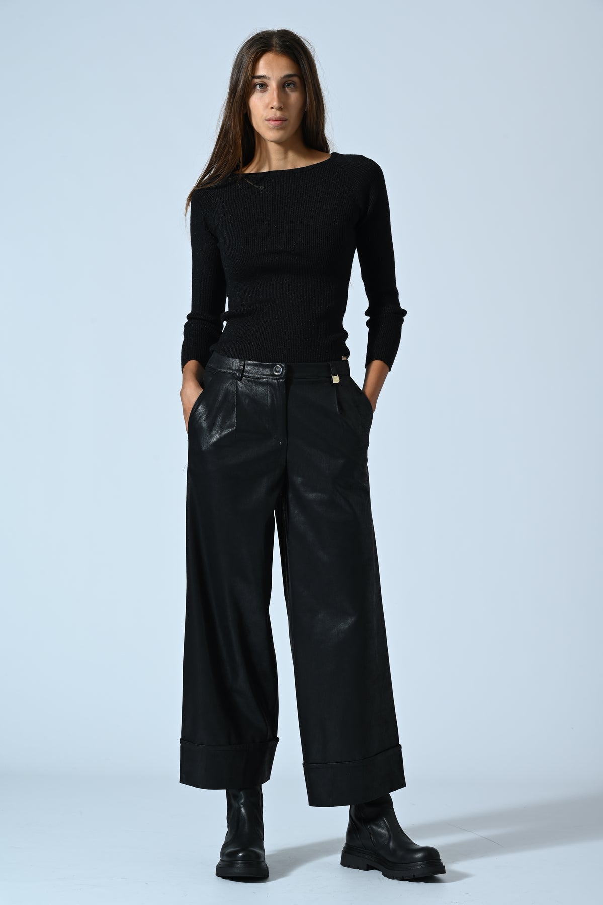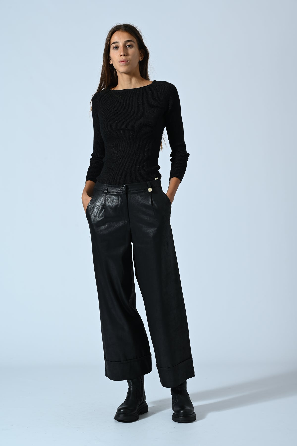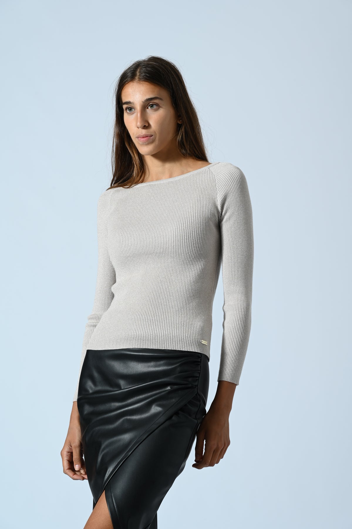 Minimal e femminile, questa maglia a costine con collo a barca è un capo essenziale che non passa mai di moda. La linea aderente valorizza la silhouette, mentre il collo a barca dona eleganza e femminilità. Perfetta come base per look da giorno e da sera.