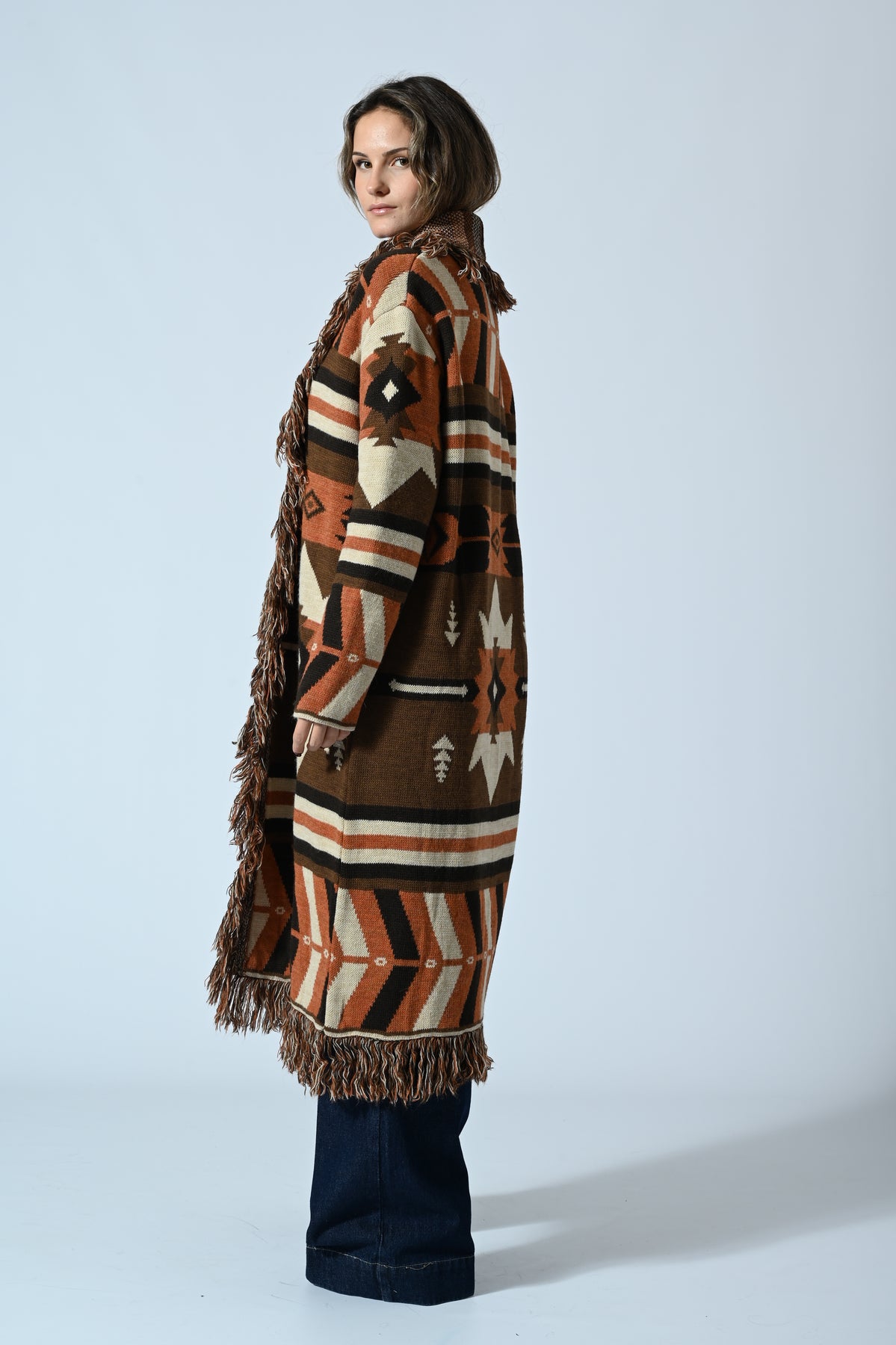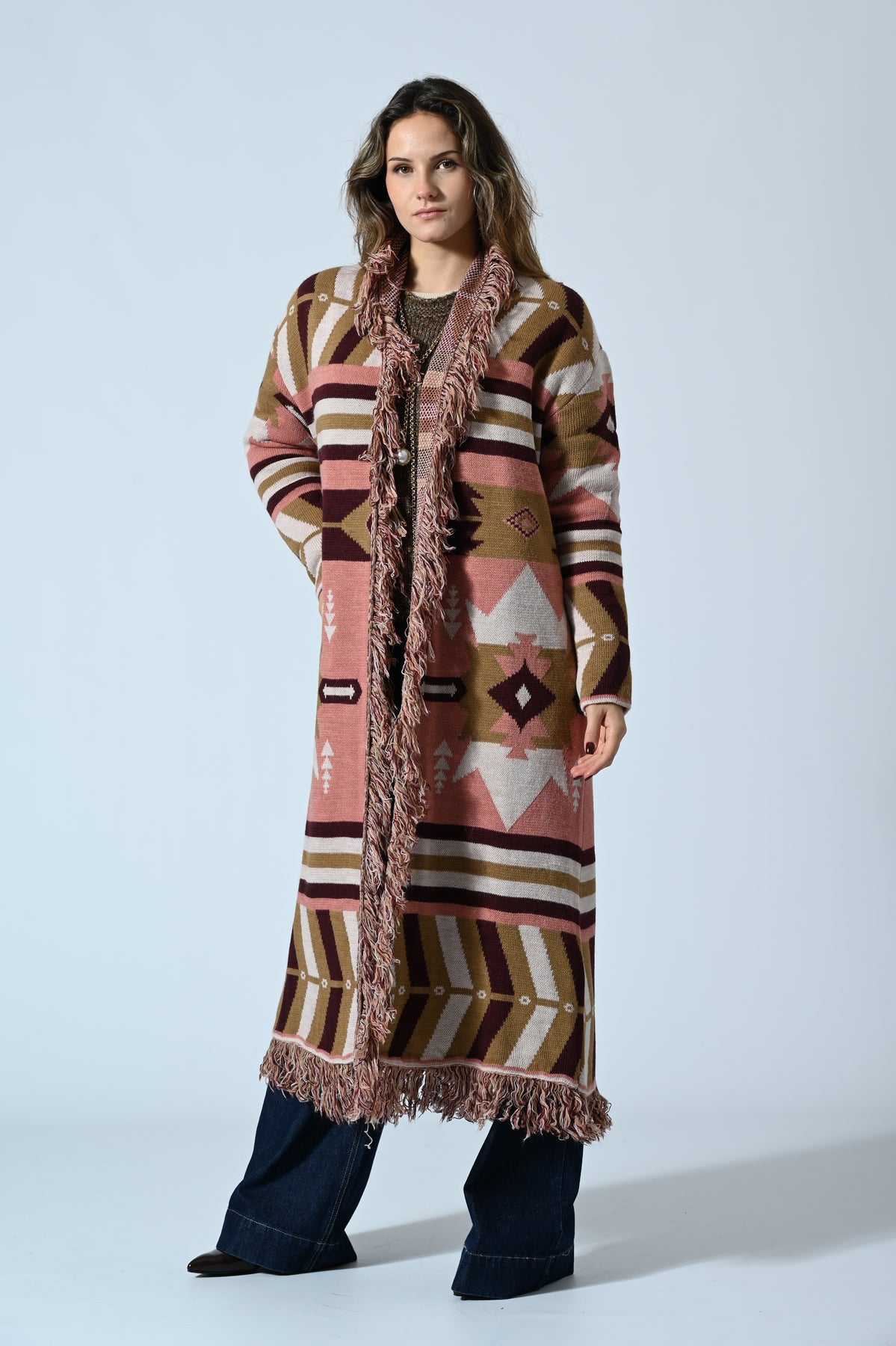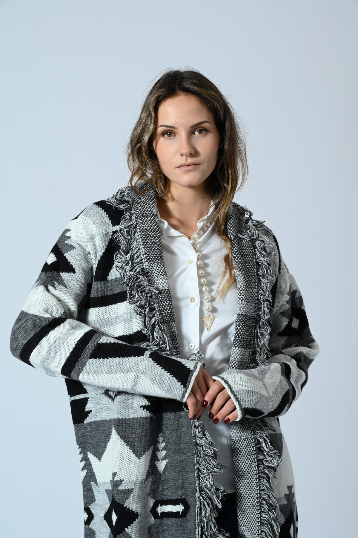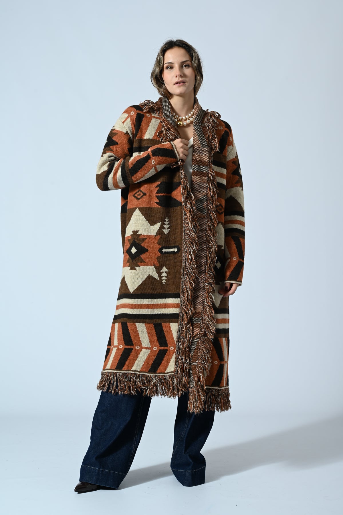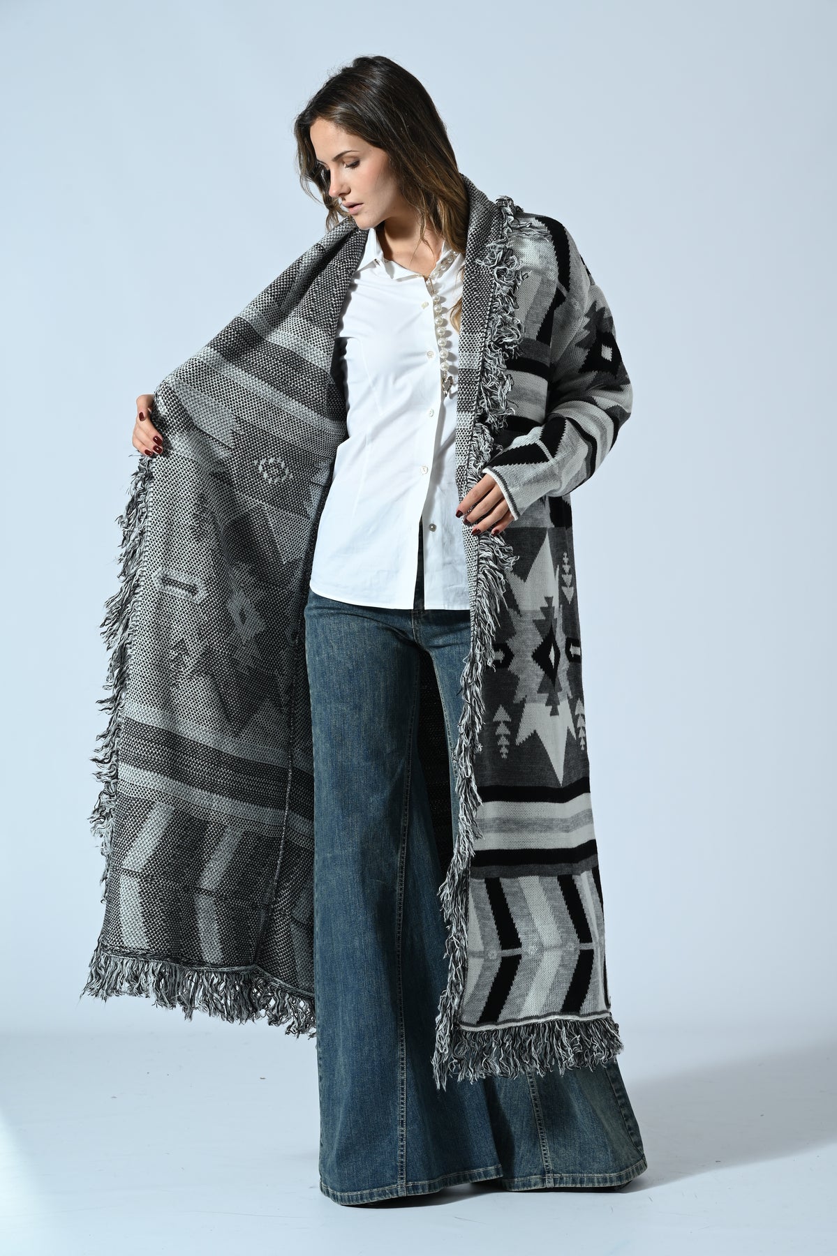 Spolverino lungo in maglia caratterizzato da frange e fantasia etnica, un capo dal fascino dinamico e ricercato. La linea fluida e morbida unita ai dettagli tessili crea movimento e personalità, perfetto per completare look casual o più sofisticati con un tocco boho-chic.