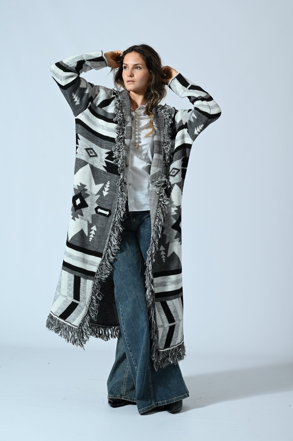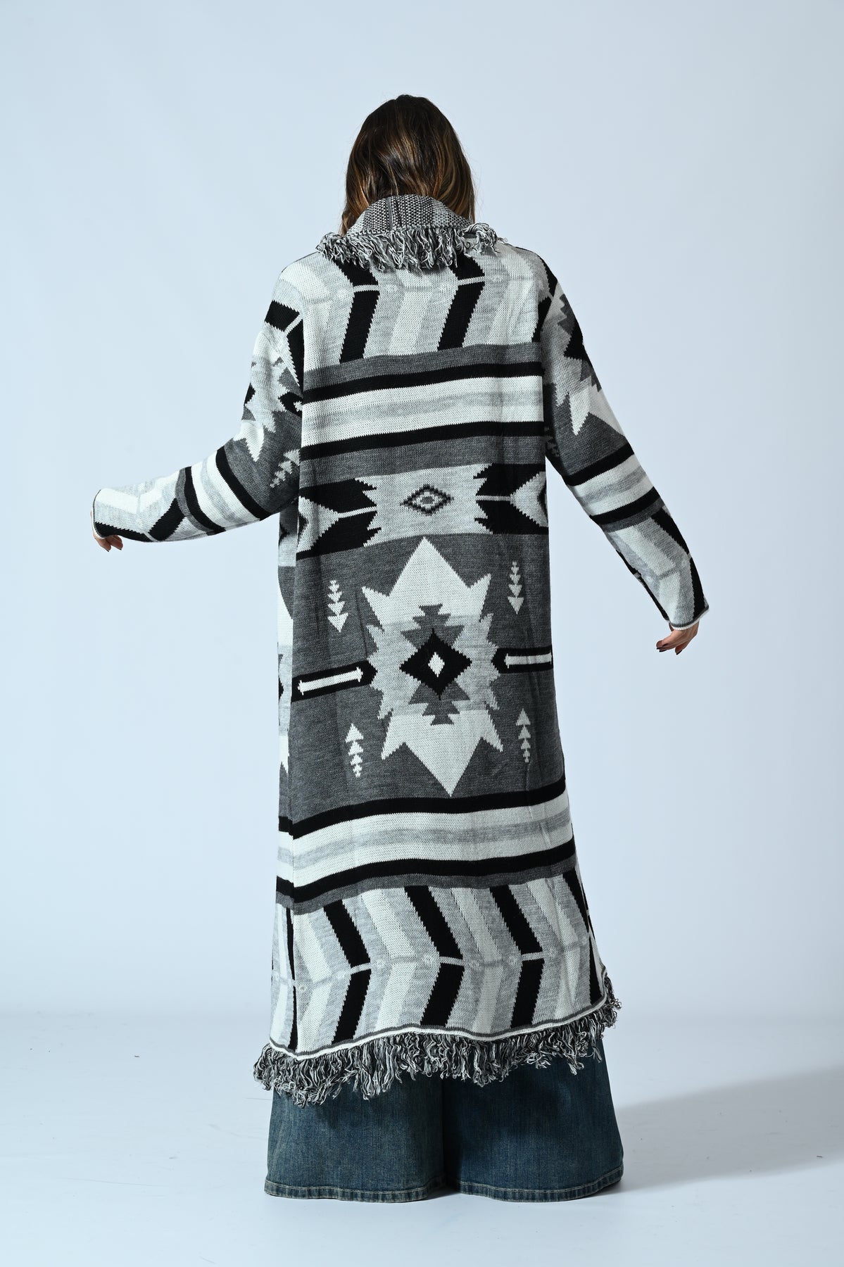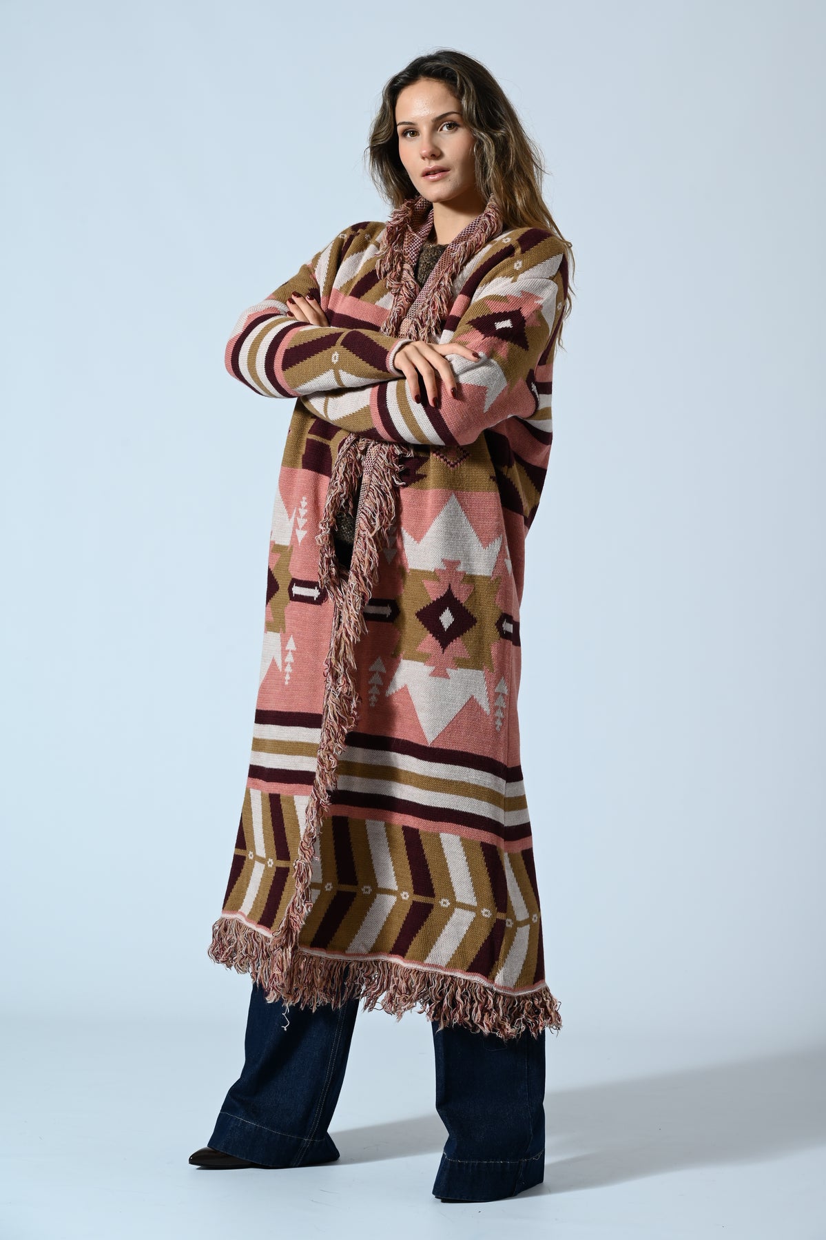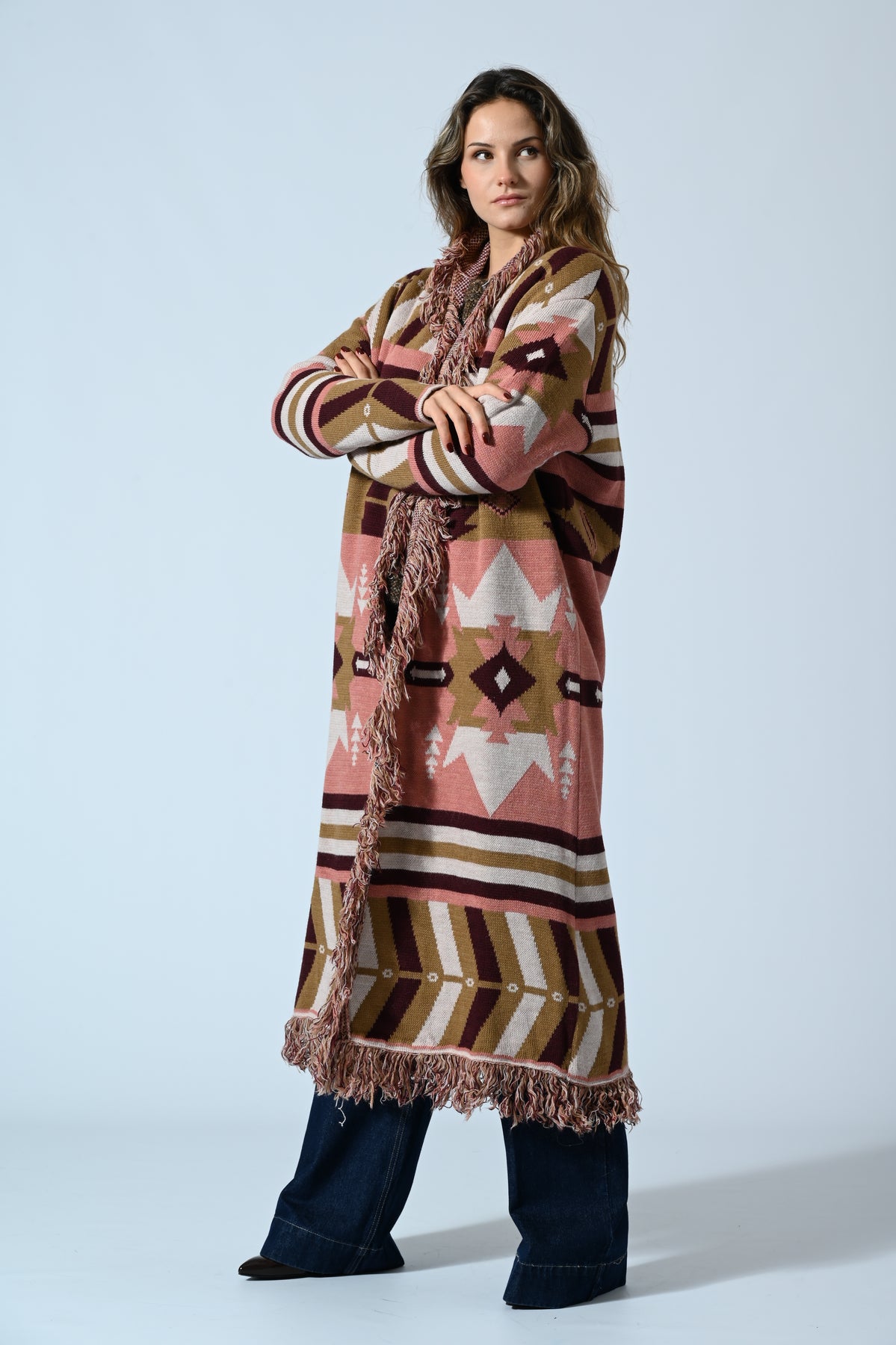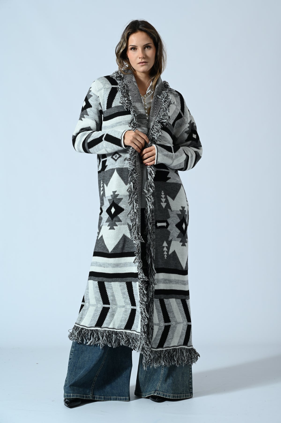 Spolverino lungo in maglia caratterizzato da frange e fantasia etnica, un capo dal fascino dinamico e ricercato. La linea fluida e morbida unita ai dettagli tessili crea movimento e personalità, perfetto per completare look casual o più sofisticati con un tocco boho-chic.