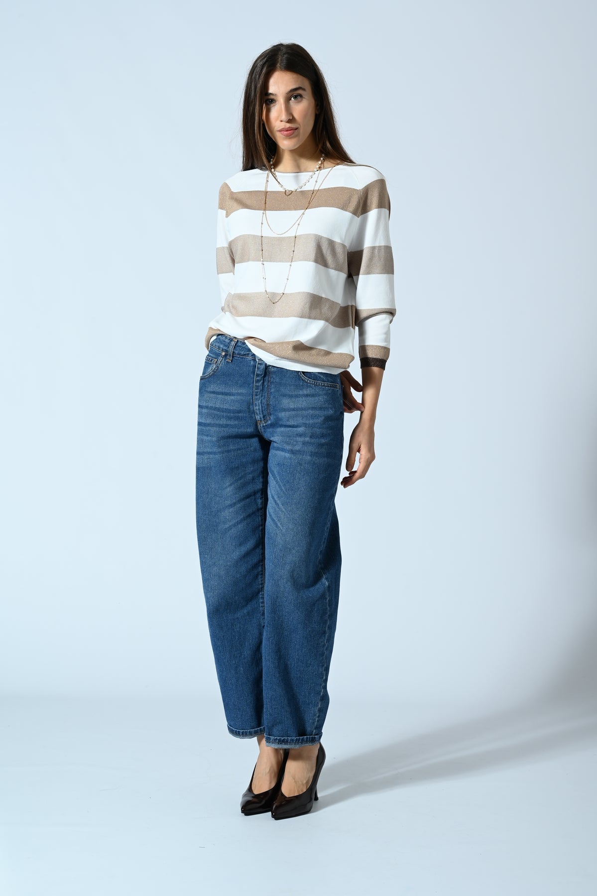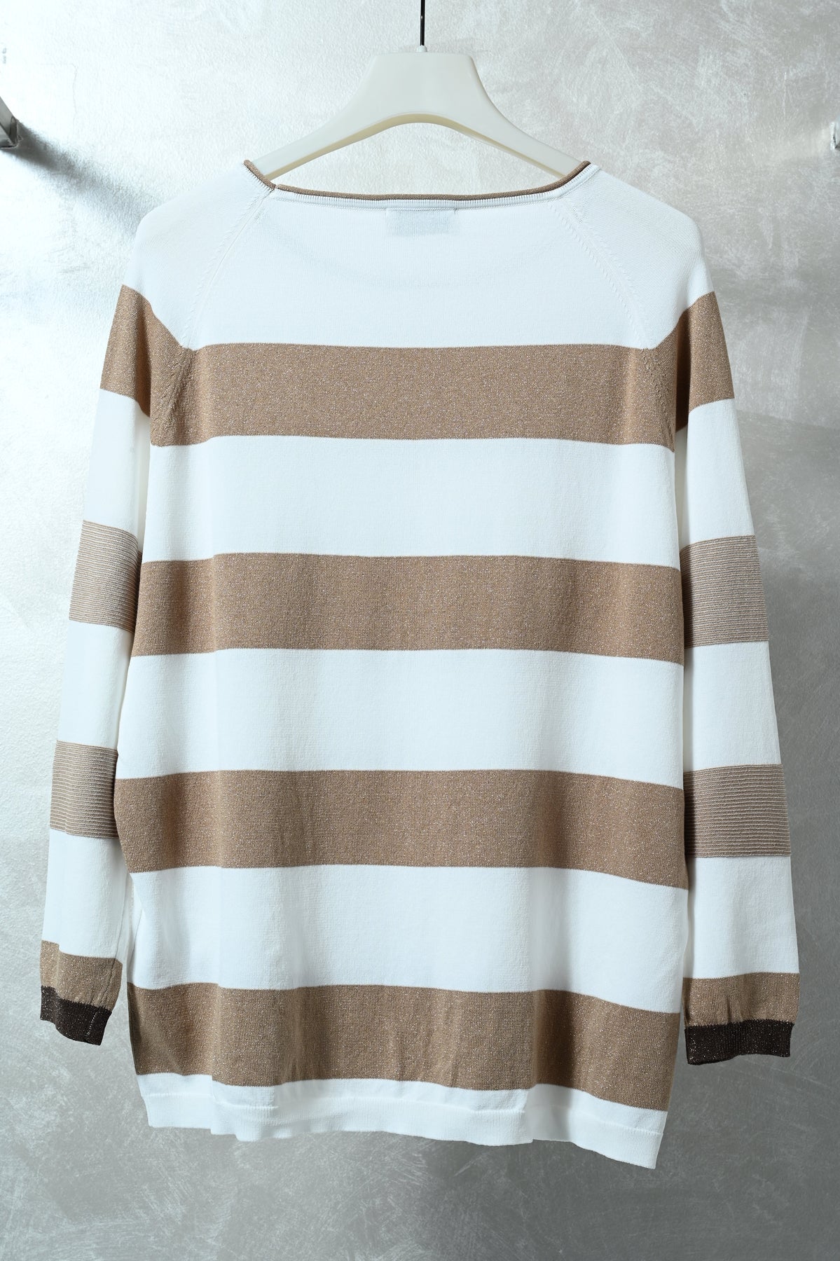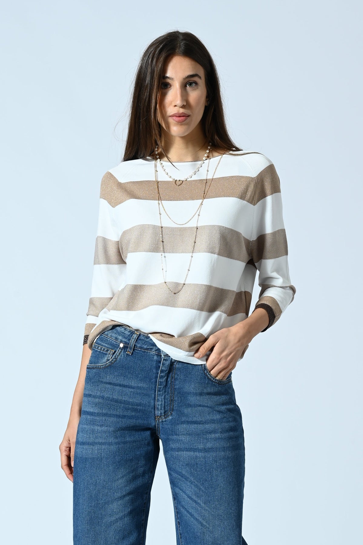 Maglia in morbida viscosa con lavorazione raglan e fantasia a righe impreziosita da filato lurex che dona luminosità al capo. Design femminile e contemporaneo, perfetto per aggiungere un tocco elegante e brillante a look casual o smart-casual.