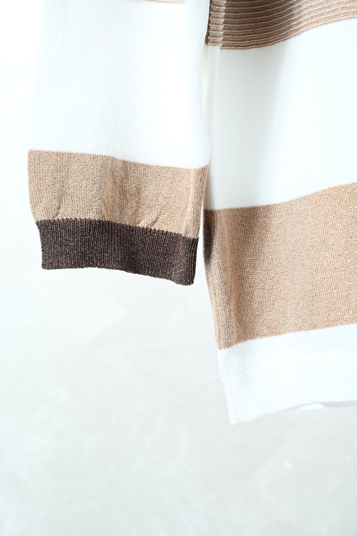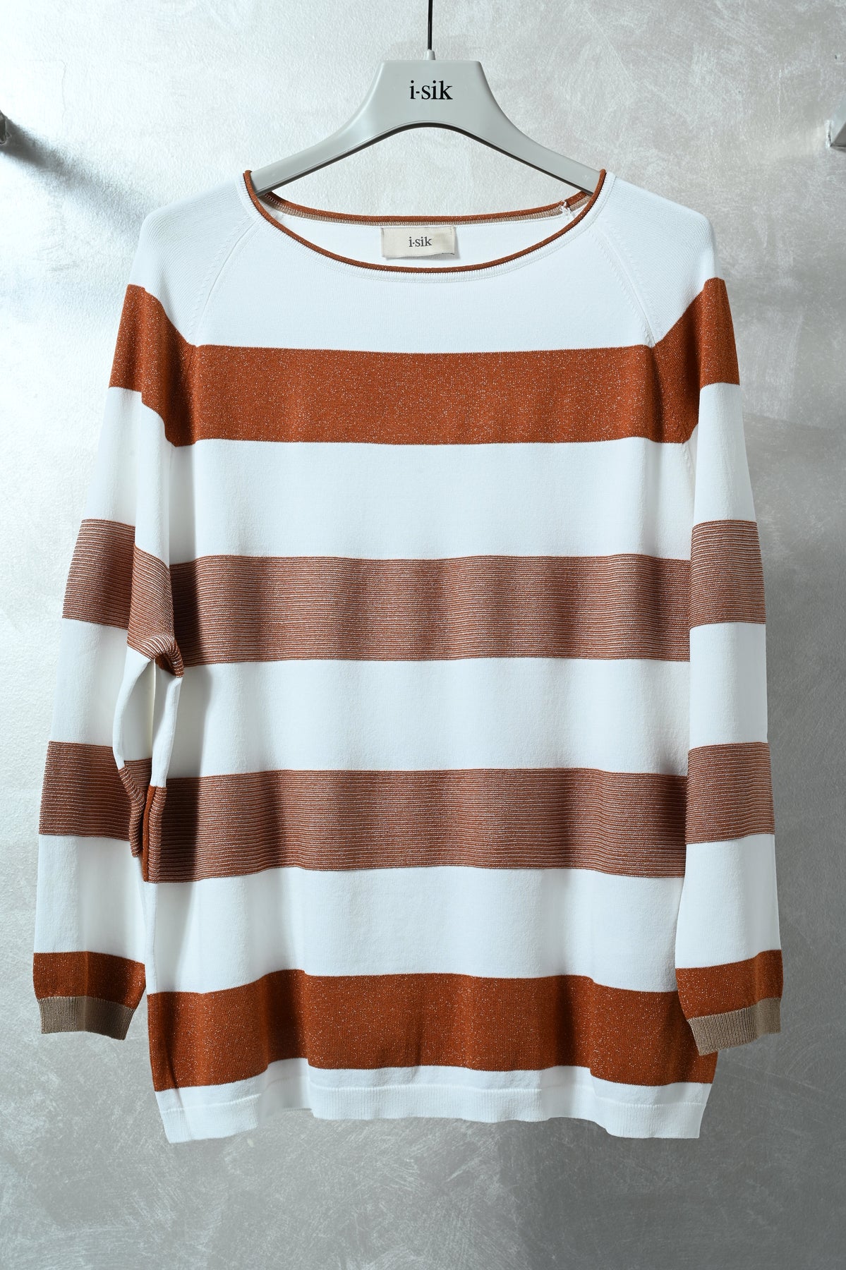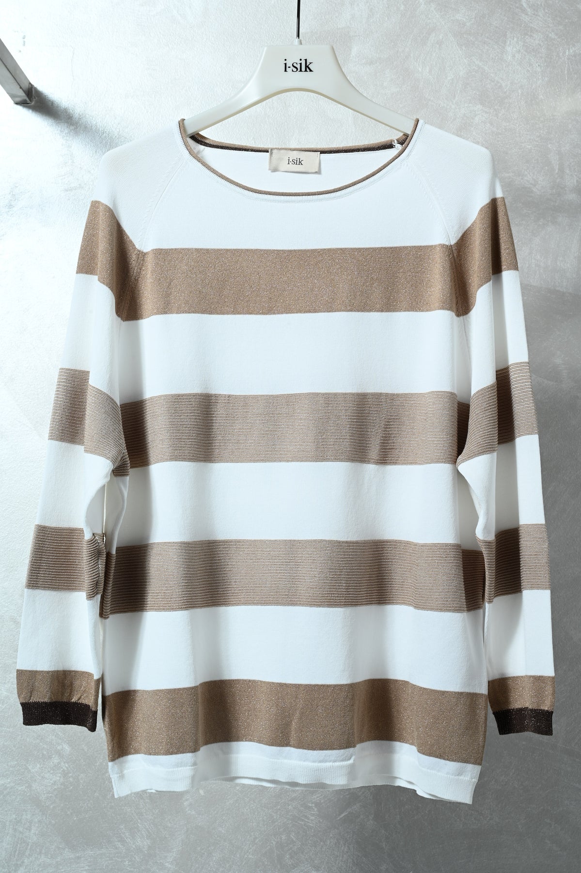 Maglia in morbida viscosa con lavorazione raglan e fantasia a righe impreziosita da filato lurex che dona luminosità al capo. Design femminile e contemporaneo, perfetto per aggiungere un tocco elegante e brillante a look casual o smart-casual.