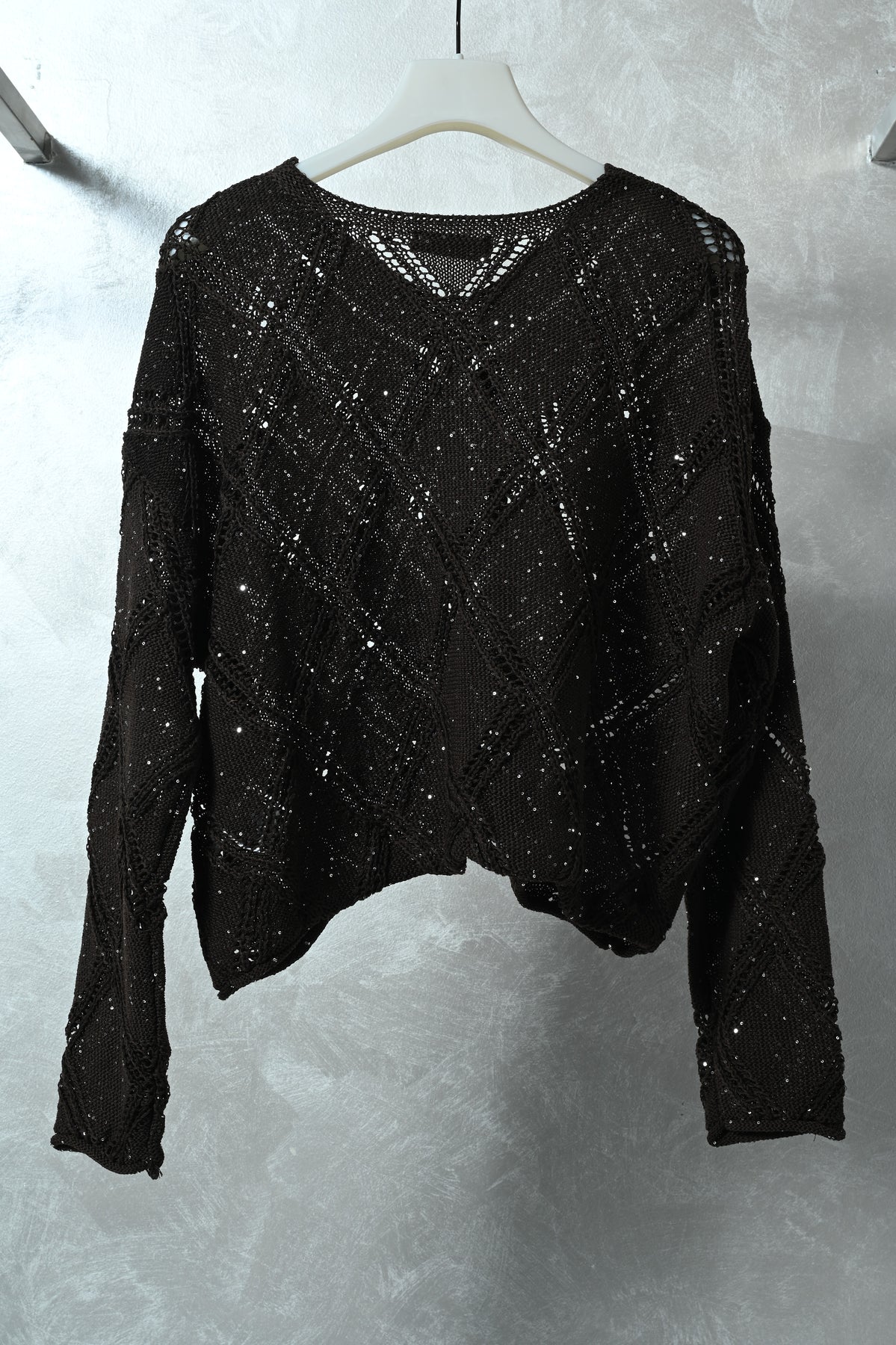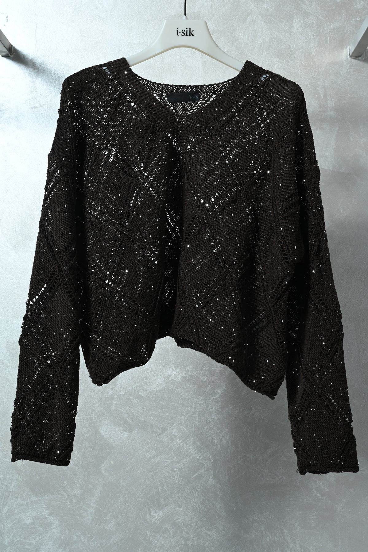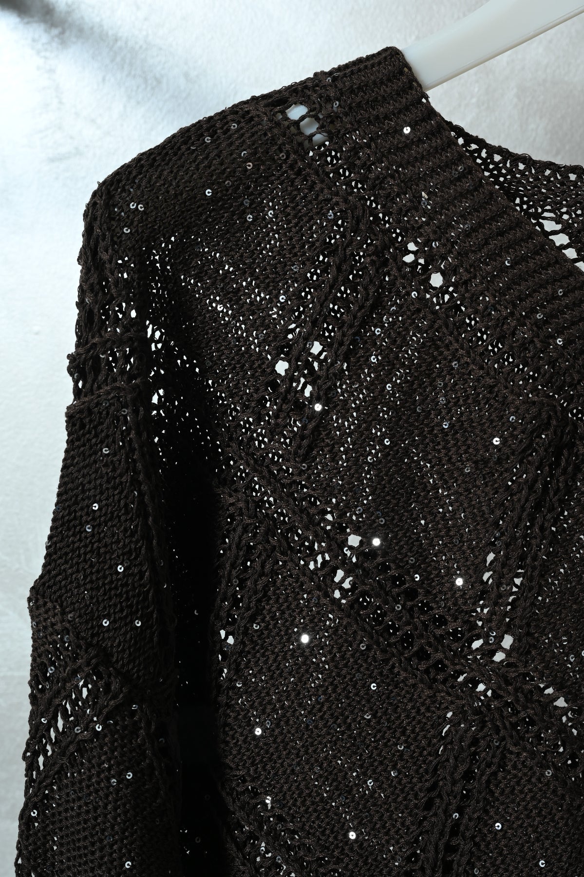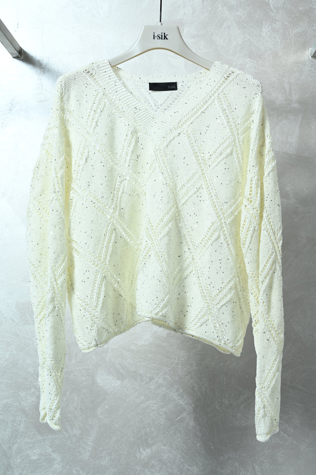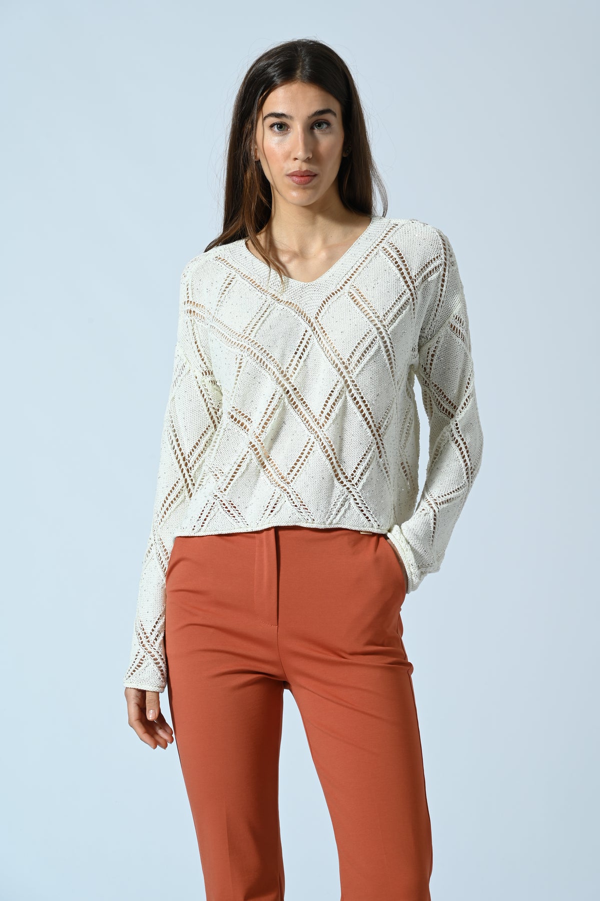 Maglia con scollo a V decorata da piccole paillettes e caratterizzata da una lavorazione traforata a motivo di rombi. Capo femminile e luminoso, dal design elegante e contemporaneo, perfetto per look casual-chic o occasioni speciali.