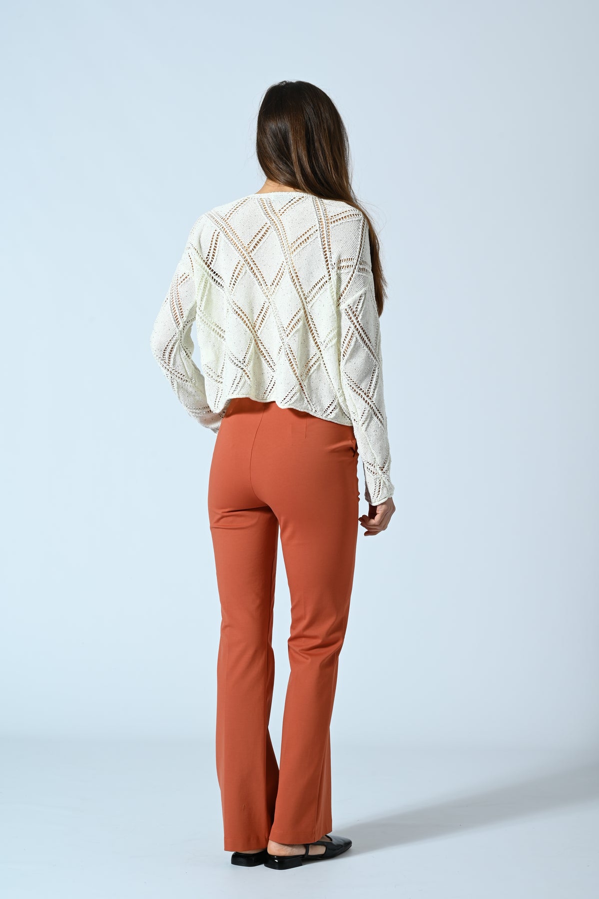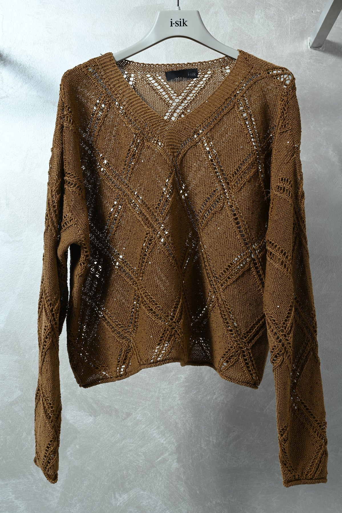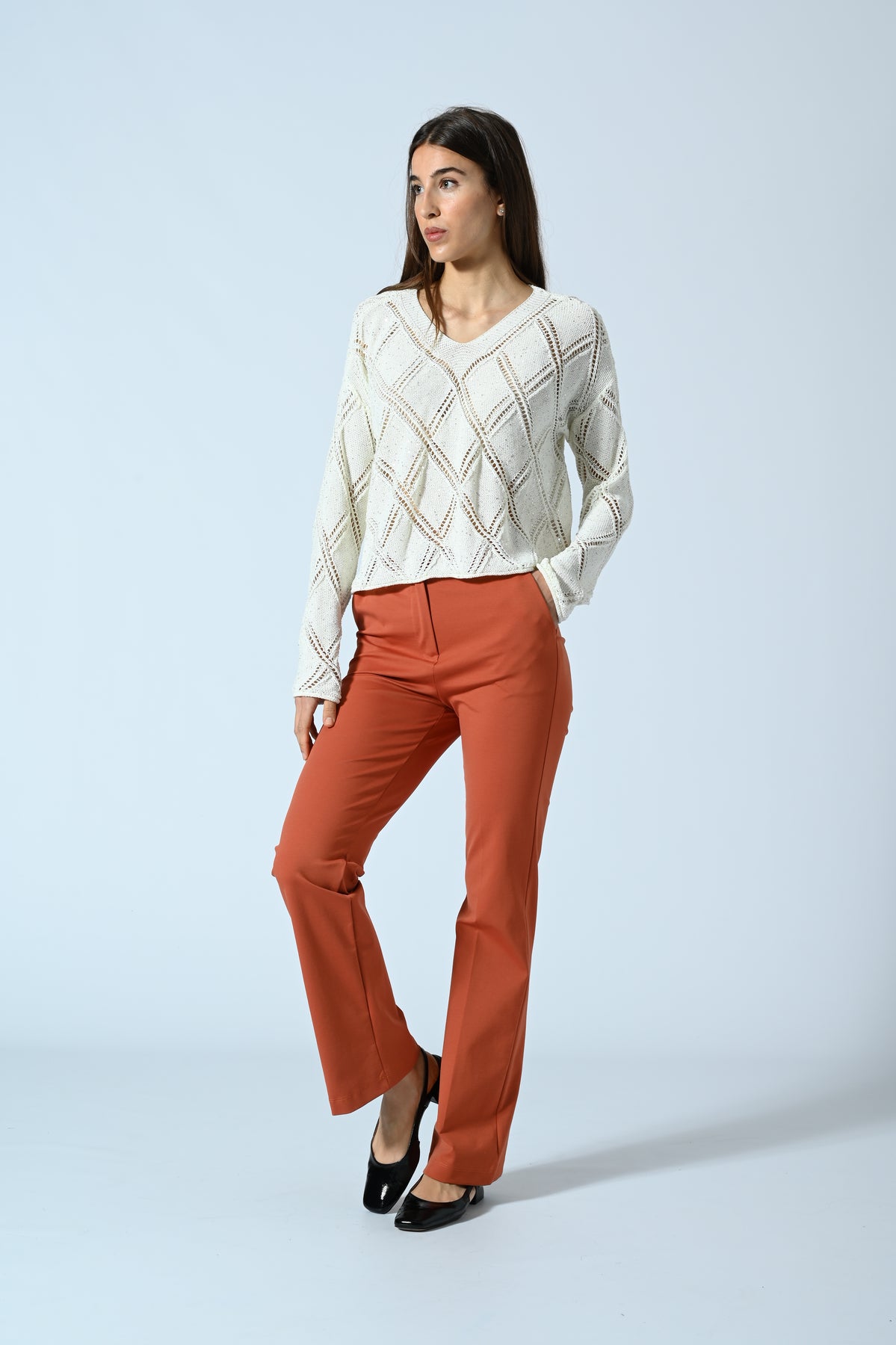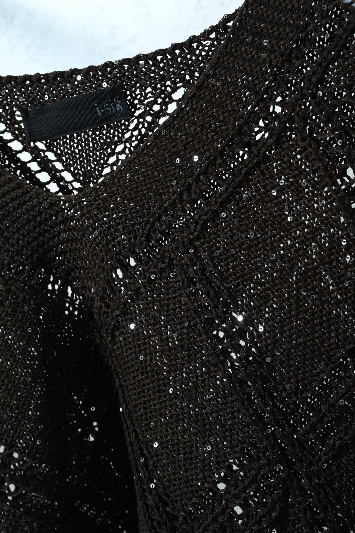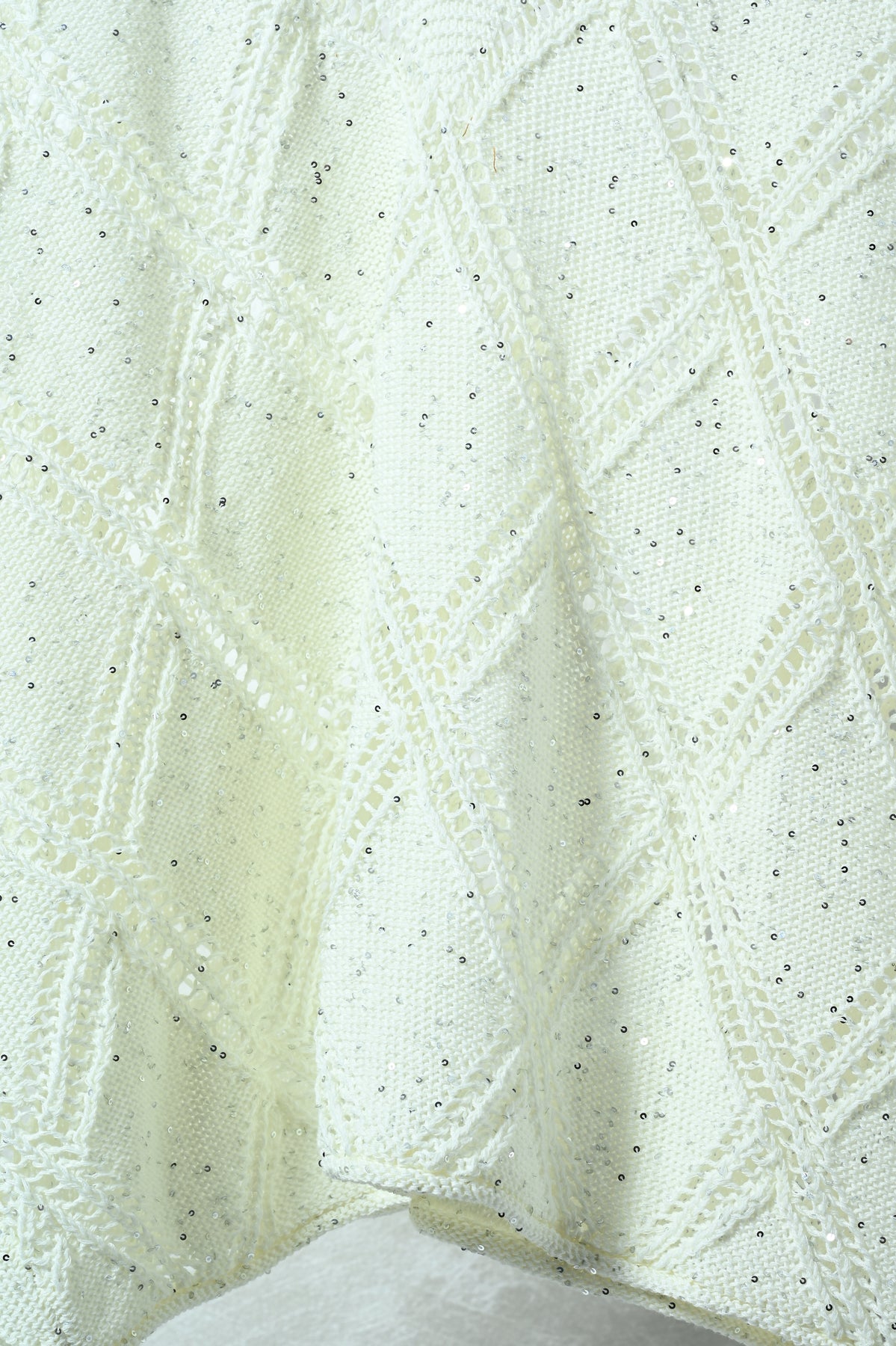 Maglia con scollo a V decorata da piccole paillettes e caratterizzata da una lavorazione traforata a motivo di rombi. Capo femminile e luminoso, dal design elegante e contemporaneo, perfetto per look casual-chic o occasioni speciali.
