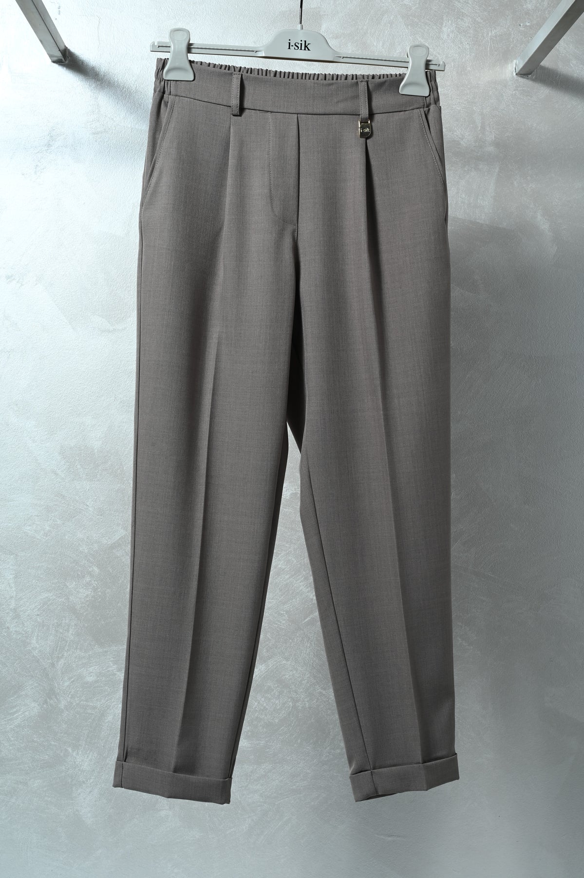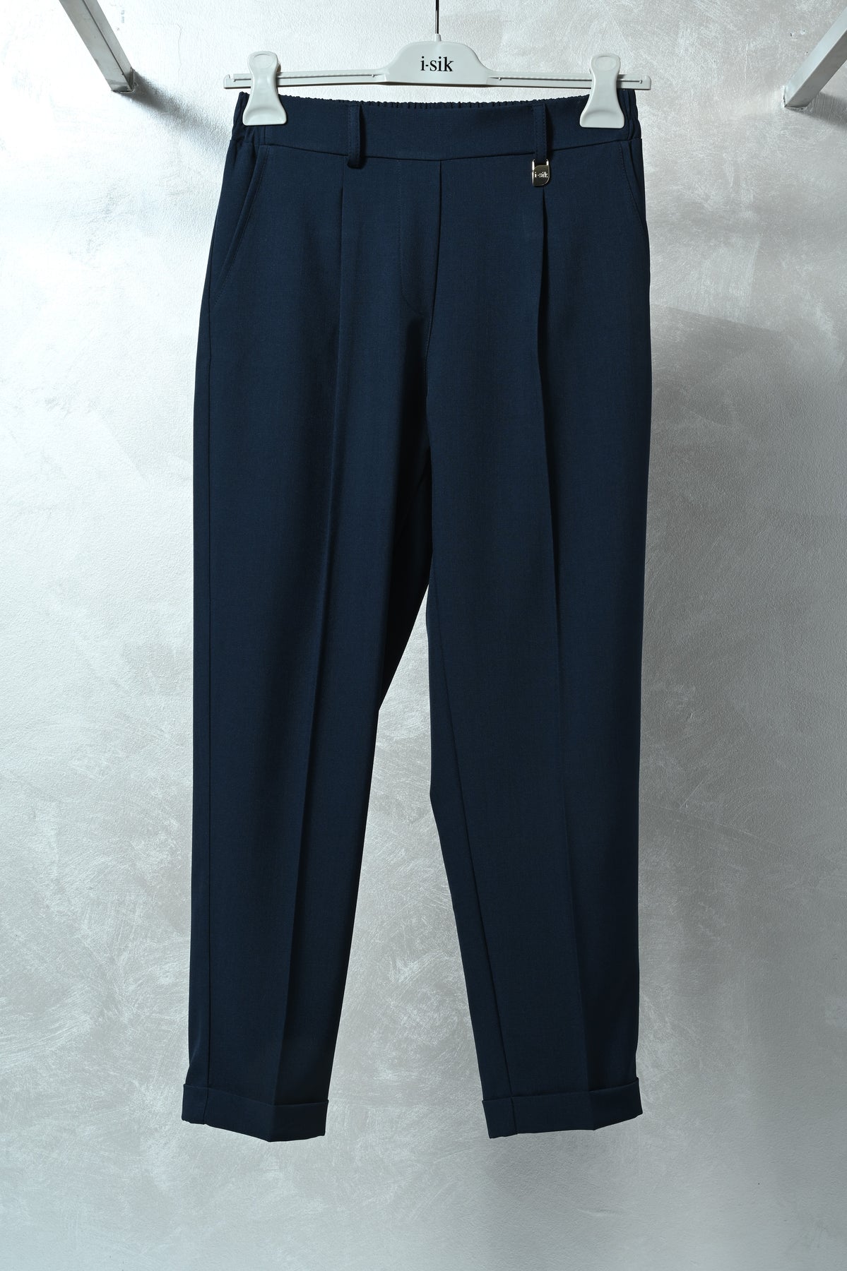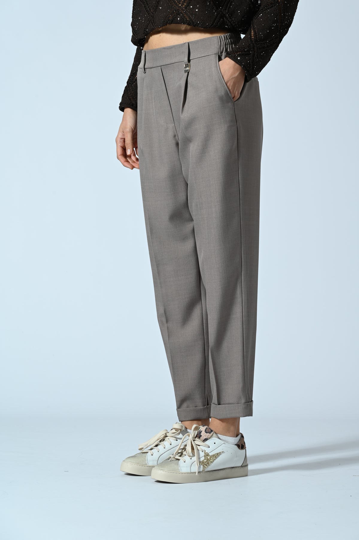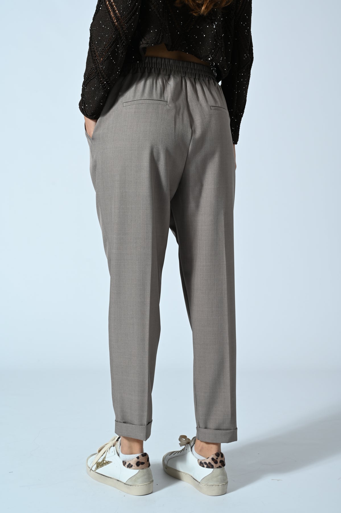 Pantalone in tessuto fluido e morbido, con gamba leggermente affusolata verso la caviglia ed elastico in vita per garantire comfort e vestibilità. La piega frontale valorizza la linea elegante del capo, rendendolo perfetto per look raffinati, business o casual-chic contemporanei.
