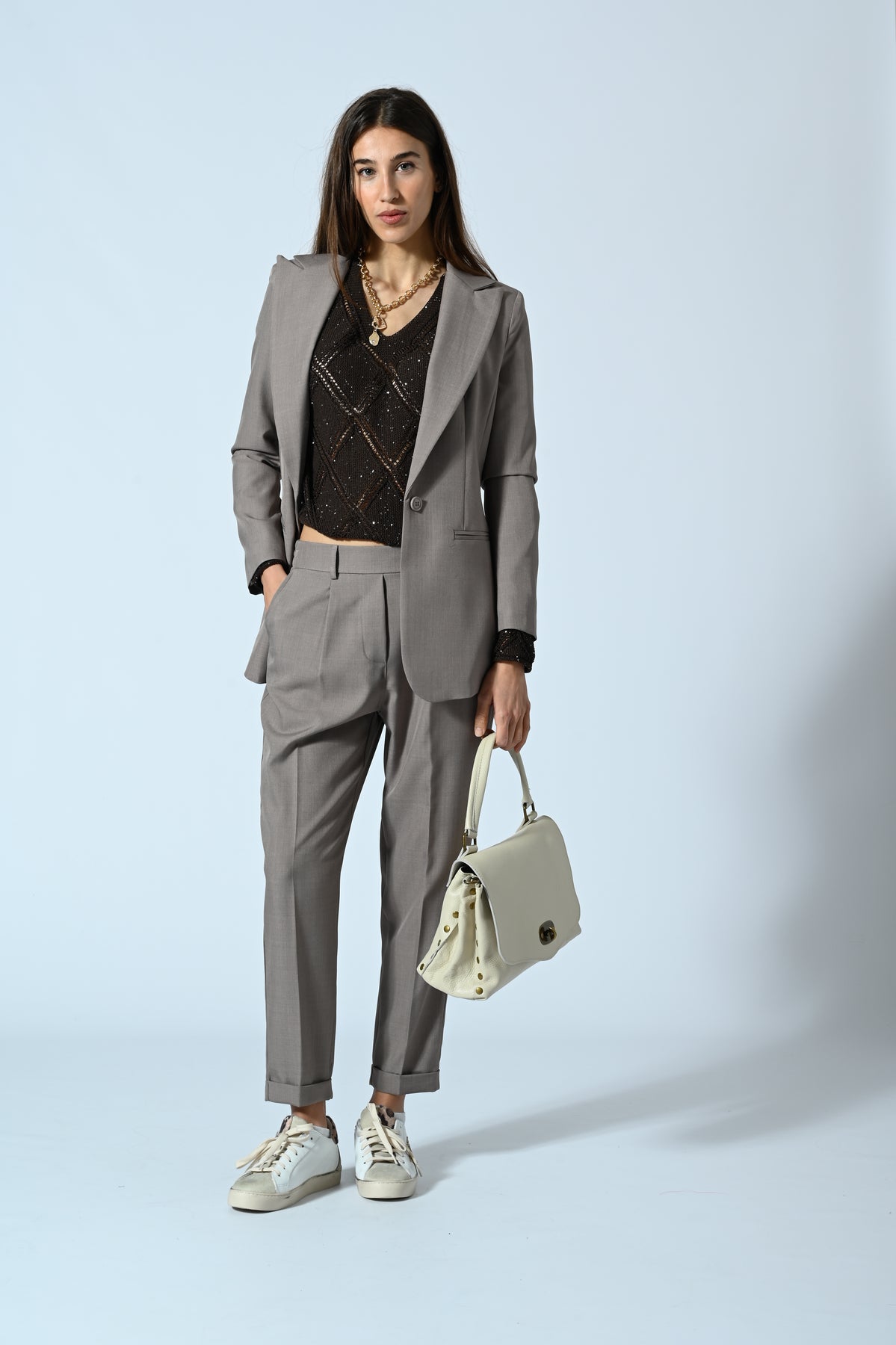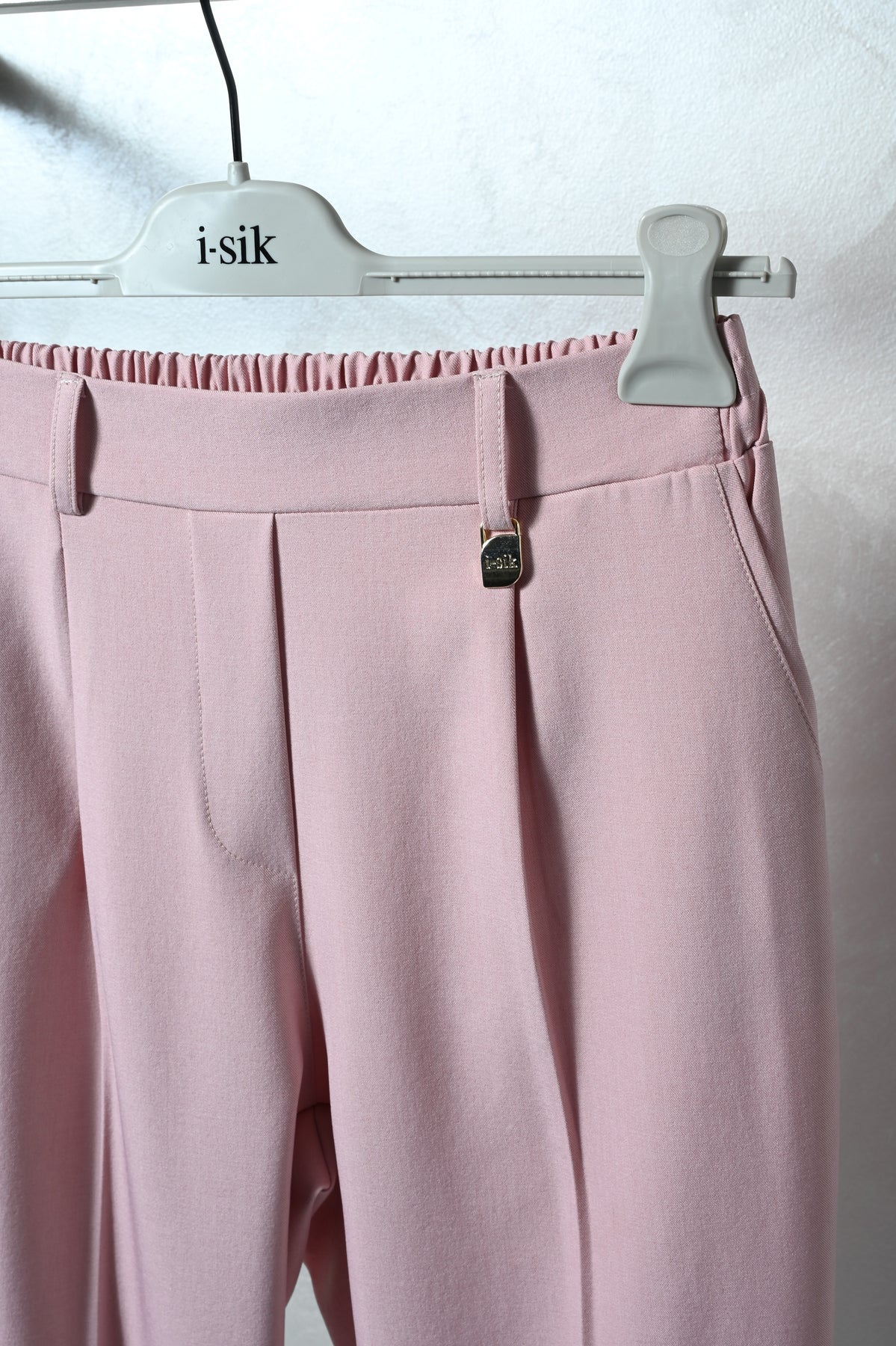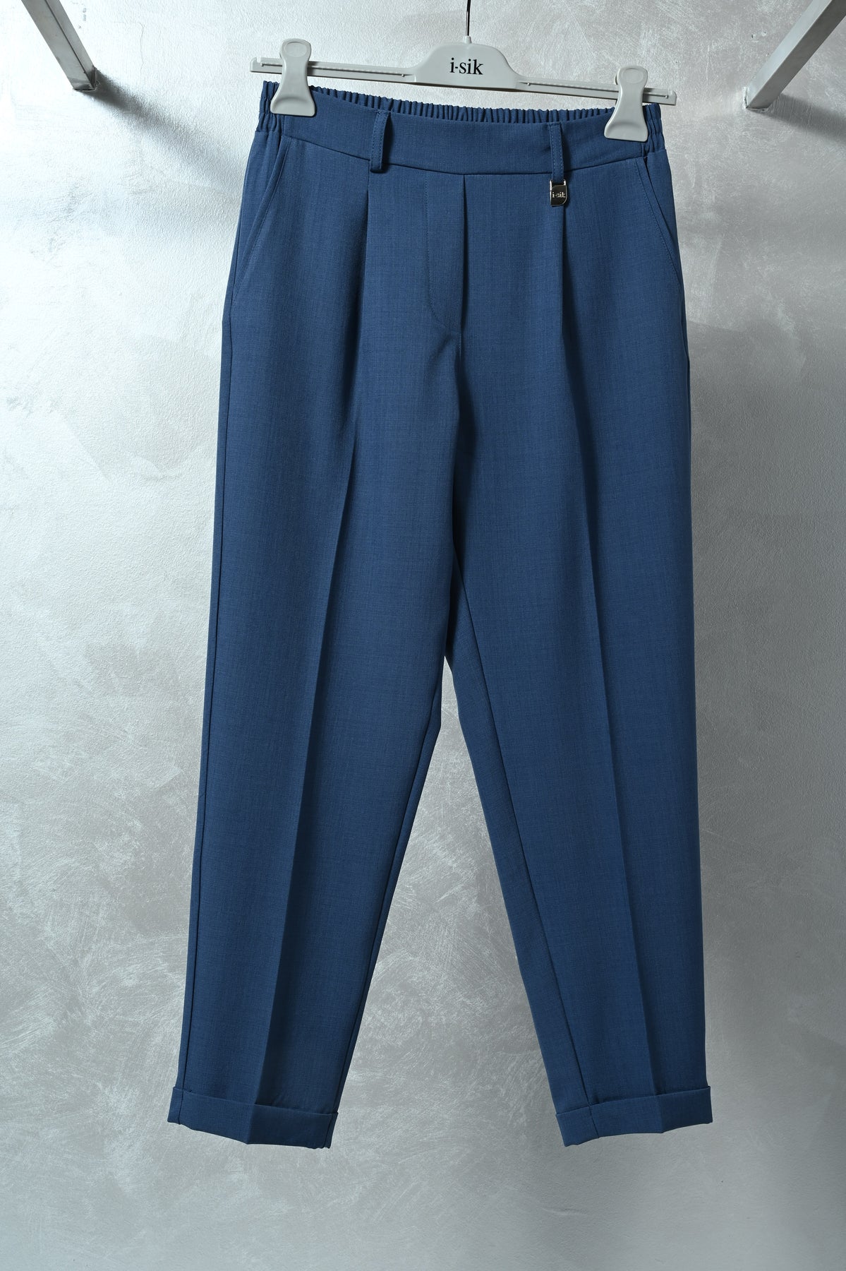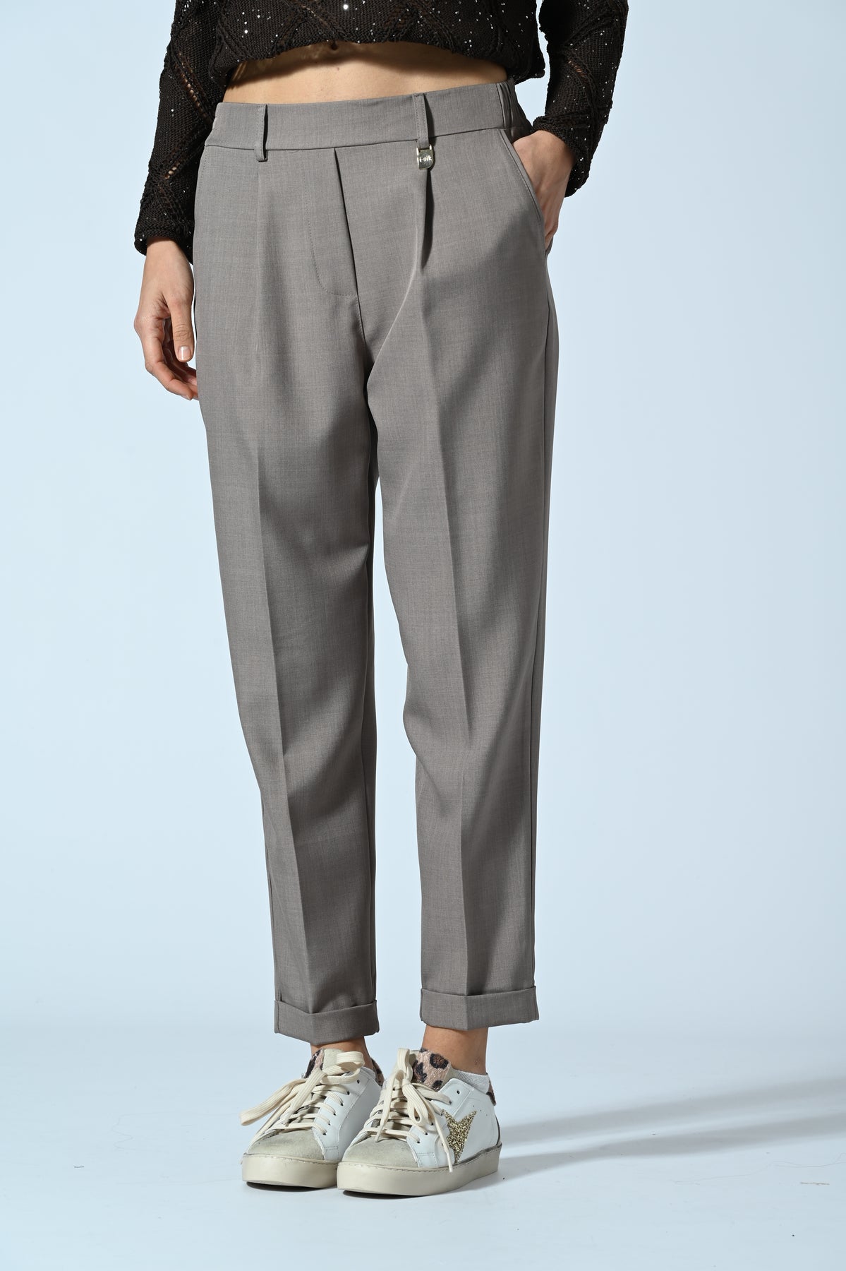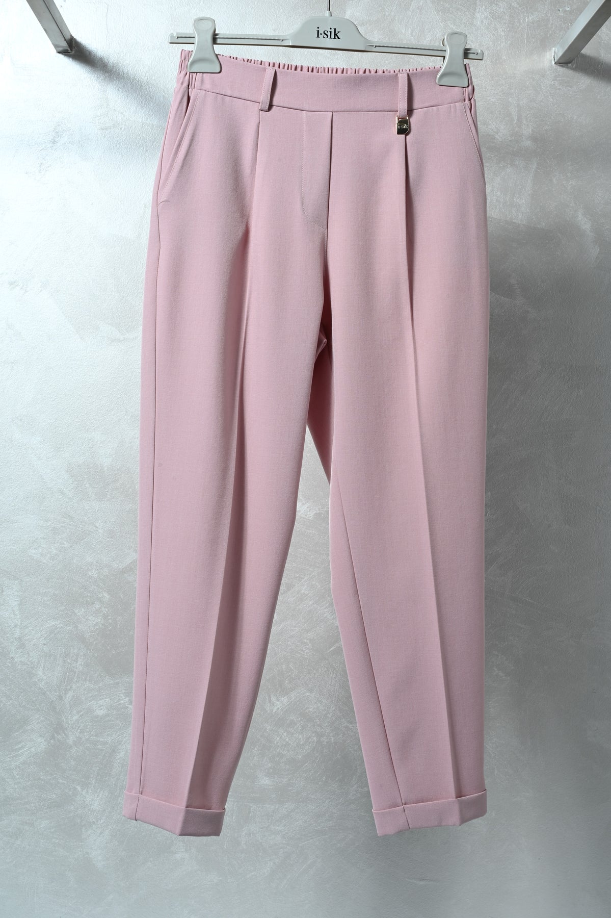 Pantalone in tessuto fluido e morbido, con gamba leggermente affusolata verso la caviglia ed elastico in vita per garantire comfort e vestibilità. La piega frontale valorizza la linea elegante del capo, rendendolo perfetto per look raffinati, business o casual-chic contemporanei.