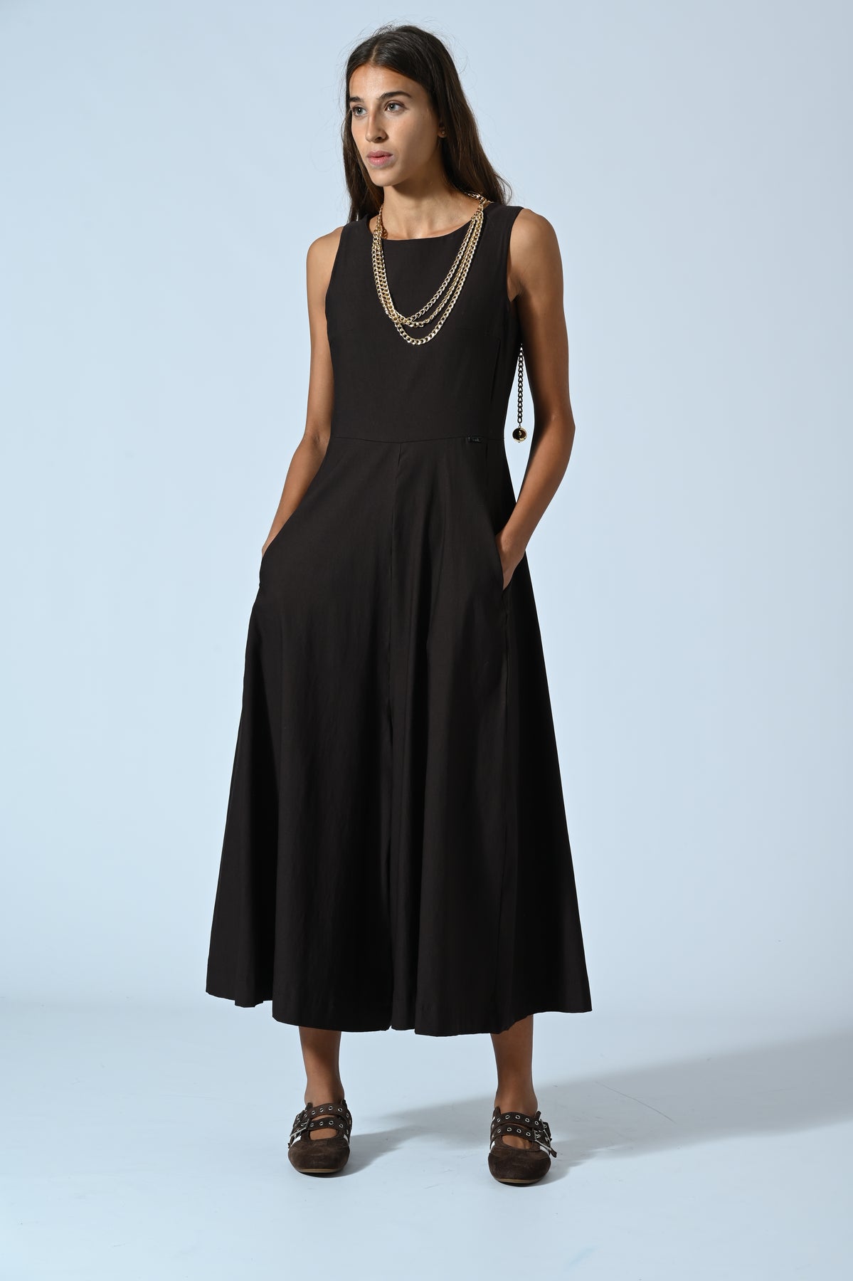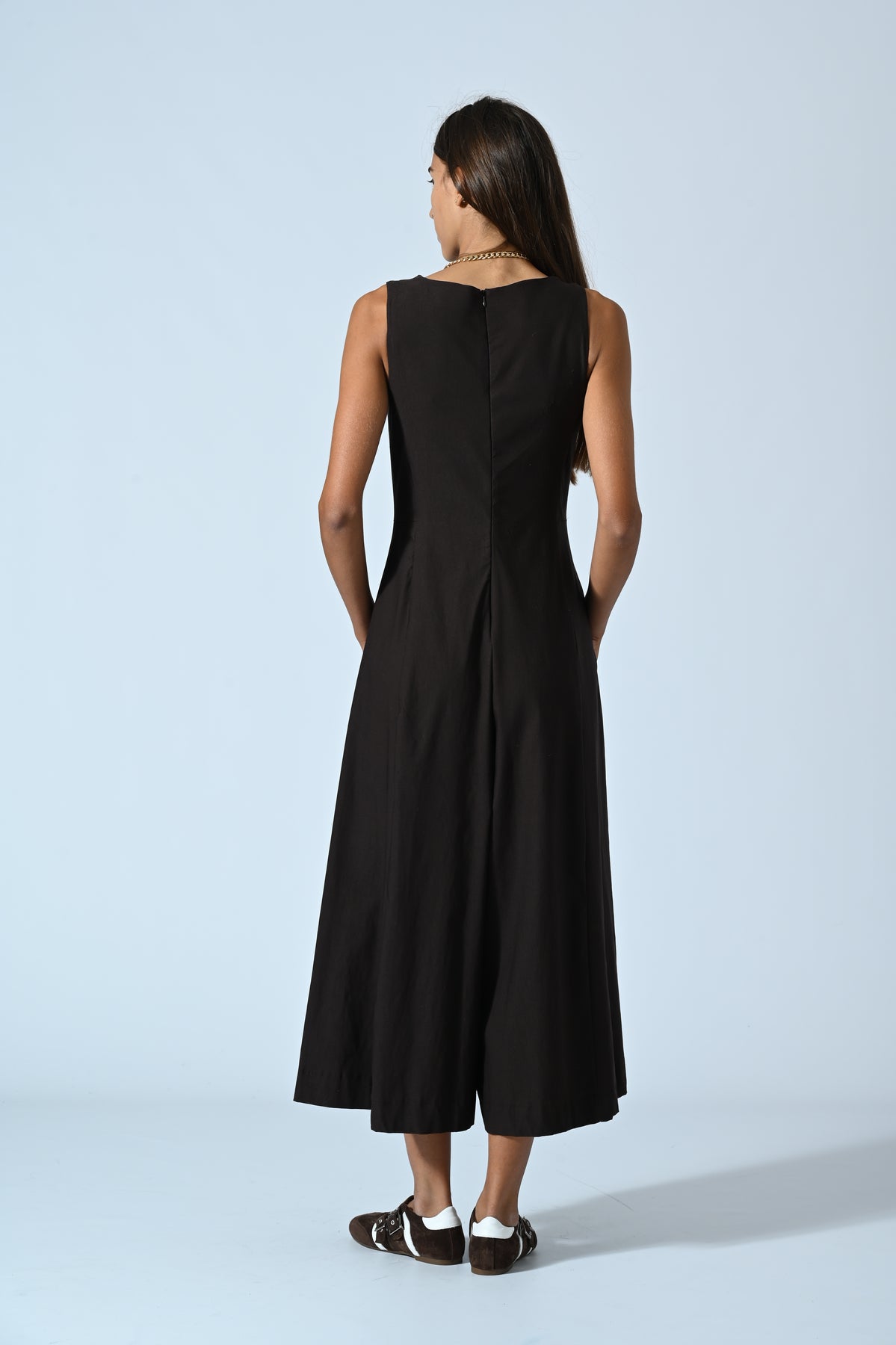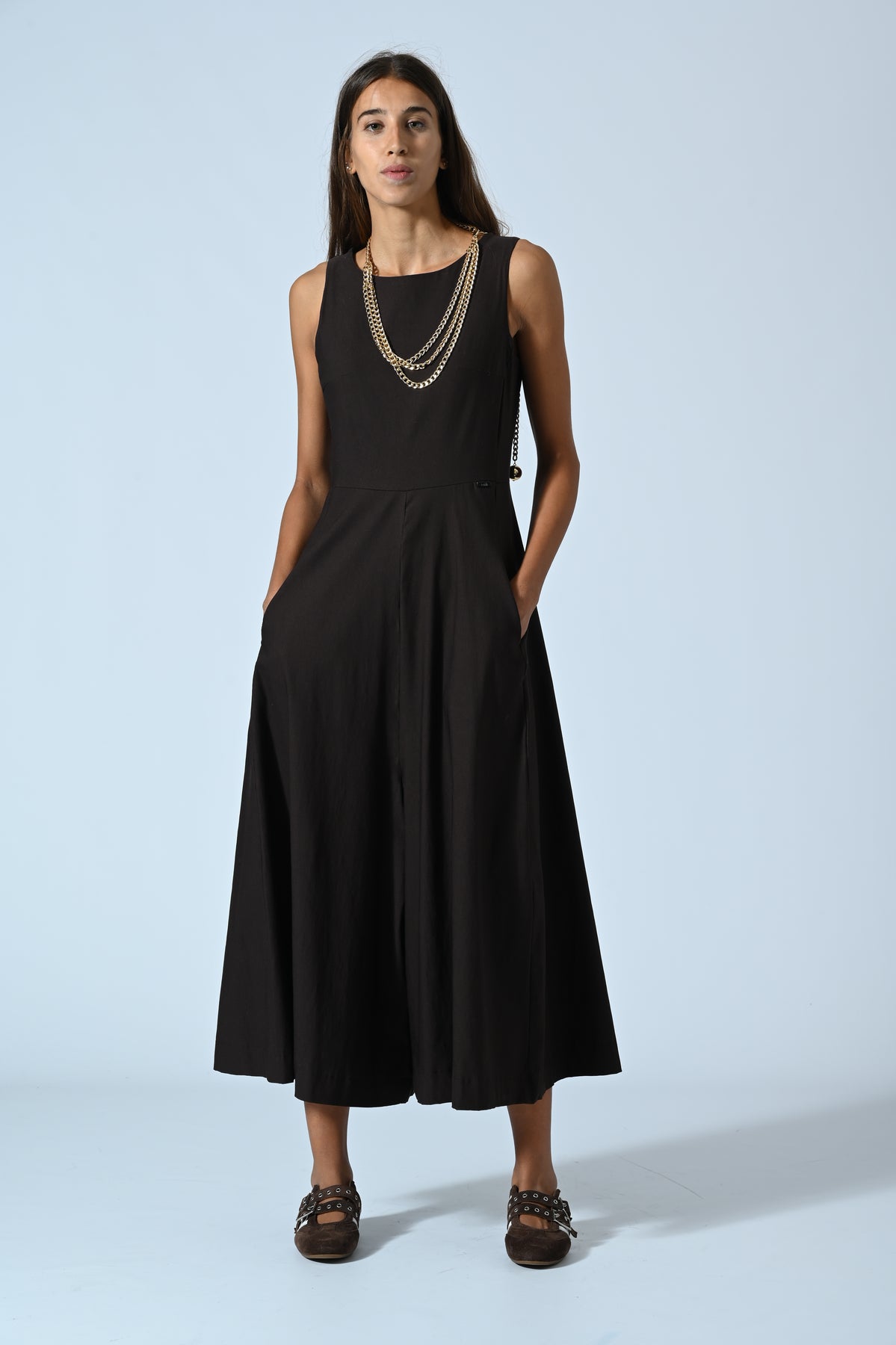La jumpsuit smanicata in bengalina è il capo unico che semplifica il look senza rinunciare allo stile. Il fit over dona libertà e carattere, mentre il tessuto elasticizzato segue i movimenti con leggerezza. Perfetta da indossare di giorno con sneakers o di sera con tacchi e accessori statement.
