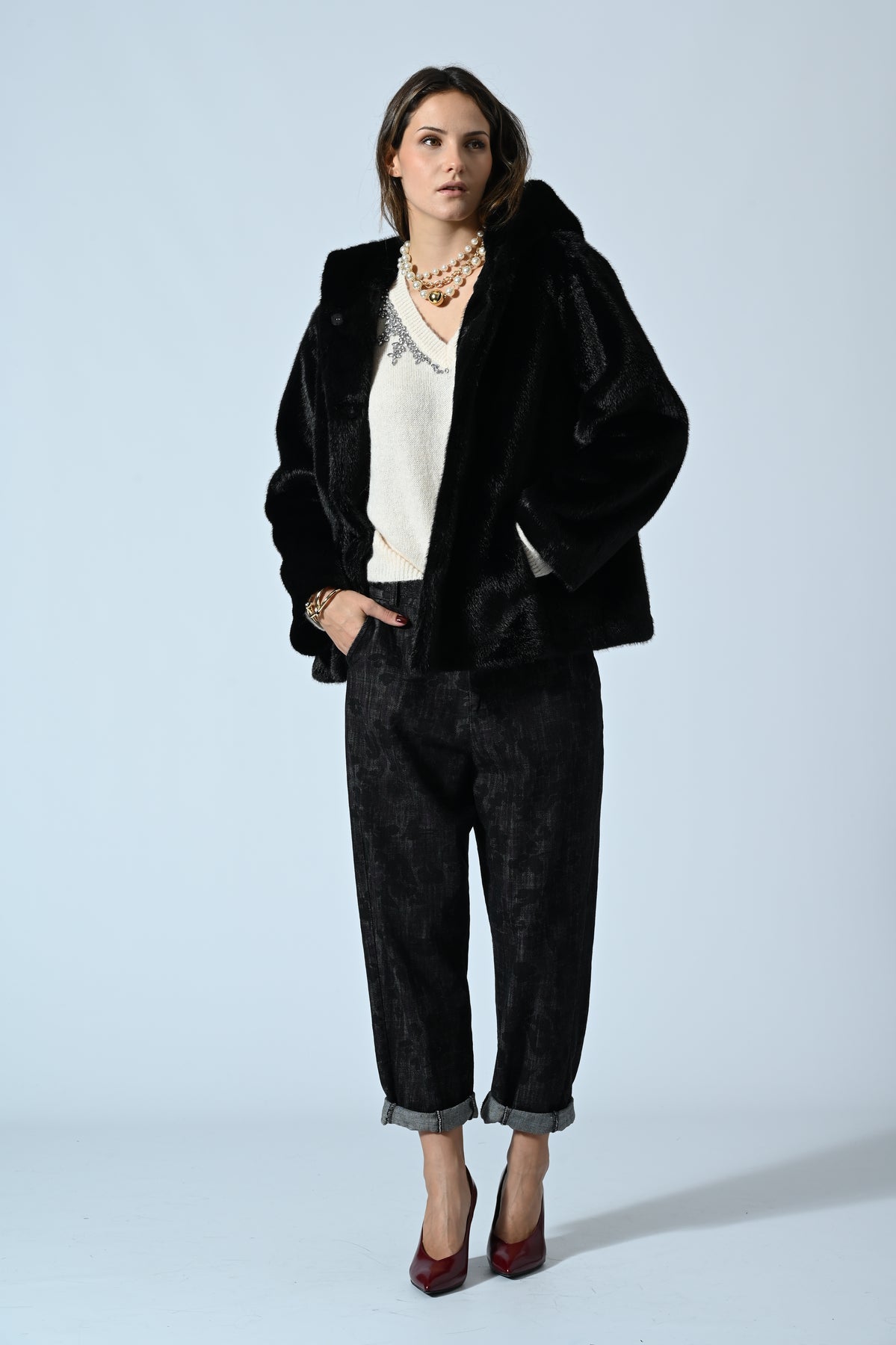 Denim grigio scuro fit balloon con fantasia a fiori.Morbido, femminile e dallo stile contemporaneo.