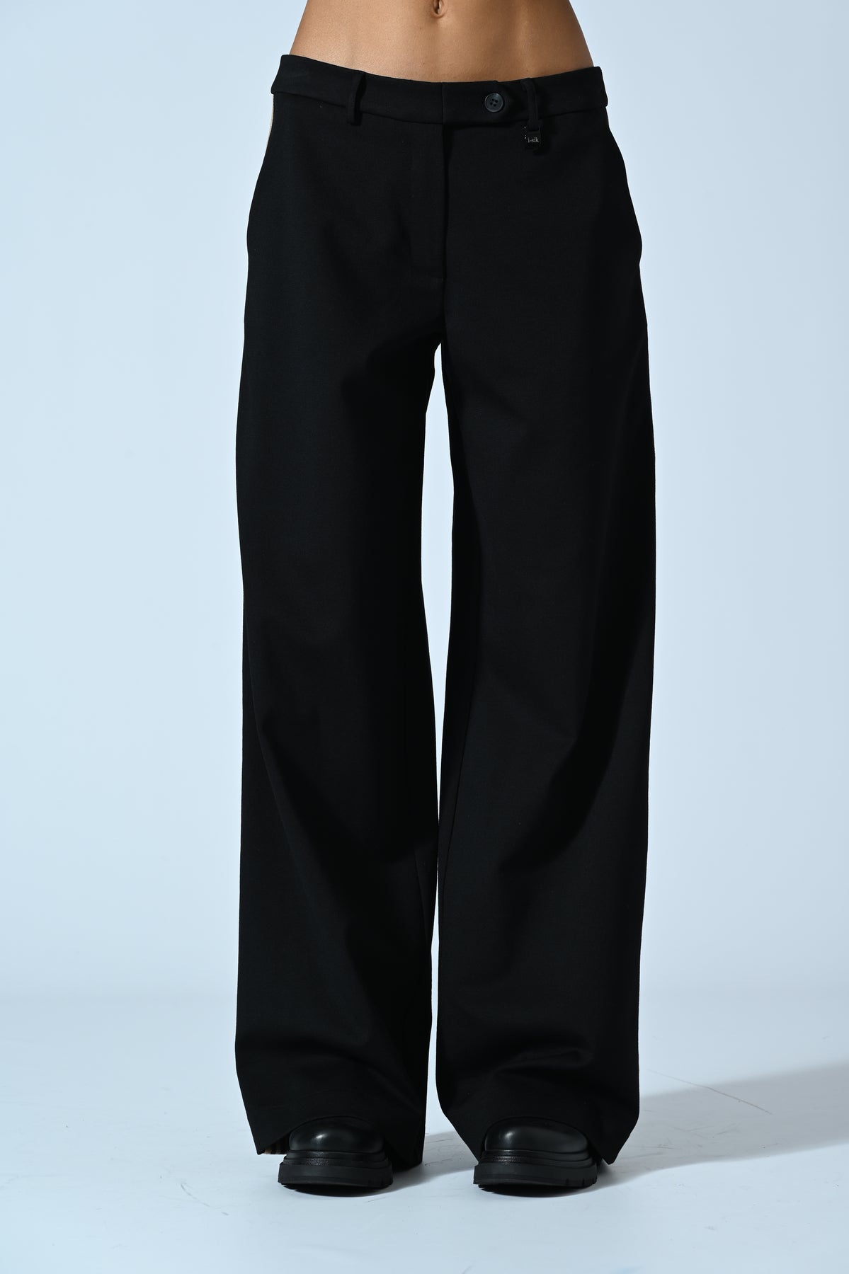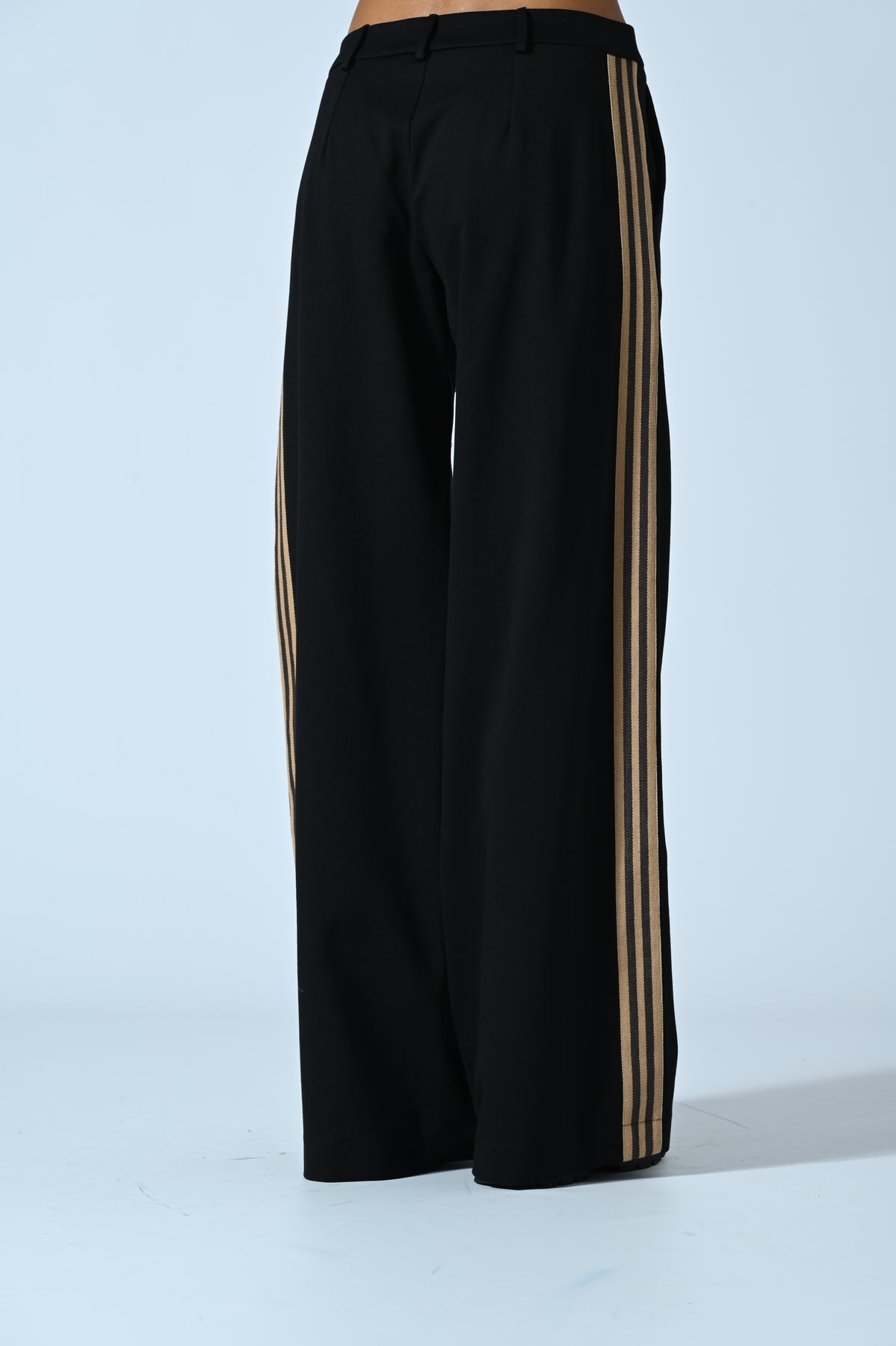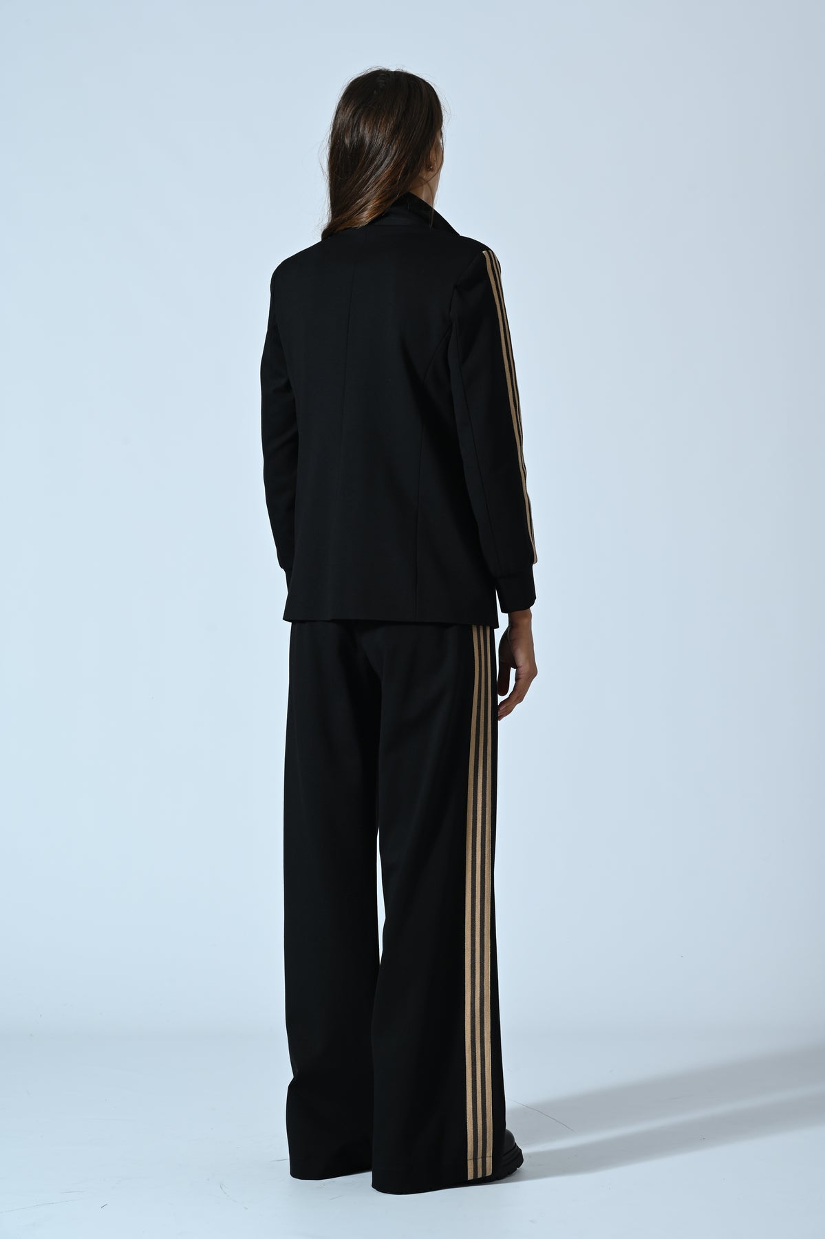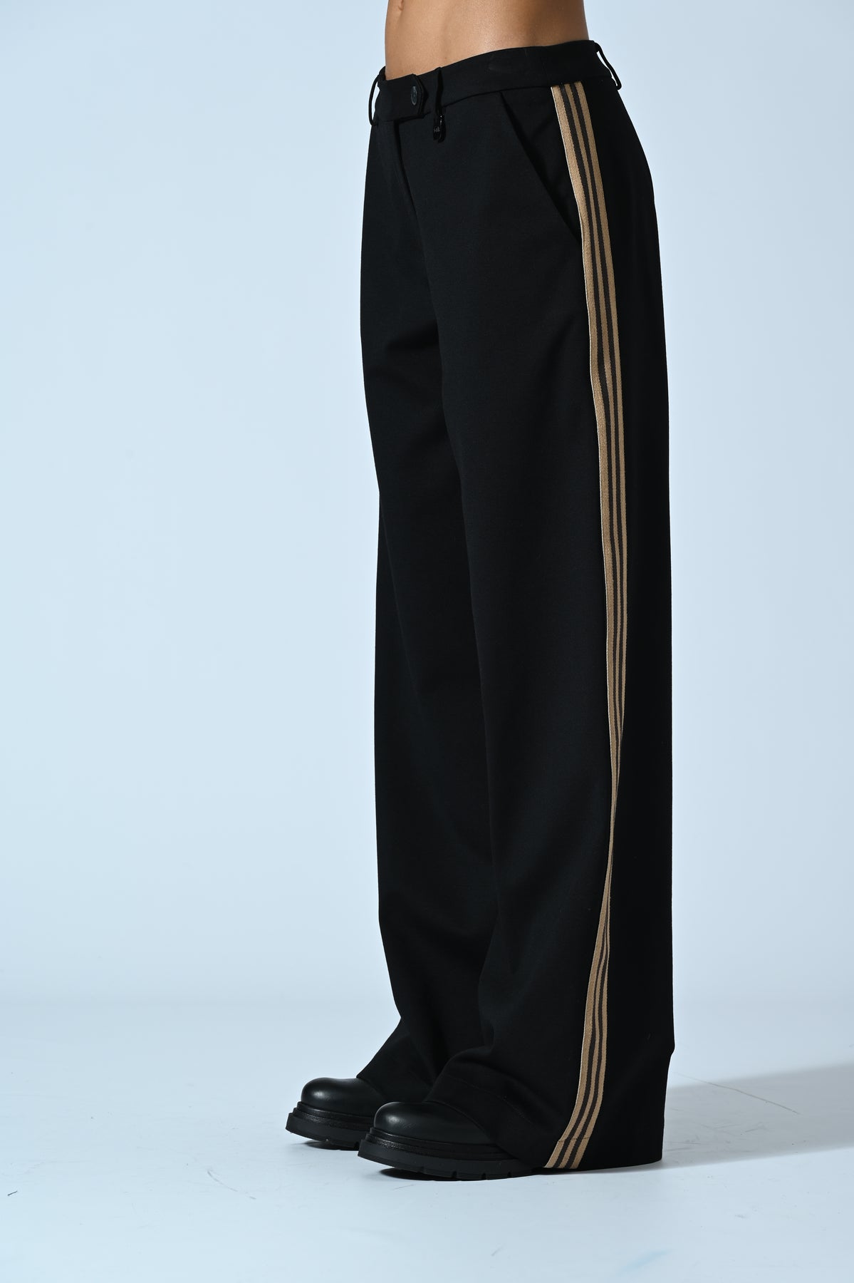 Questo pantalone a gamba dritta unisce il comfort della viscosa elasticizzata a un design grintoso e sofisticato. La banda laterale a tre strisce dorate illumina il profilo del capo, slanciando la silhouette e aggiungendo un dettaglio fashion che lo rende perfetto dal giorno alla sera.