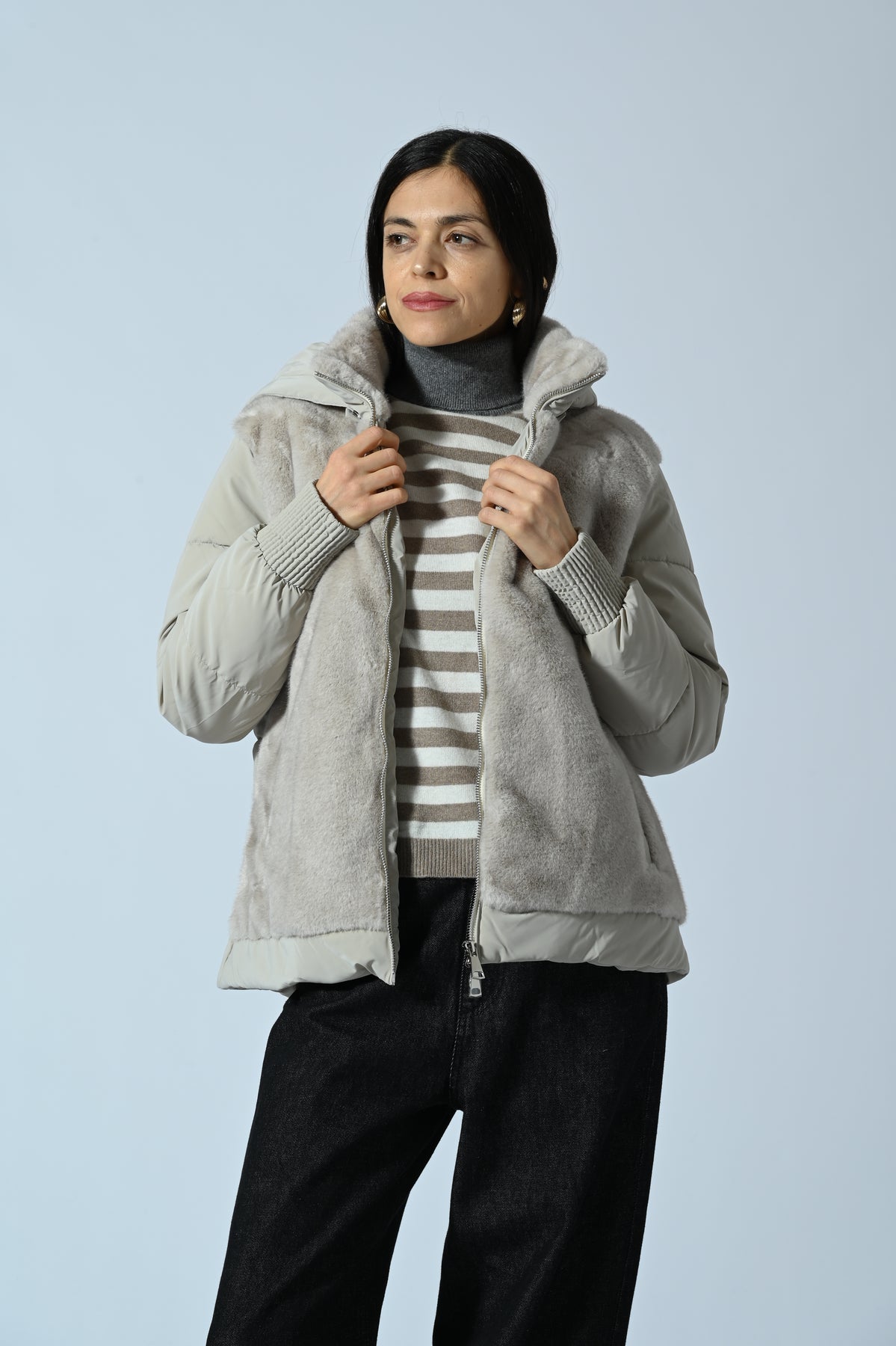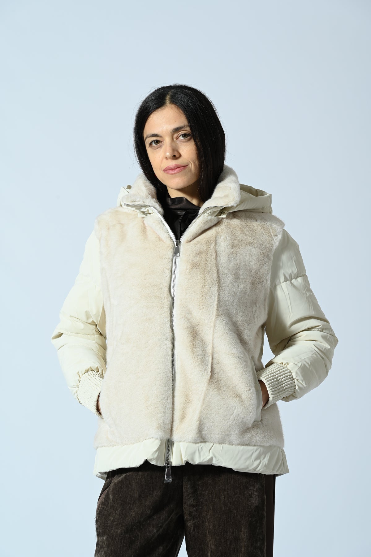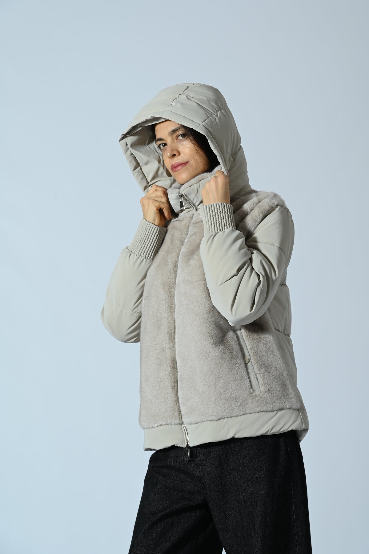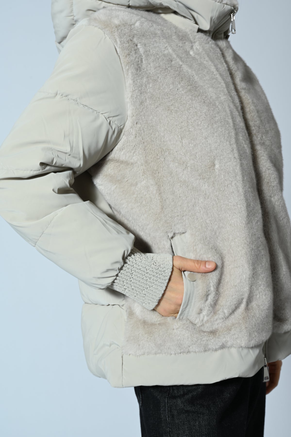 Giubbotto corto con cappuccio, caratterizzato da inserti in ecopelliccia su tutta la parte frontale e imbottitura effetto trapuntato sul resto del capo. Design moderno e avvolgente, perfetto per look urbani e casual-chic di tendenza.