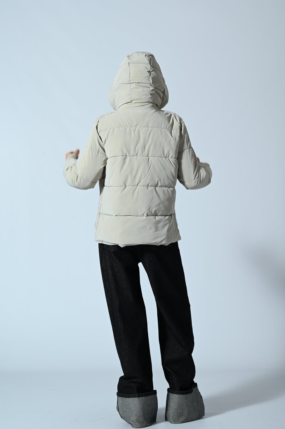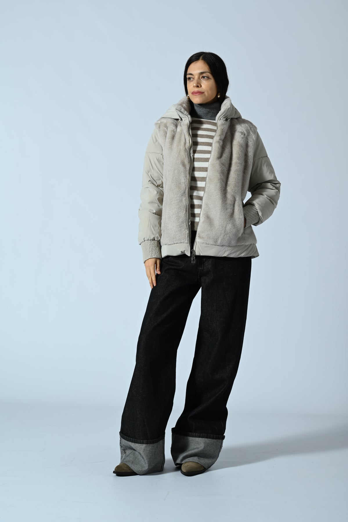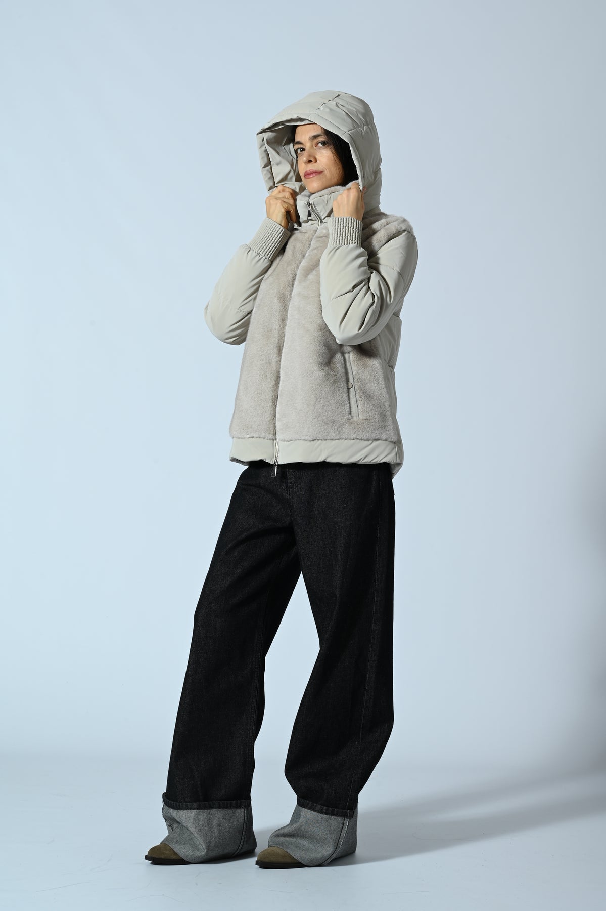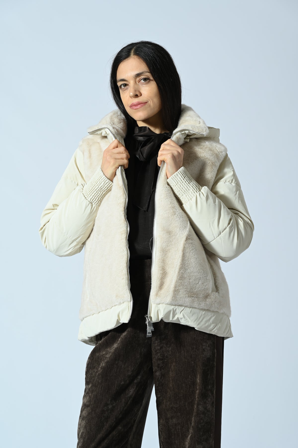 Giubbotto corto con cappuccio, caratterizzato da inserti in ecopelliccia su tutta la parte frontale e imbottitura effetto trapuntato sul resto del capo. Design moderno e avvolgente, perfetto per look urbani e casual-chic di tendenza.