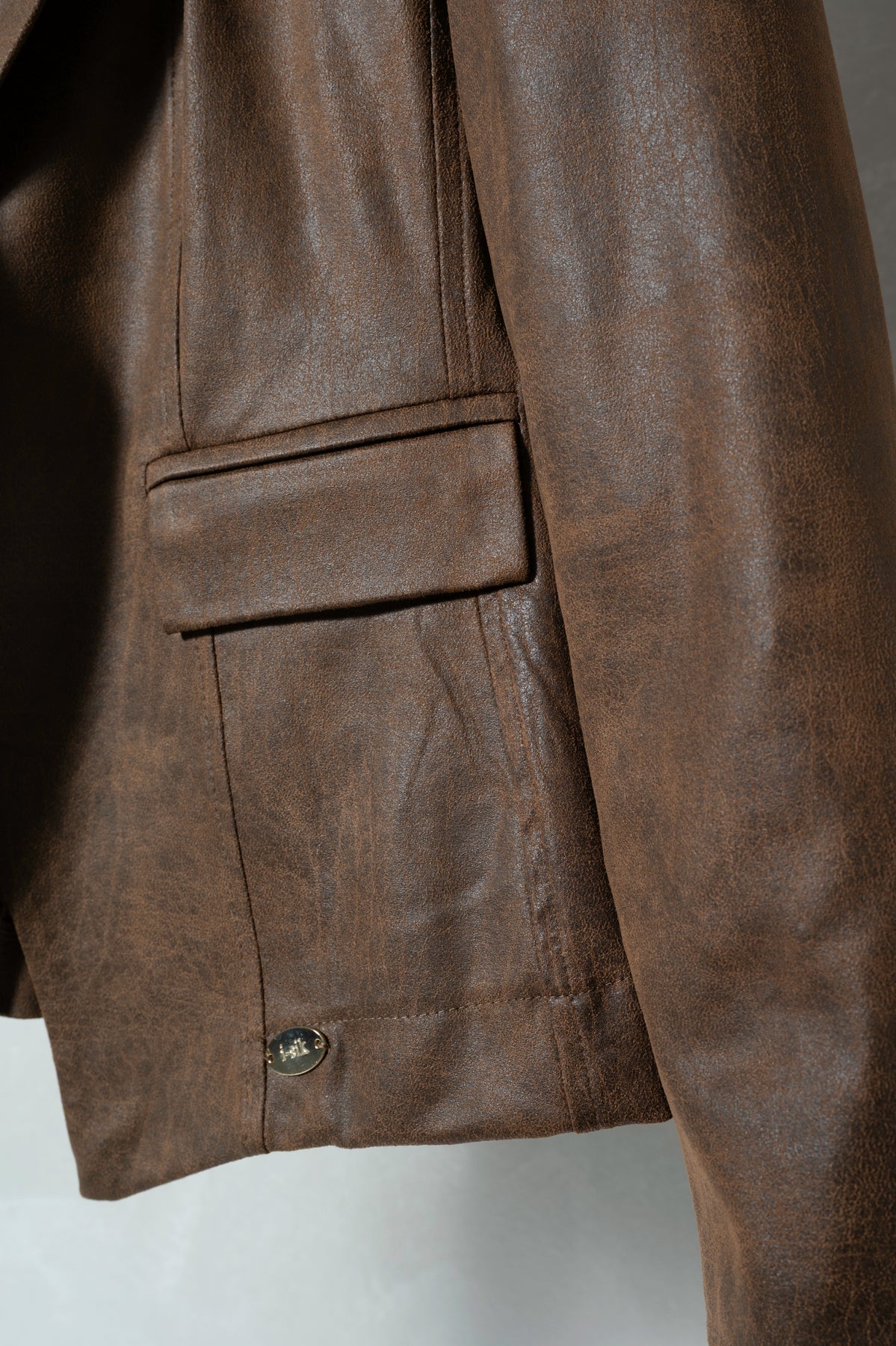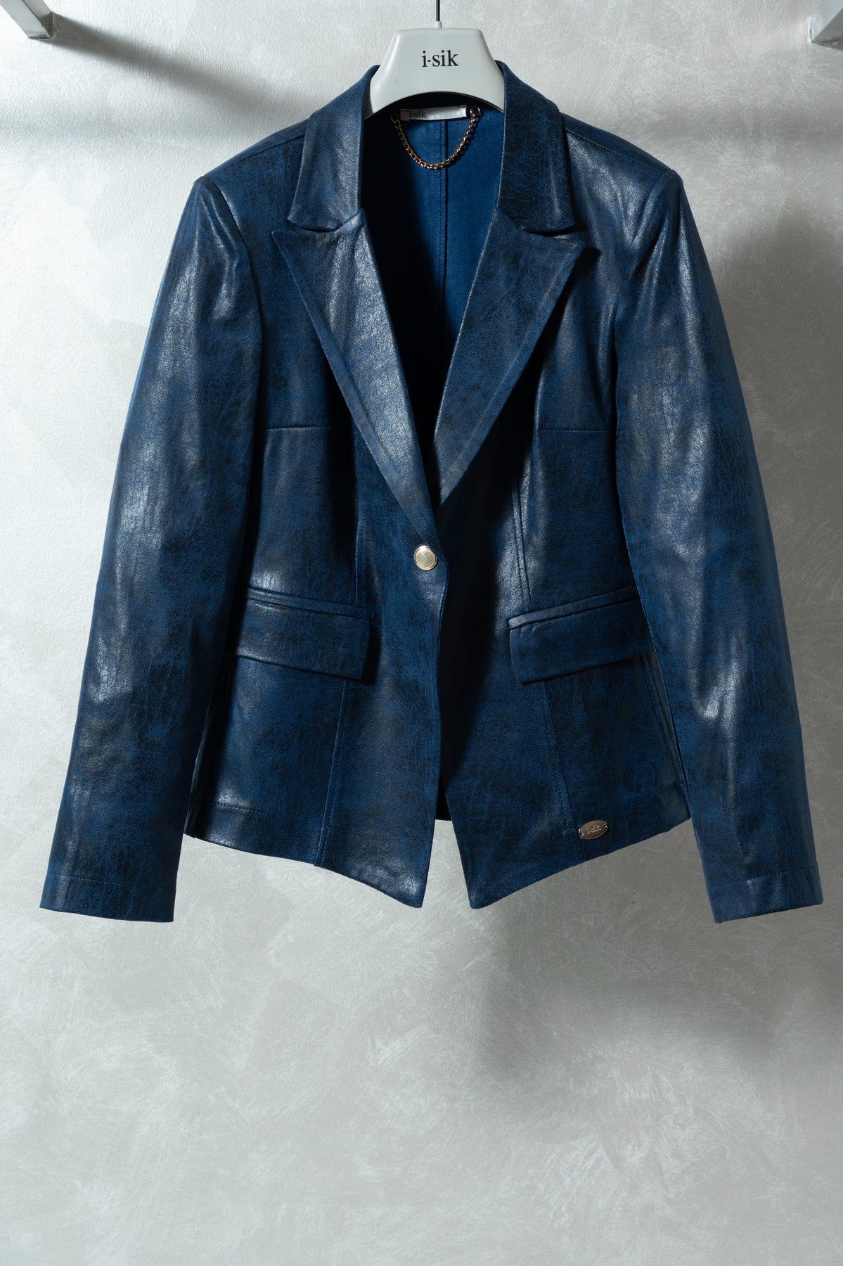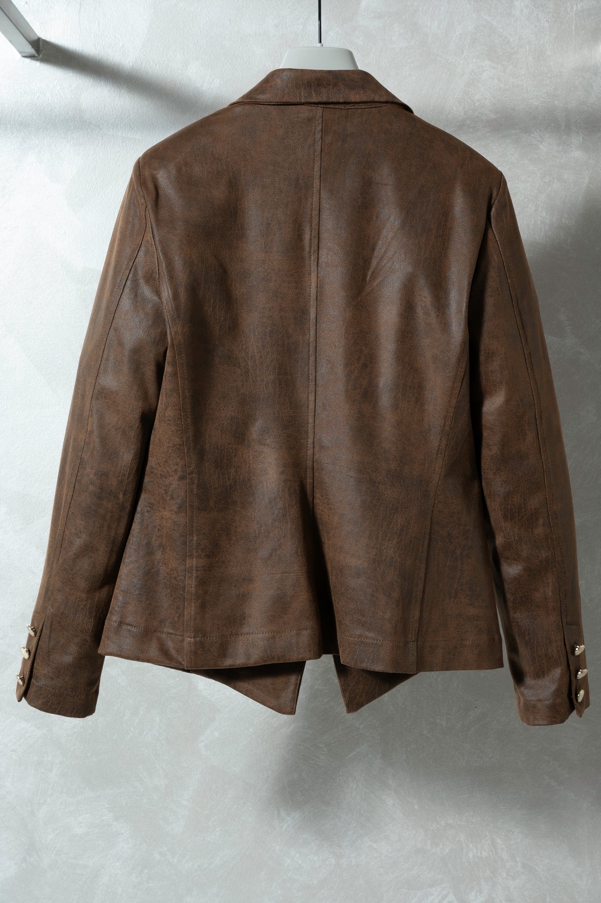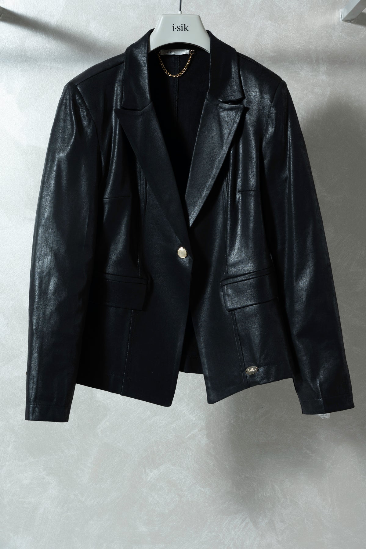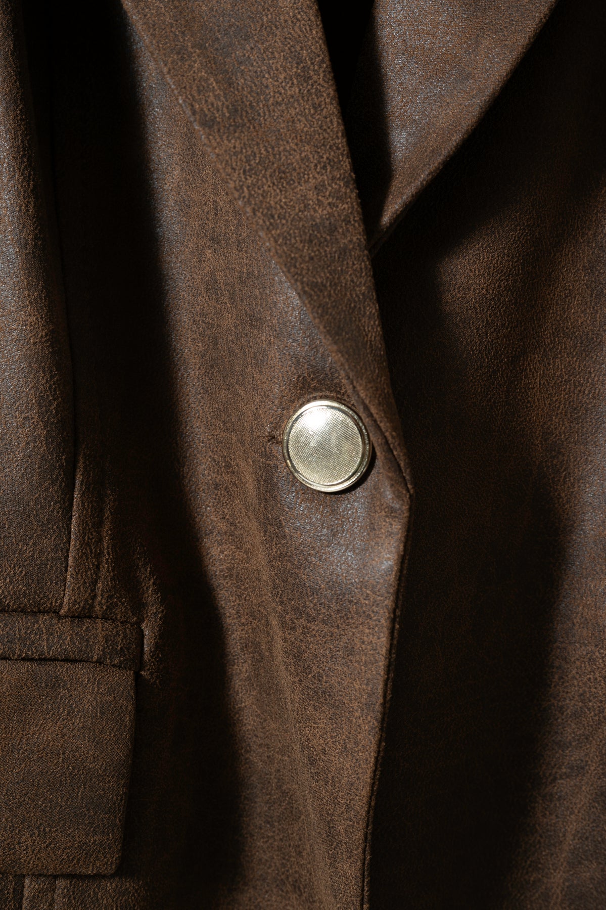 Blazer in ecopelle dal design deciso e contemporaneo, caratterizzato da un bottone platino frontale e tre bottoni coordinati sui polsi. Strutturato ed elegante, è perfetto per completare look moderni e sofisticati, dal casual-chic all’urban style.