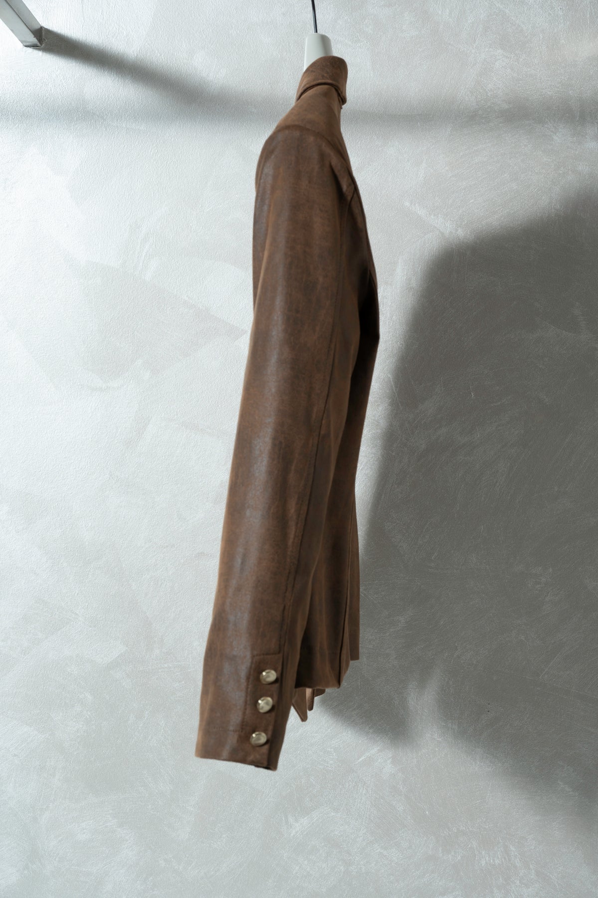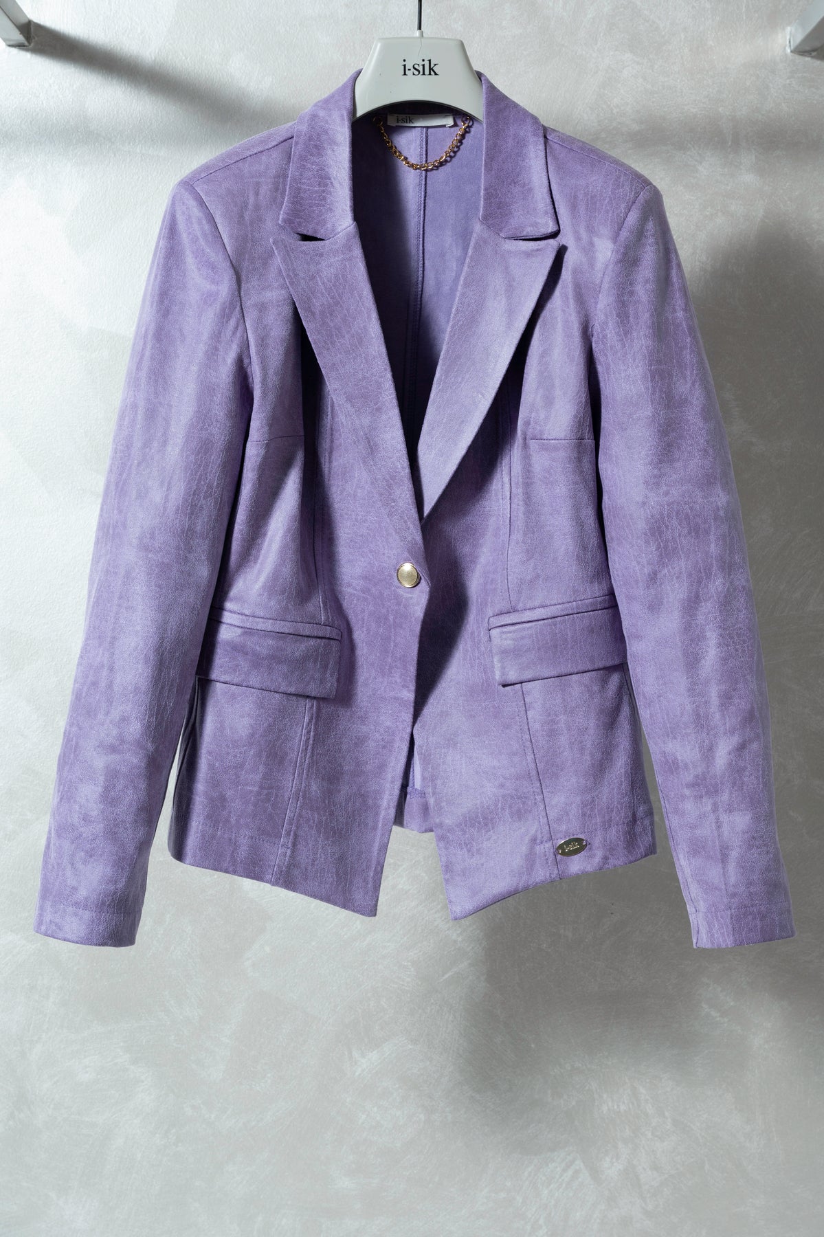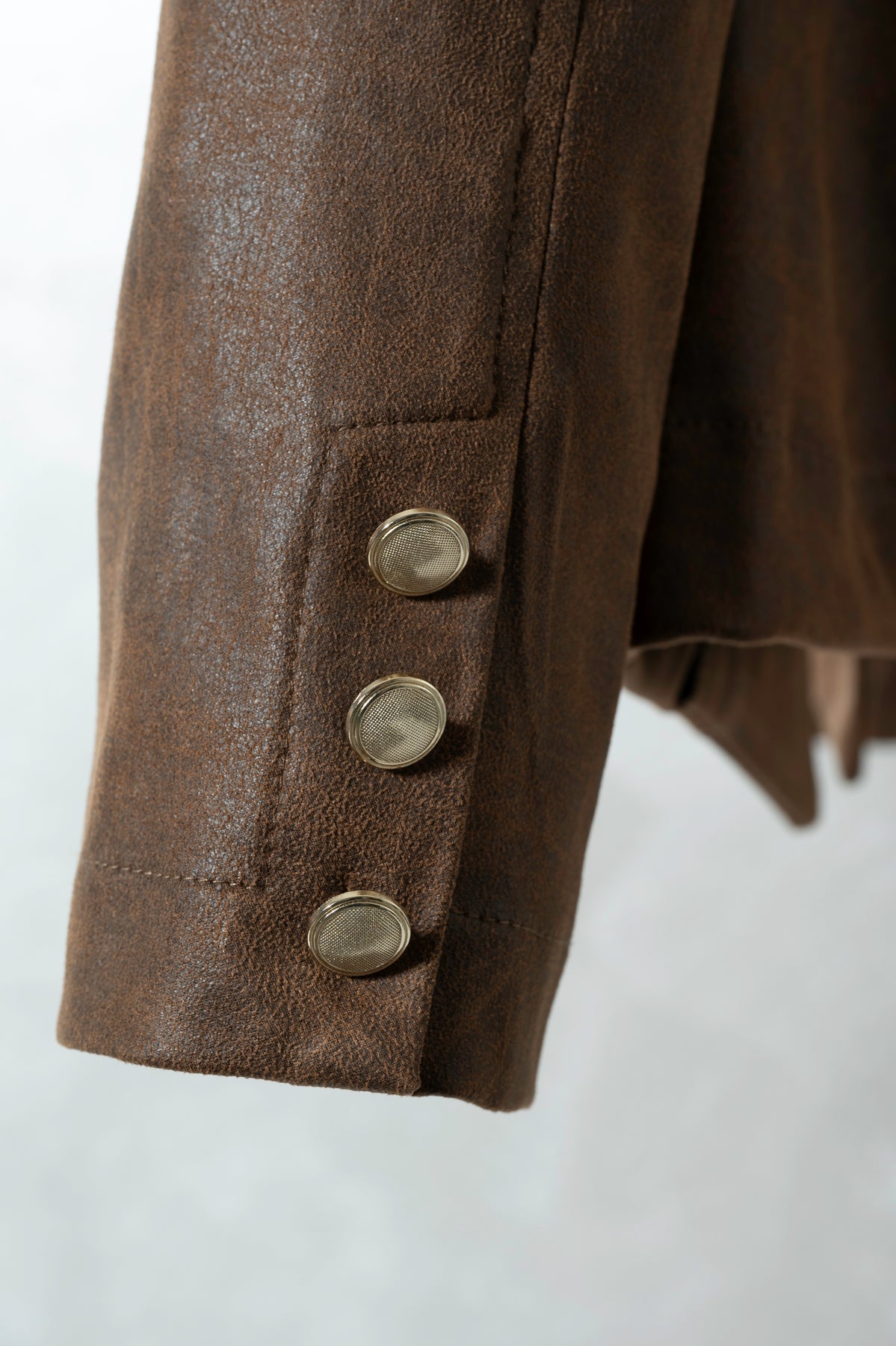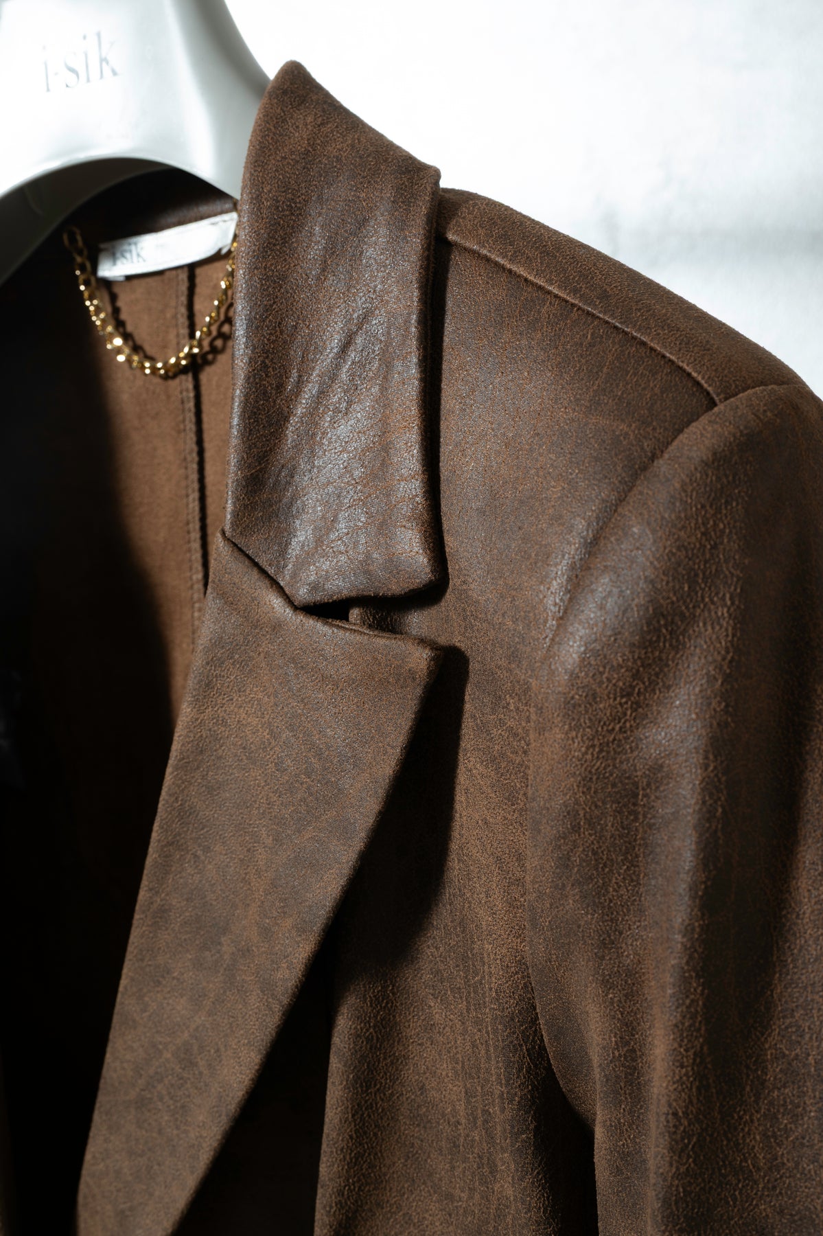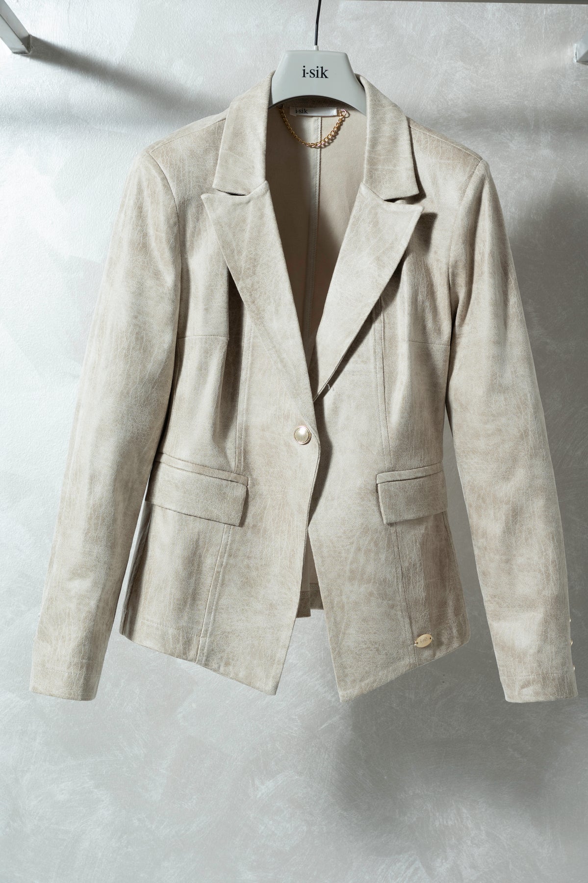 Blazer in ecopelle dal design deciso e contemporaneo, caratterizzato da un bottone platino frontale e tre bottoni coordinati sui polsi. Strutturato ed elegante, è perfetto per completare look moderni e sofisticati, dal casual-chic all’urban style.