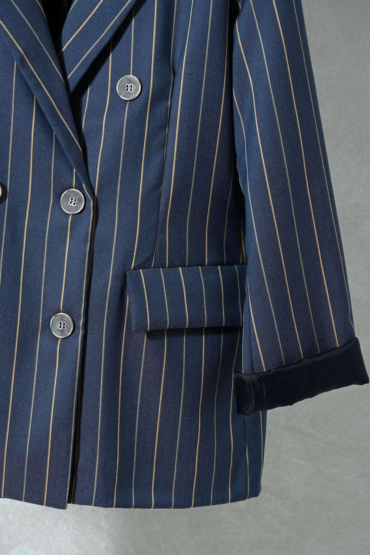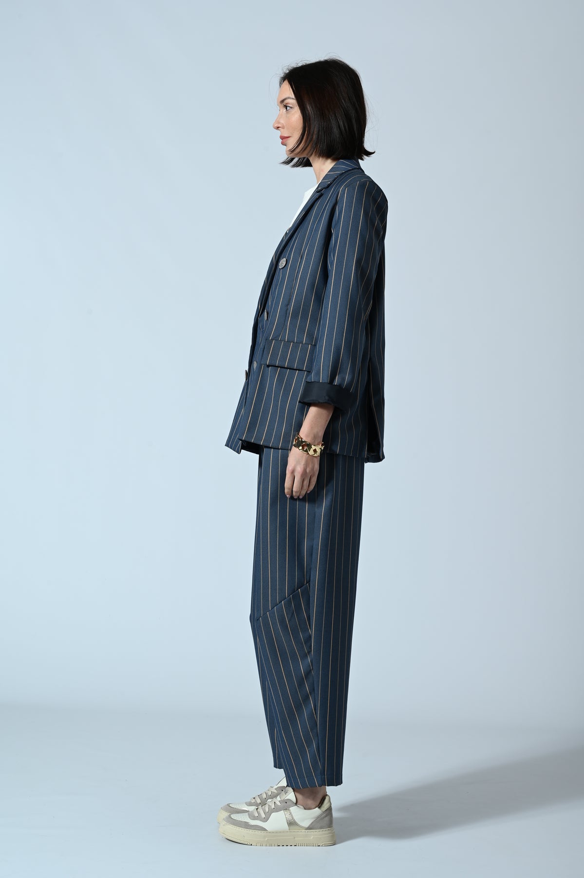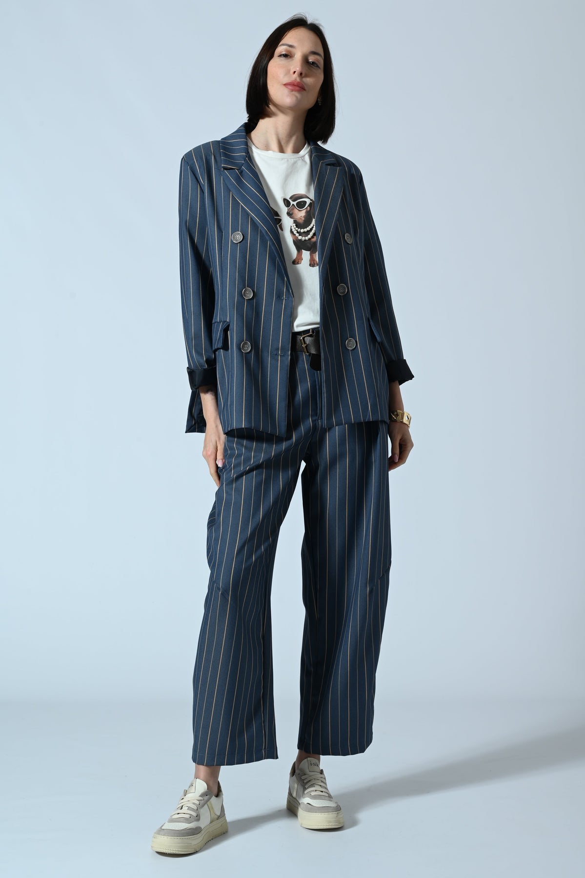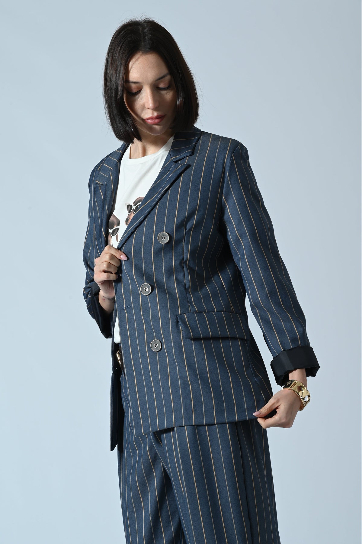 Blazer doppiopetto gessato dal fit over, dal design moderno e sartoriale. Linea versatile e femminile, perfetta da abbinare a pantaloni, gonne o jeans per look smart-casual e casual-chic contemporanei.