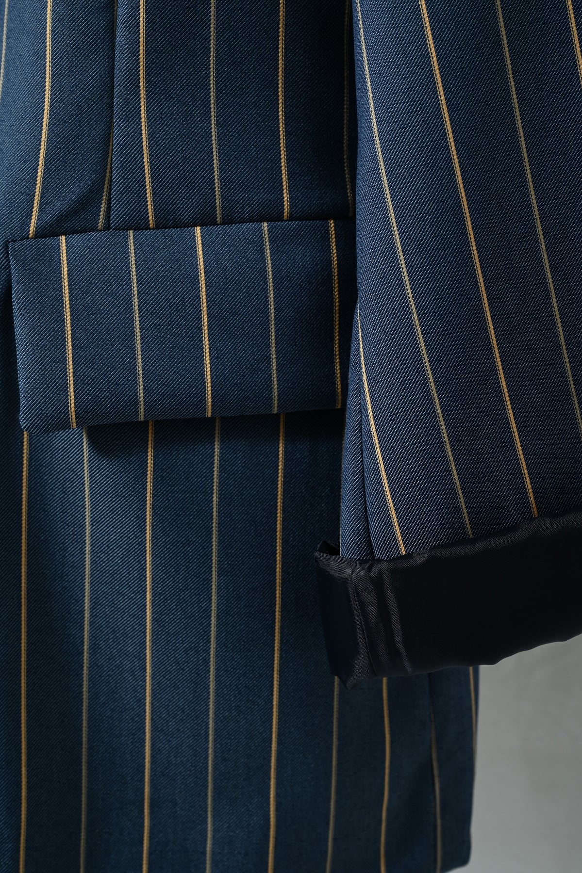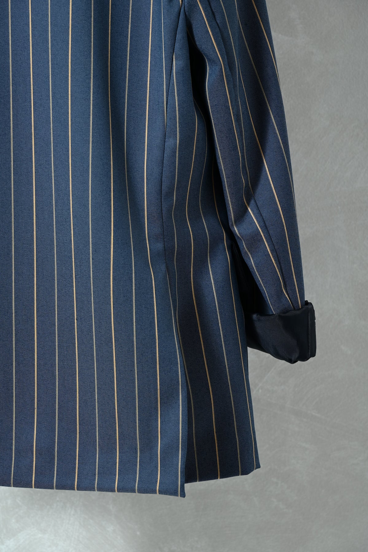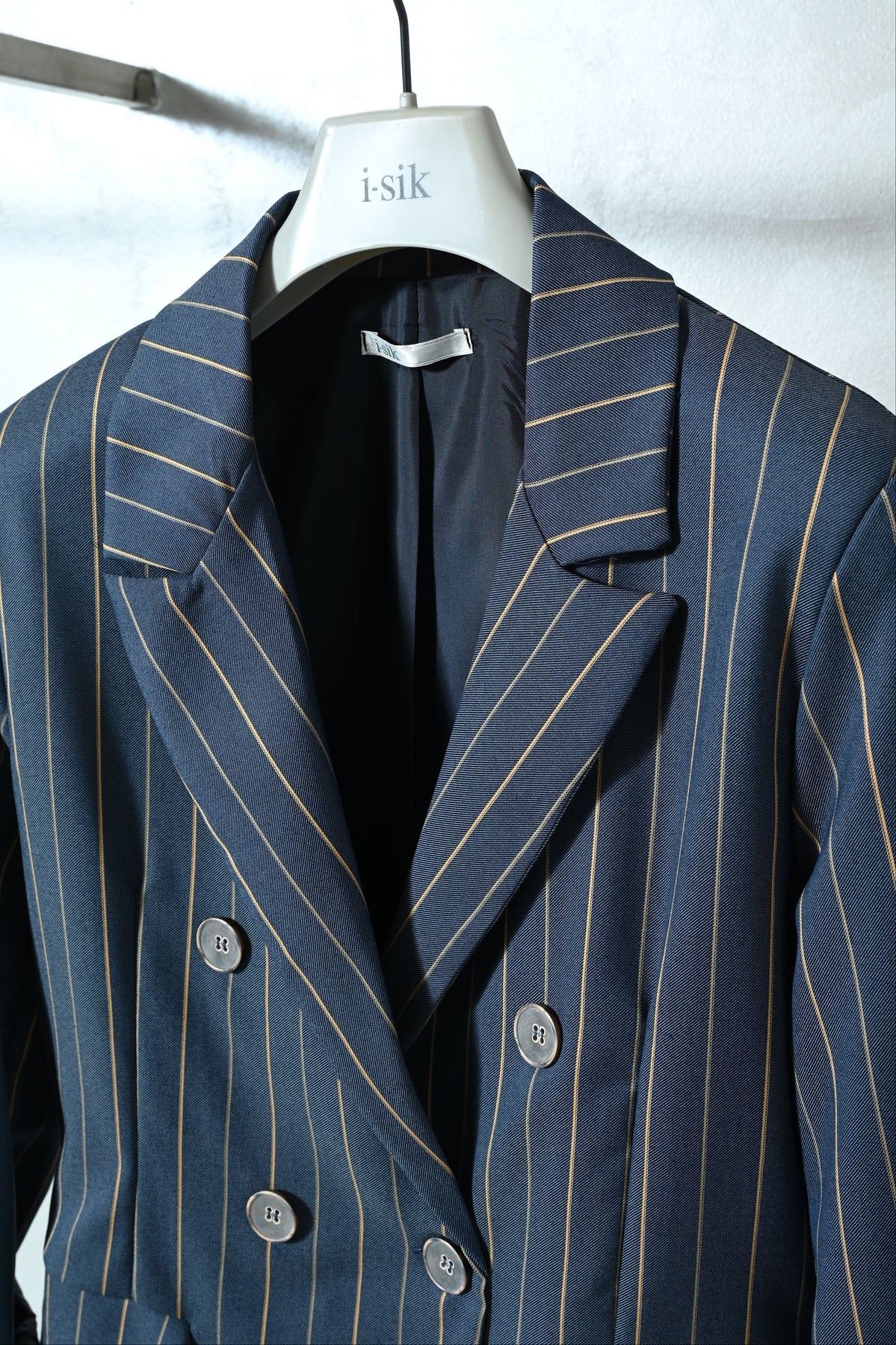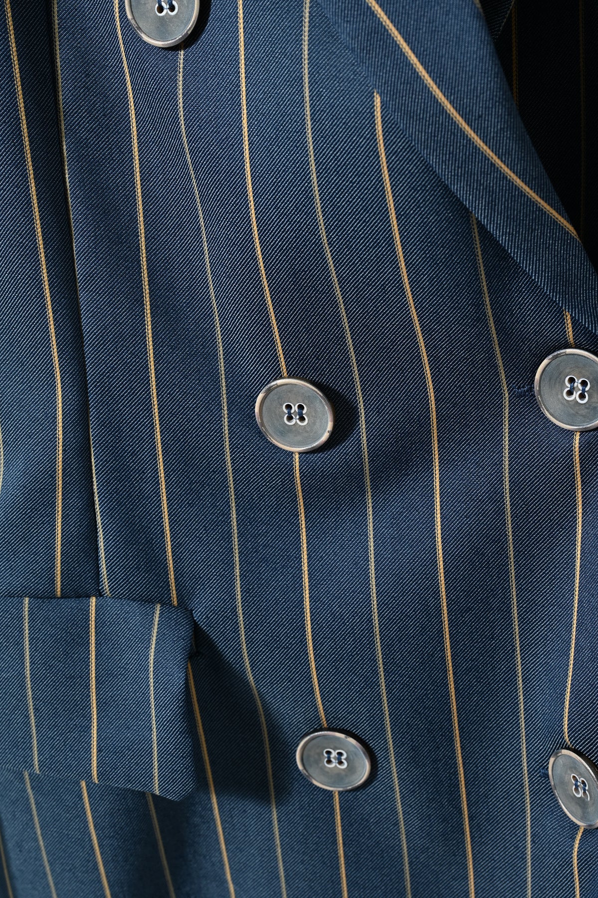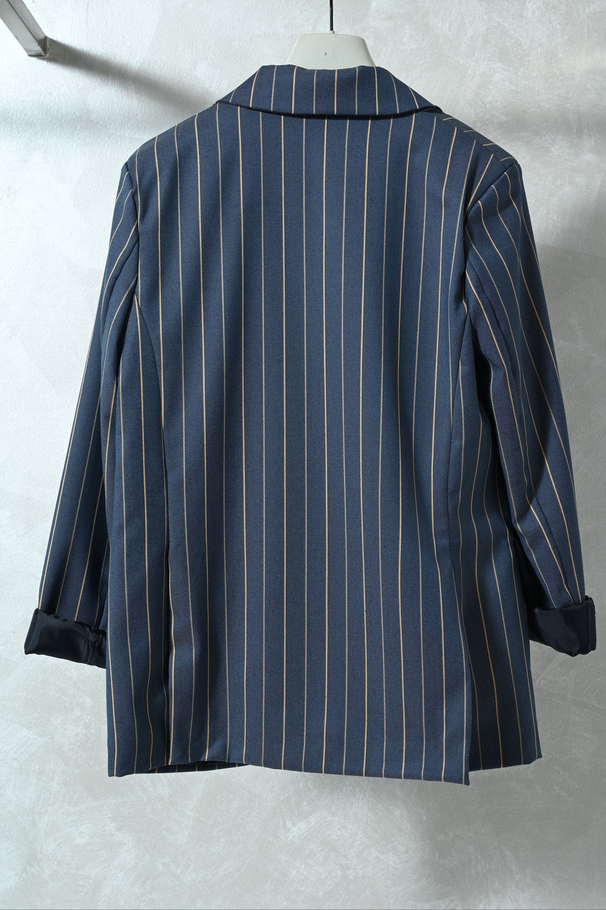 Blazer doppiopetto gessato dal fit over, dal design moderno e sartoriale. Linea versatile e femminile, perfetta da abbinare a pantaloni, gonne o jeans per look smart-casual e casual-chic contemporanei.