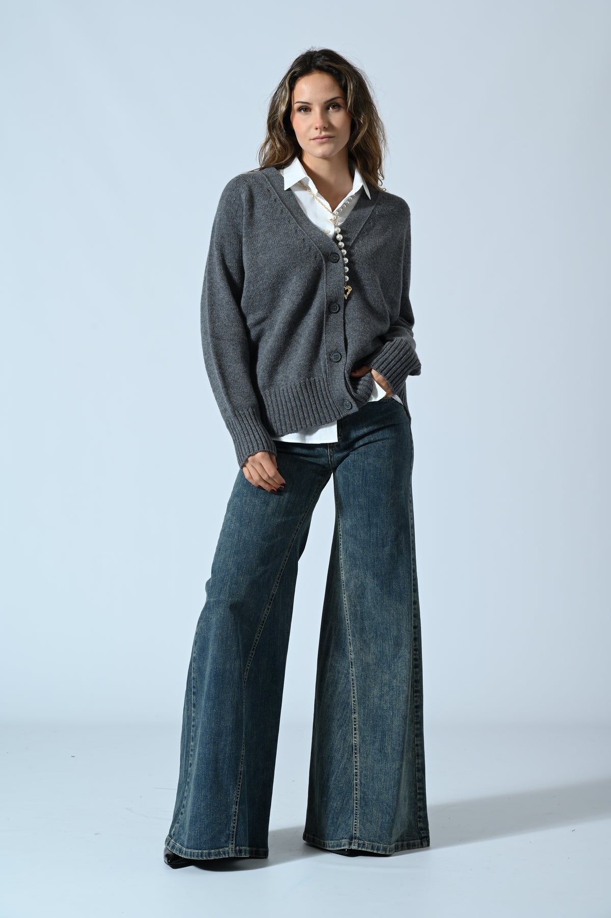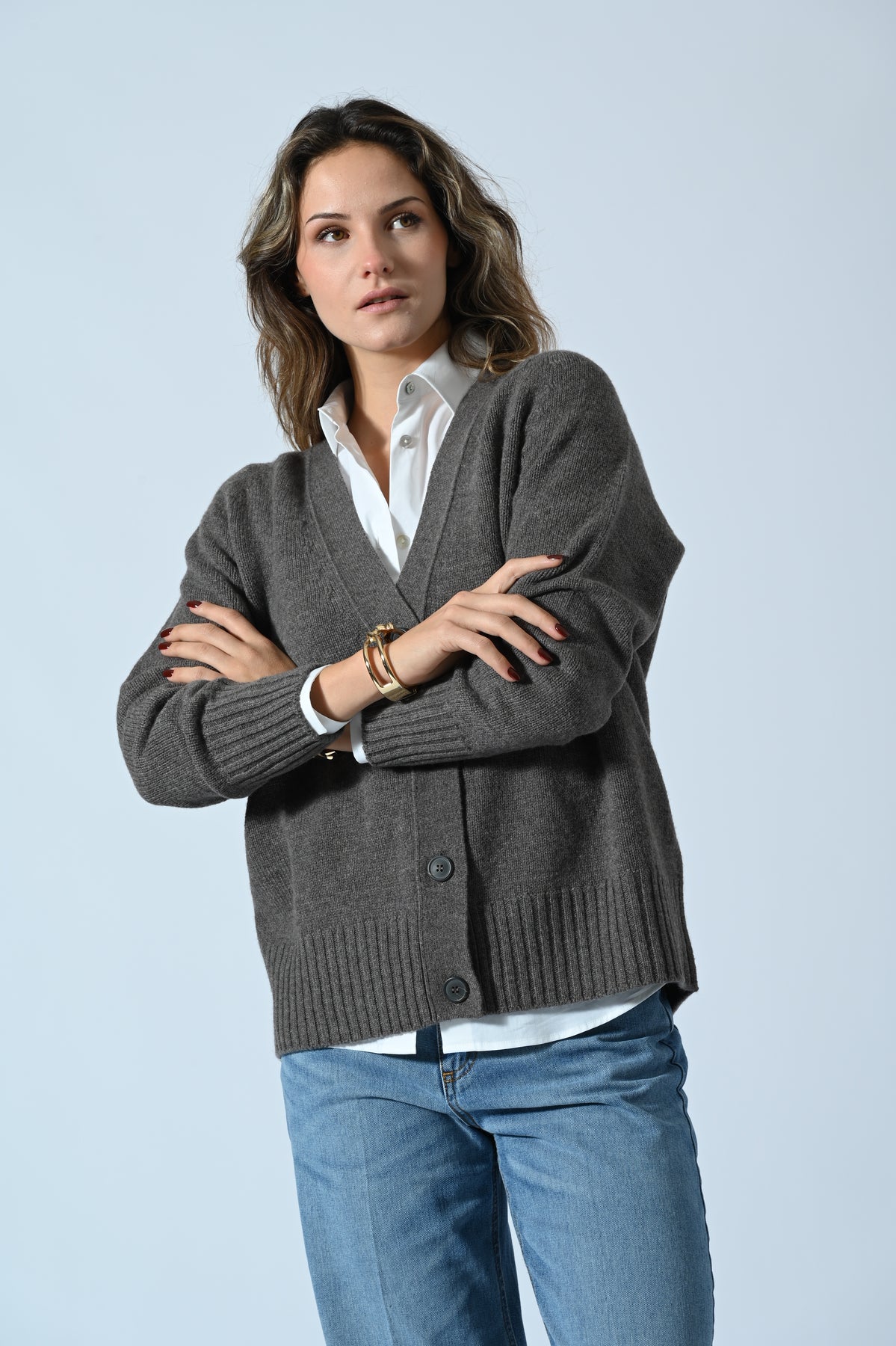 Cardigan realizzato in lana (90%) e cashmere (10%), morbido e avvolgente. La texture pregiata garantisce comfort e calore, mentre la linea pulita e versatile lo rende perfetto per look eleganti o casual-chic. Un capo essenziale per la stagione fredda, dall’allure raffinata e senza tempo.