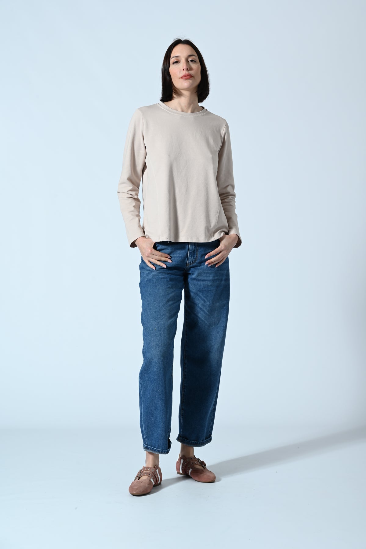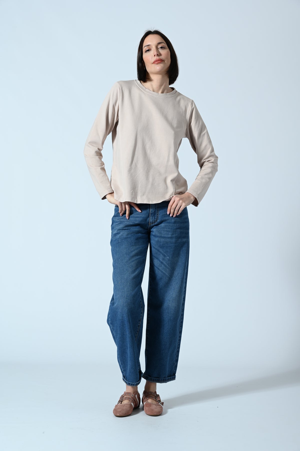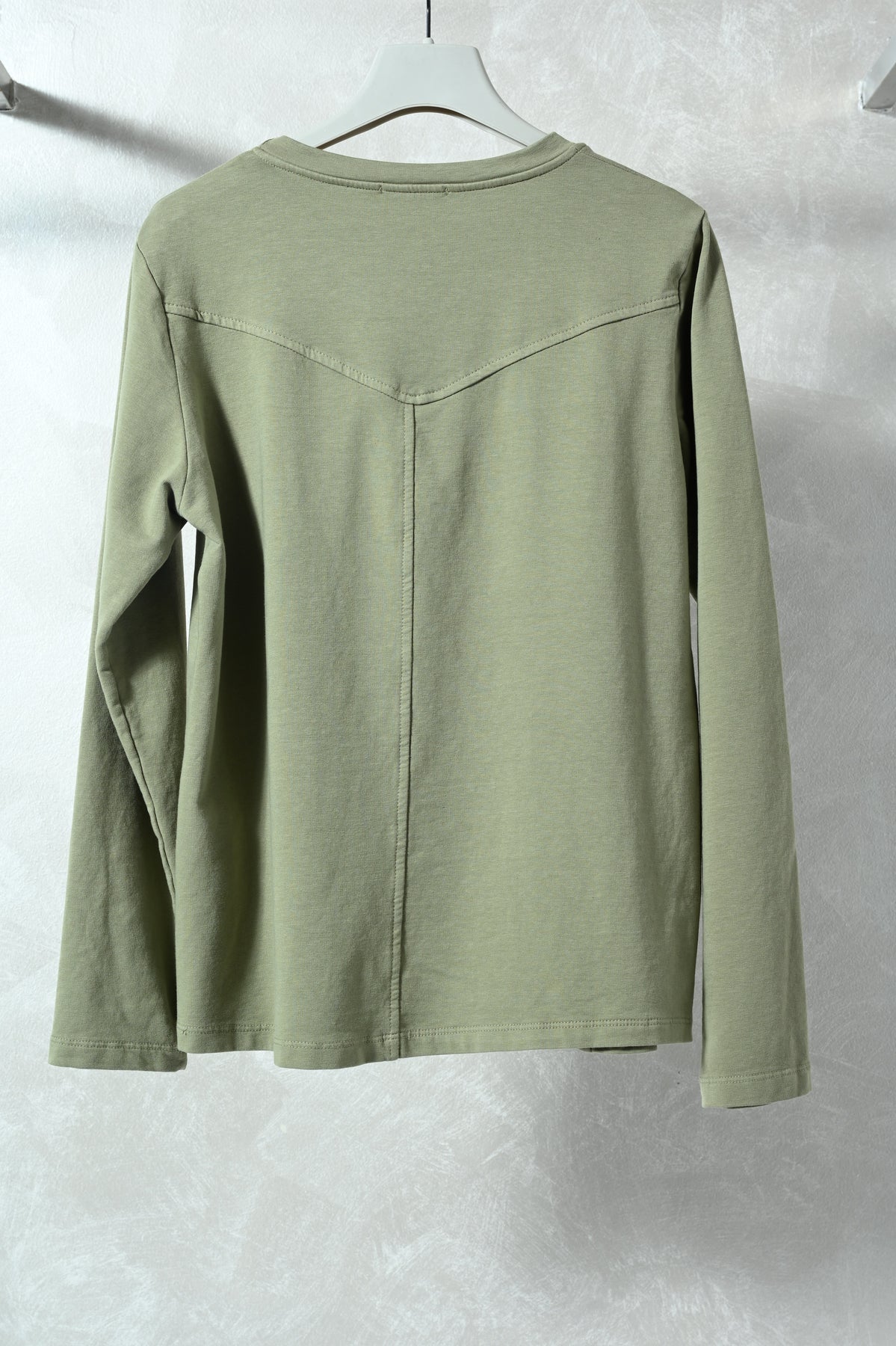 Felpa girocollo in cotone lavato, caratterizzata da originali cuciture frontali che scendono oblique donando dinamismo al design. Morbida e confortevole, è perfetta per completare look casual e contemporanei con un tocco distintivo.