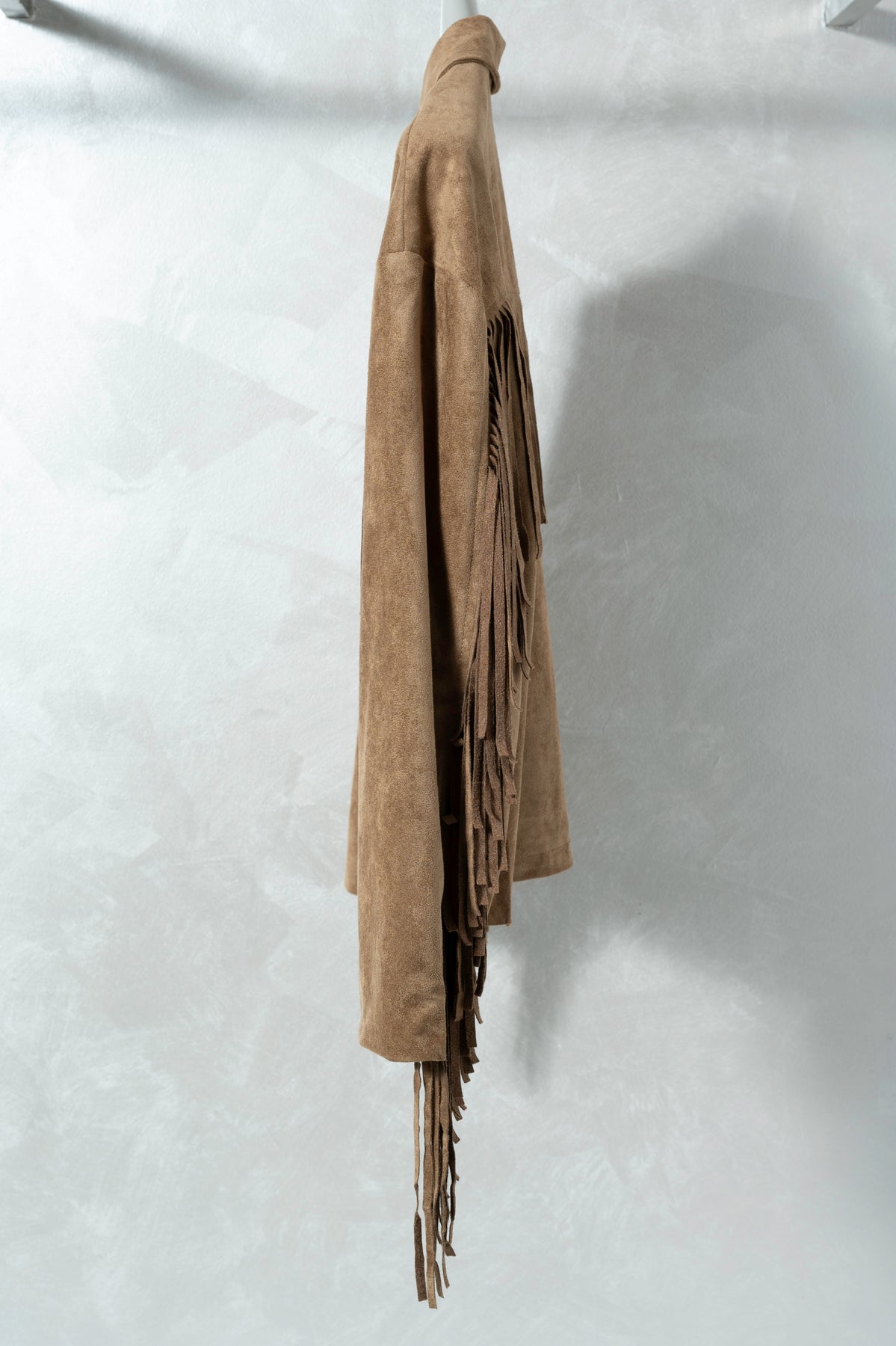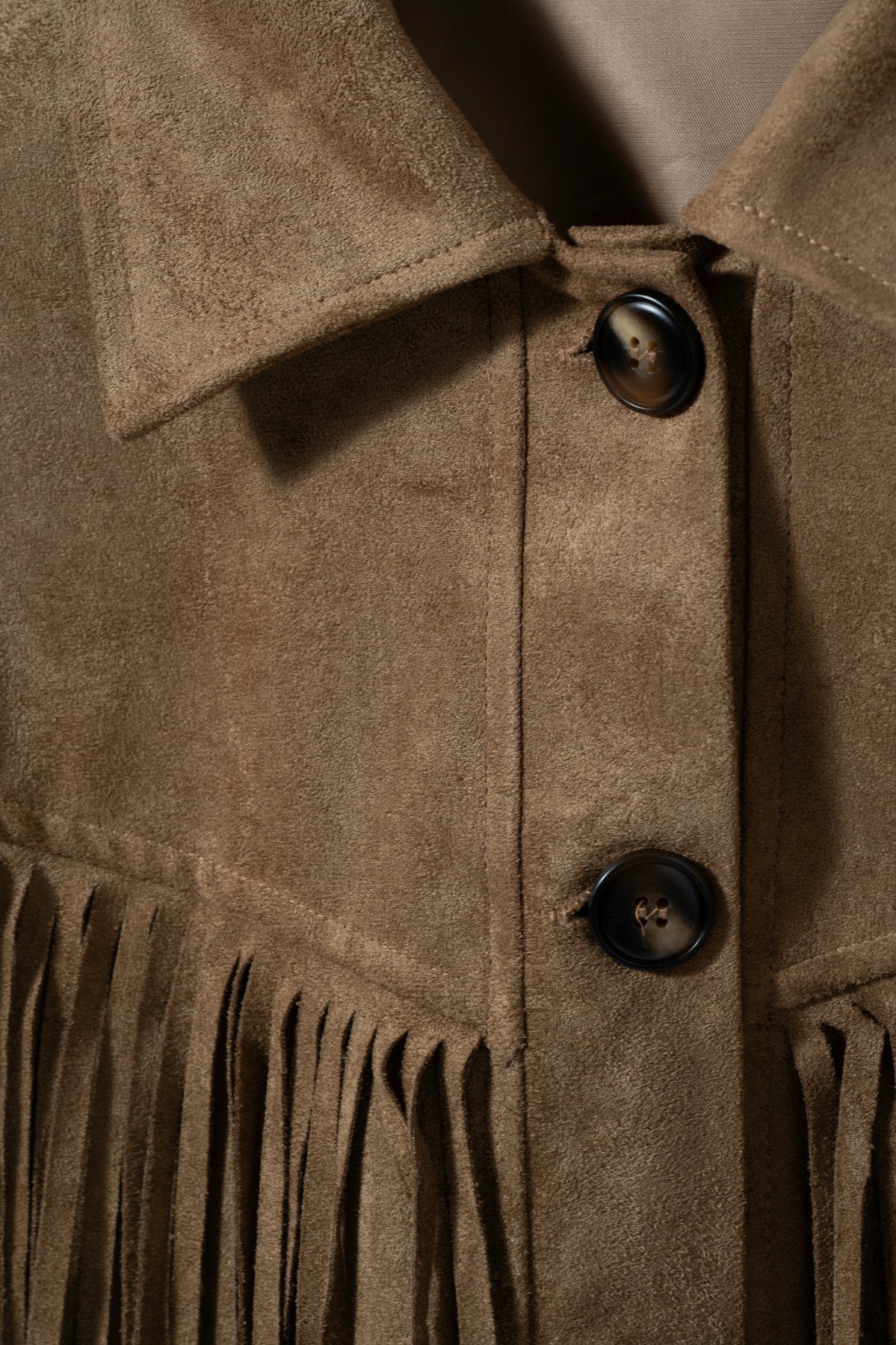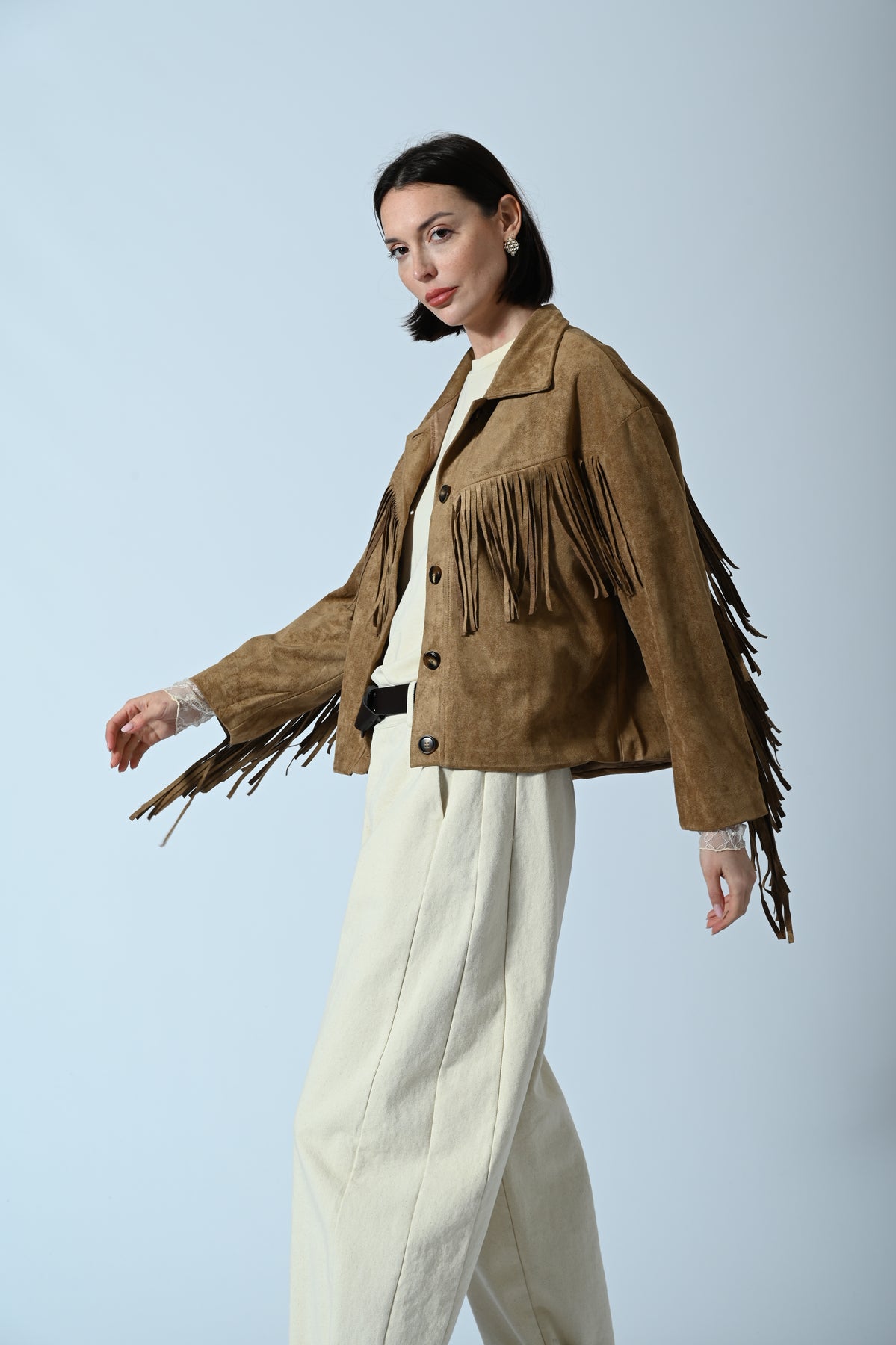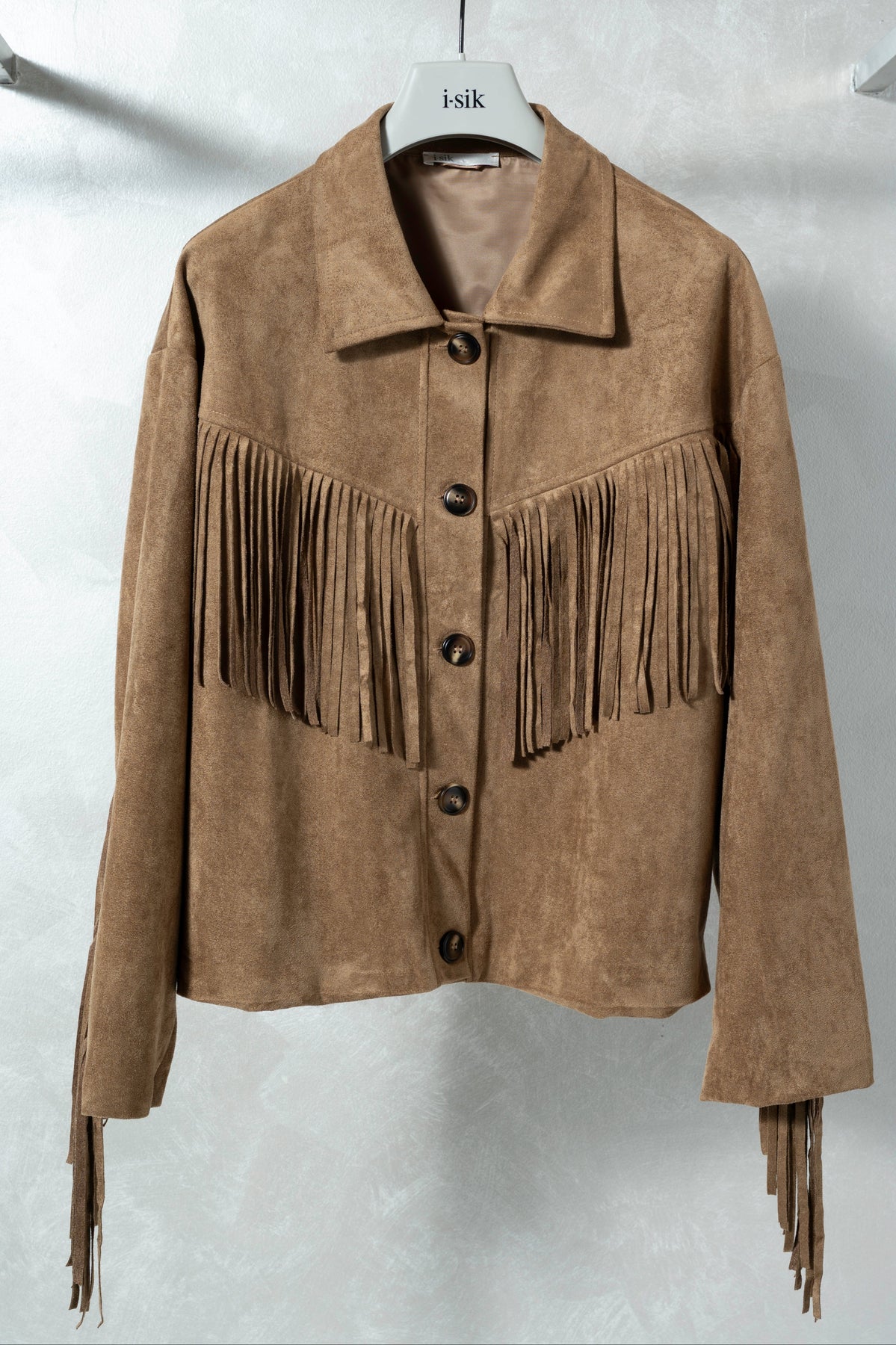 Caban monopetto in camoscio, impreziosito da frange sulla parte frontale che donano movimento e personalità al capo. Dal fascino contemporaneo con richiami boho-chic, è perfetto per completare look ricercati e di carattere.