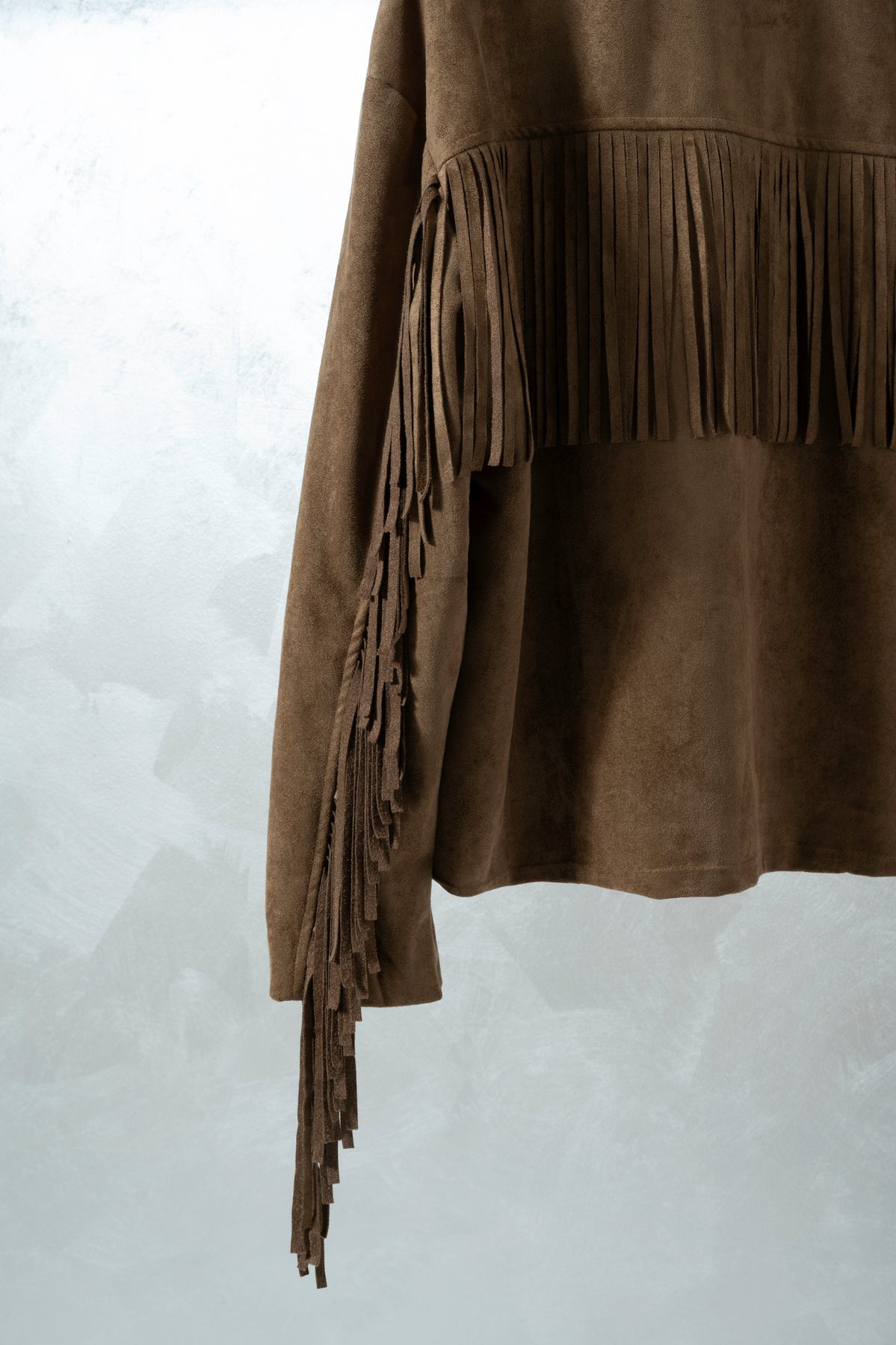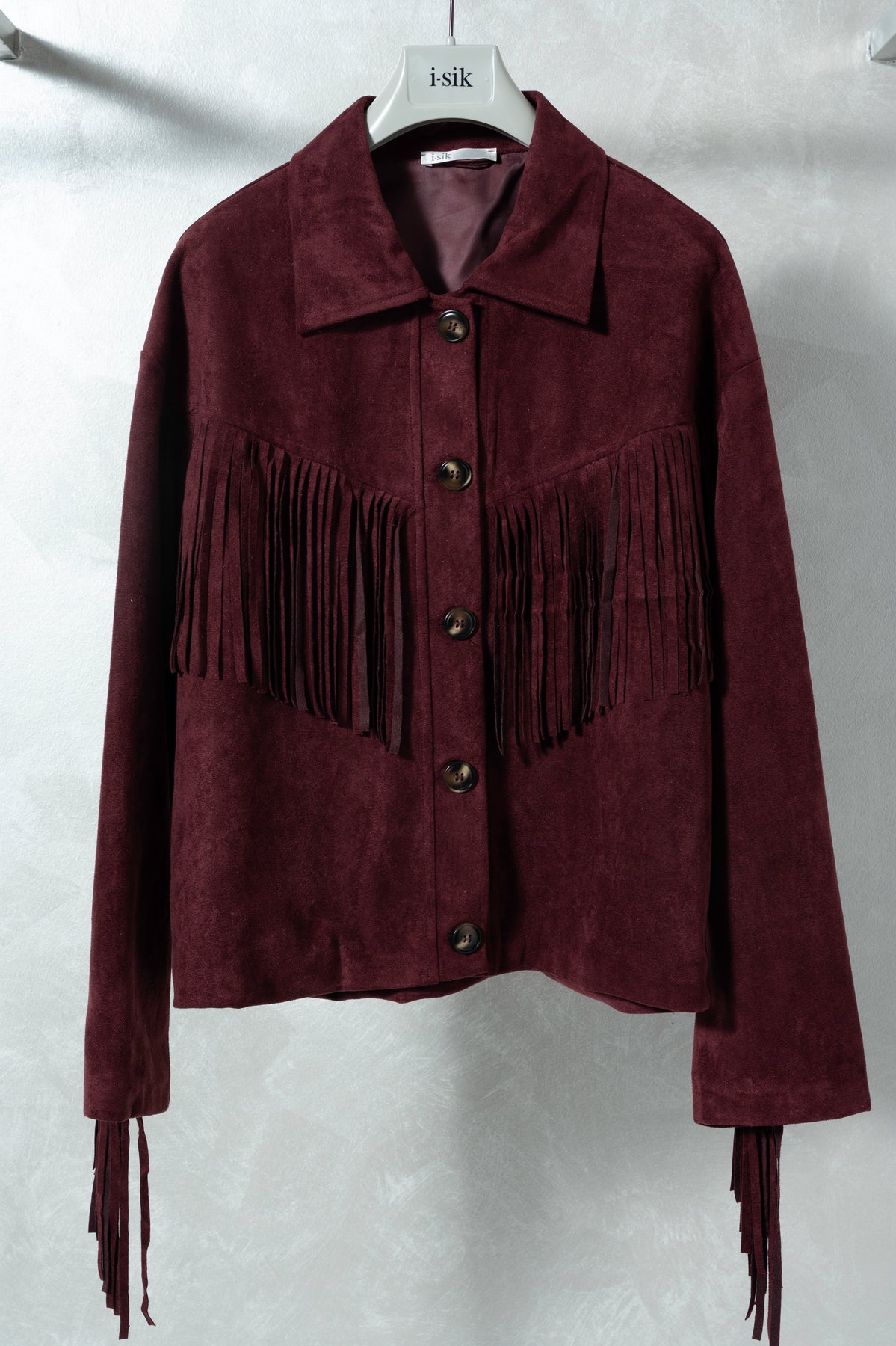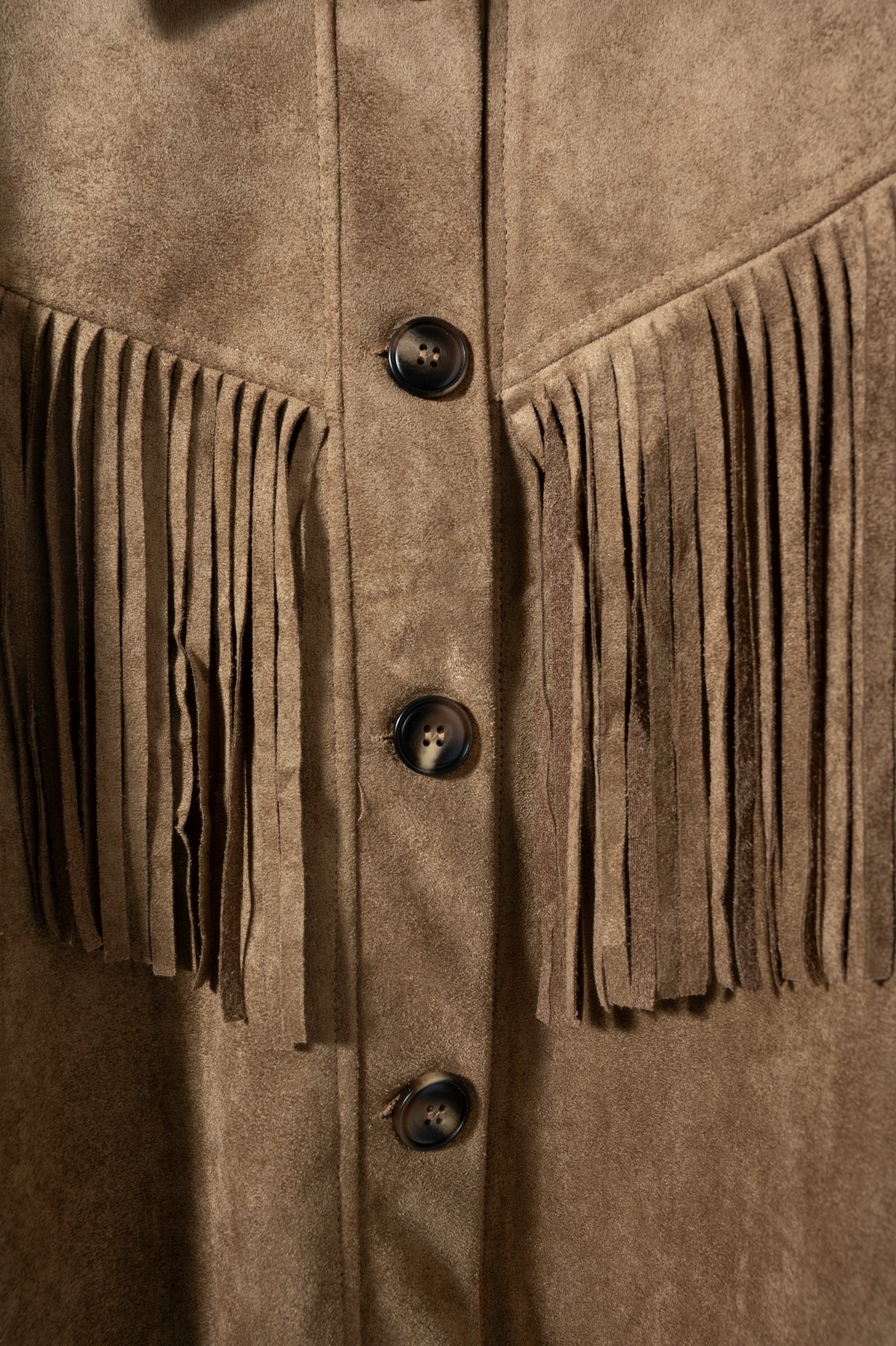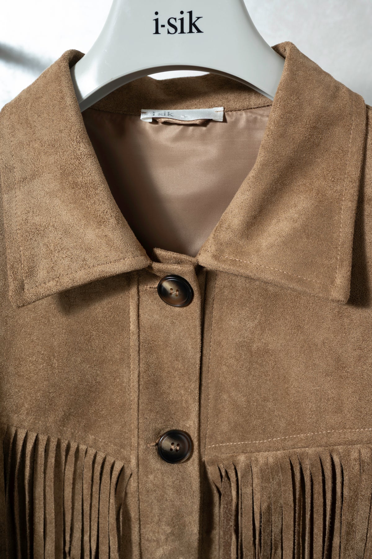 Caban monopetto in camoscio, impreziosito da frange sulla parte frontale che donano movimento e personalità al capo. Dal fascino contemporaneo con richiami boho-chic, è perfetto per completare look ricercati e di carattere.