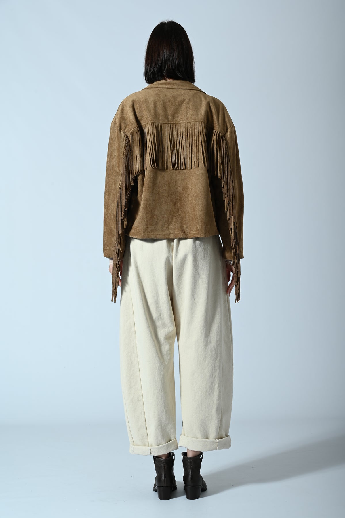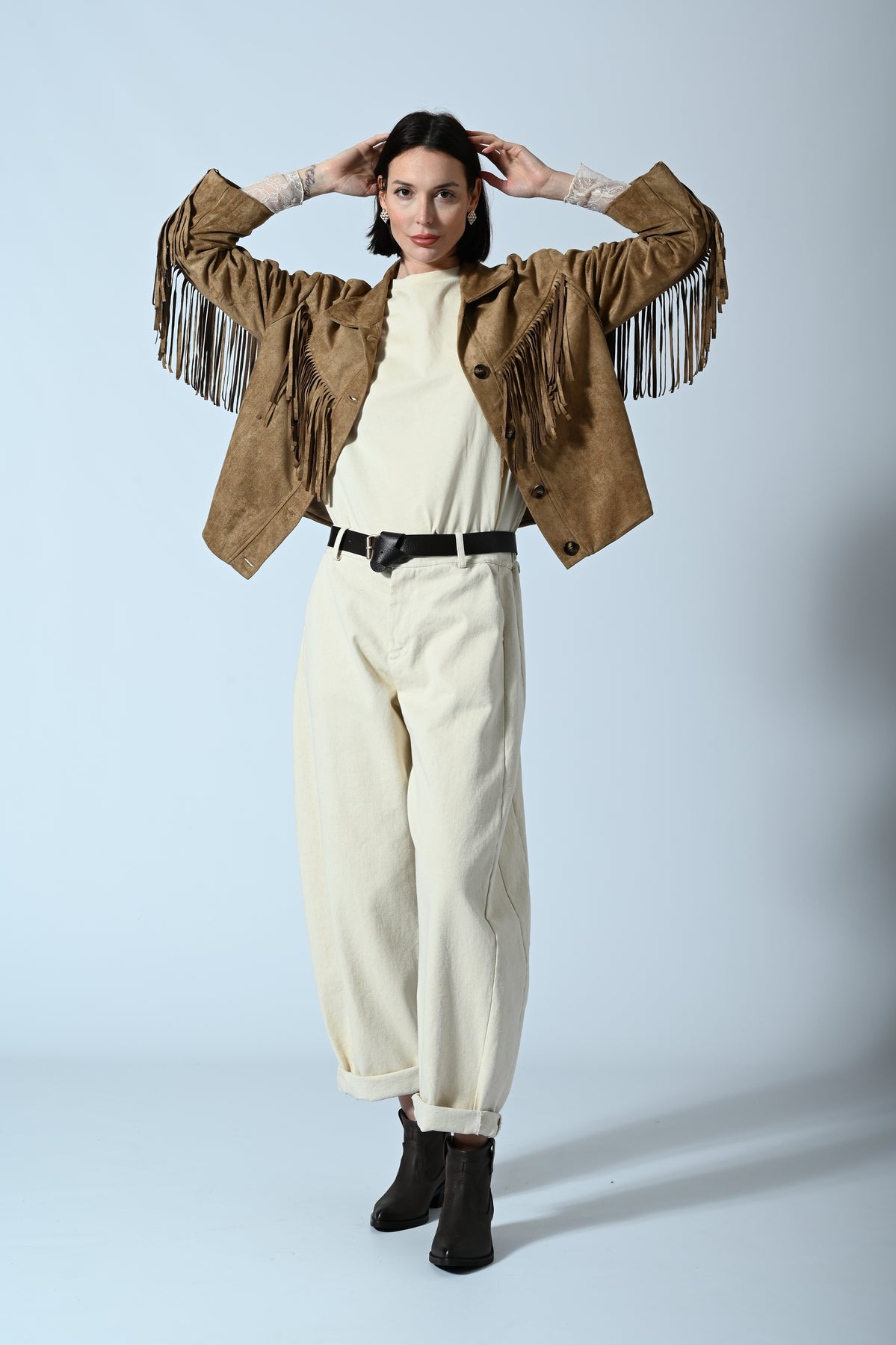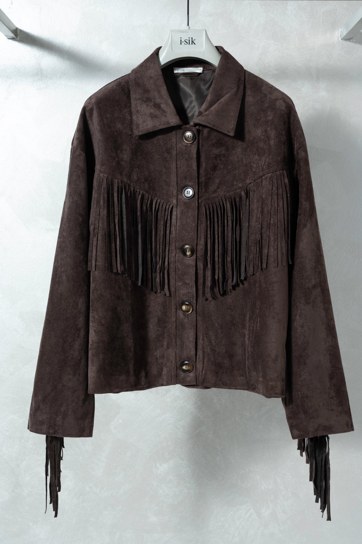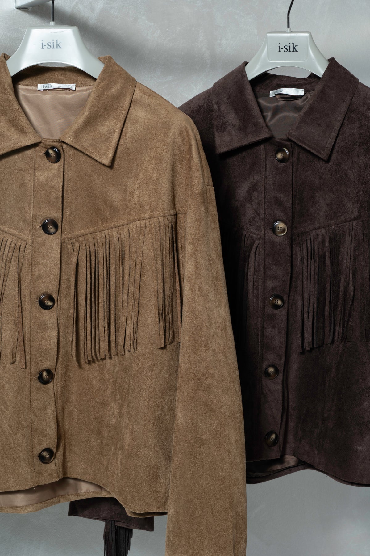 Caban monopetto in camoscio, impreziosito da frange sulla parte frontale che donano movimento e personalità al capo. Dal fascino contemporaneo con richiami boho-chic, è perfetto per completare look ricercati e di carattere.