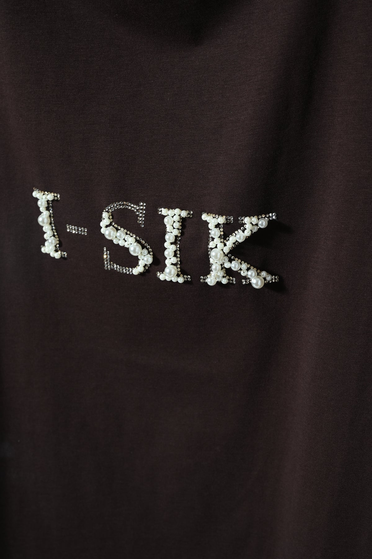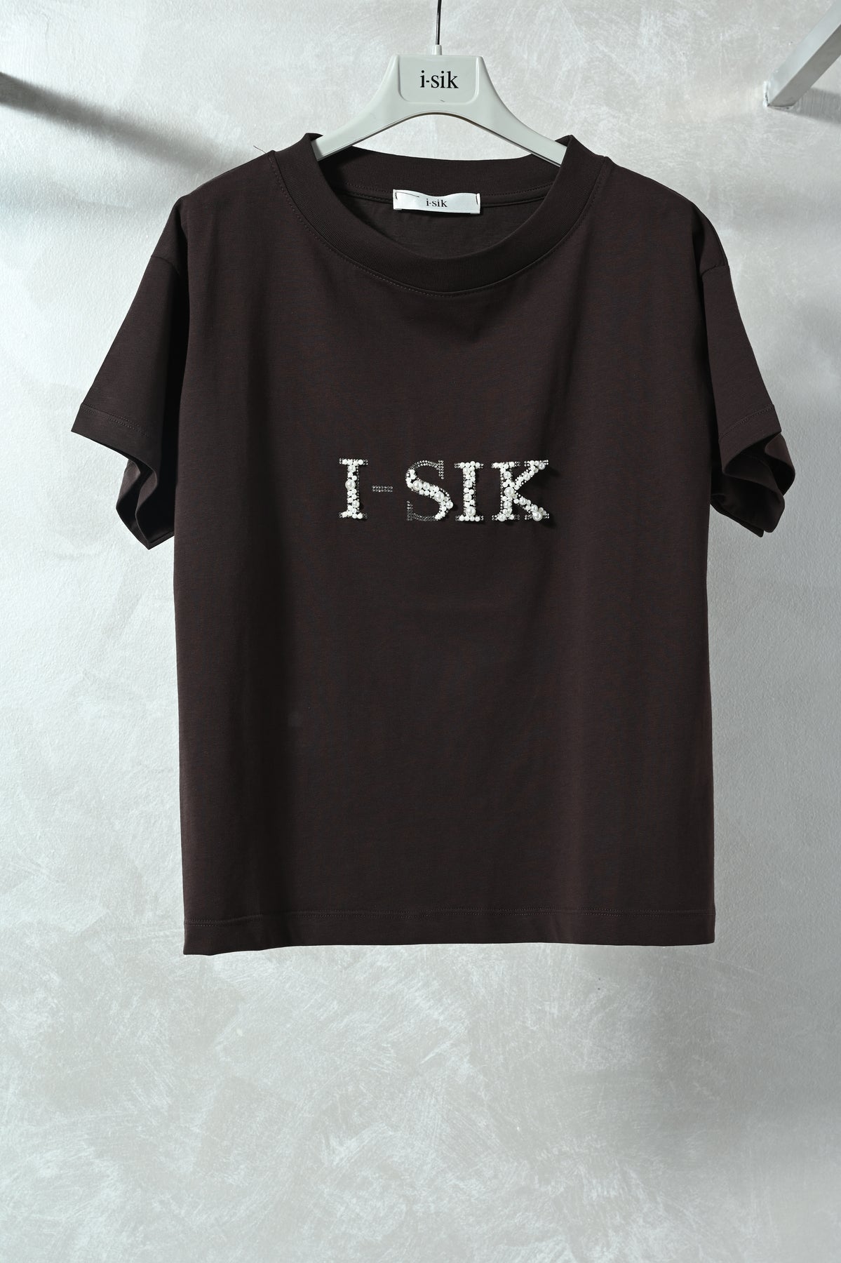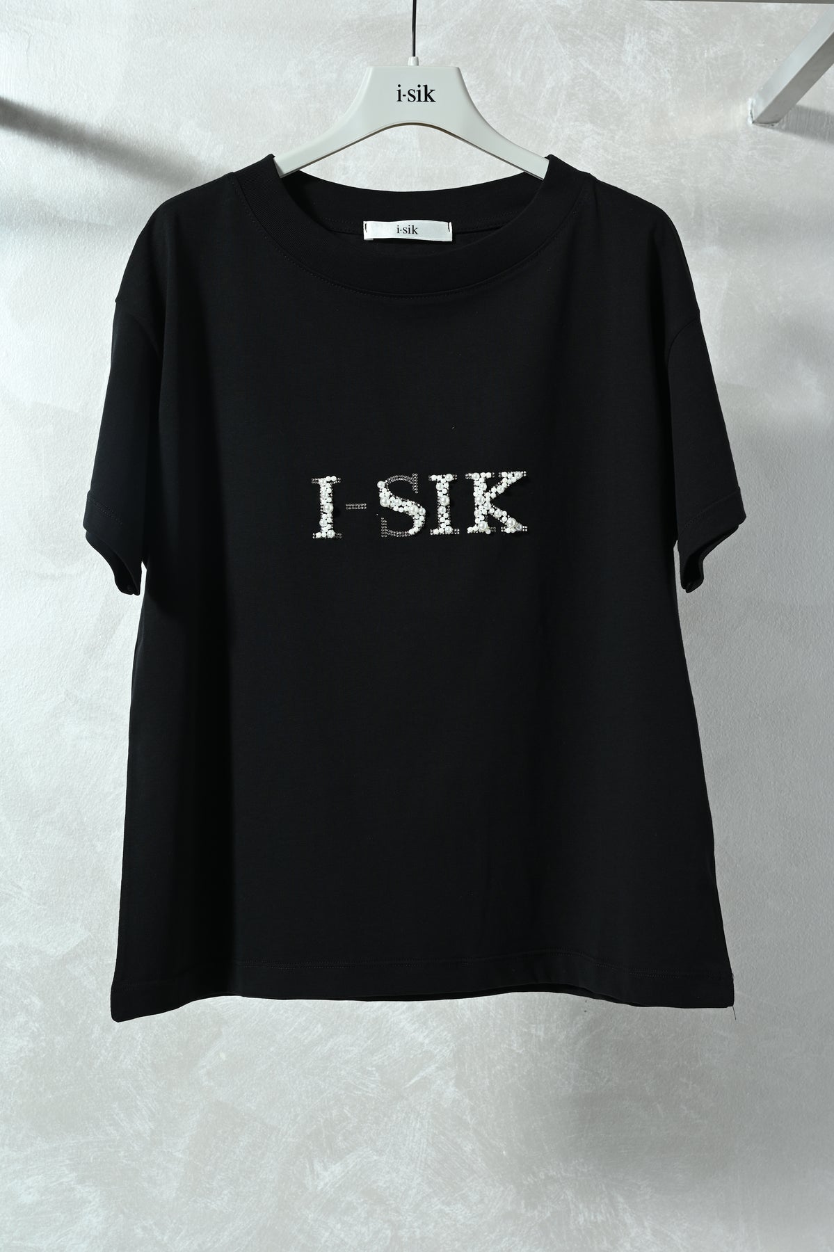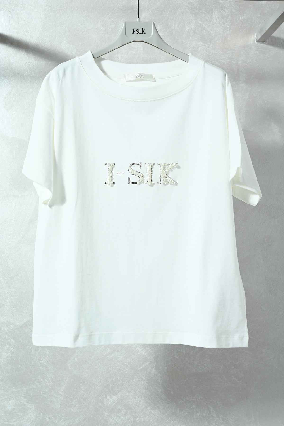 T-shirt fit over dal design moderno, impreziosita dal logo i-sik realizzato con perle e diamantini. Confortevole e femminile, è perfetta per aggiungere un tocco luminoso ai look casual e contemporanei.